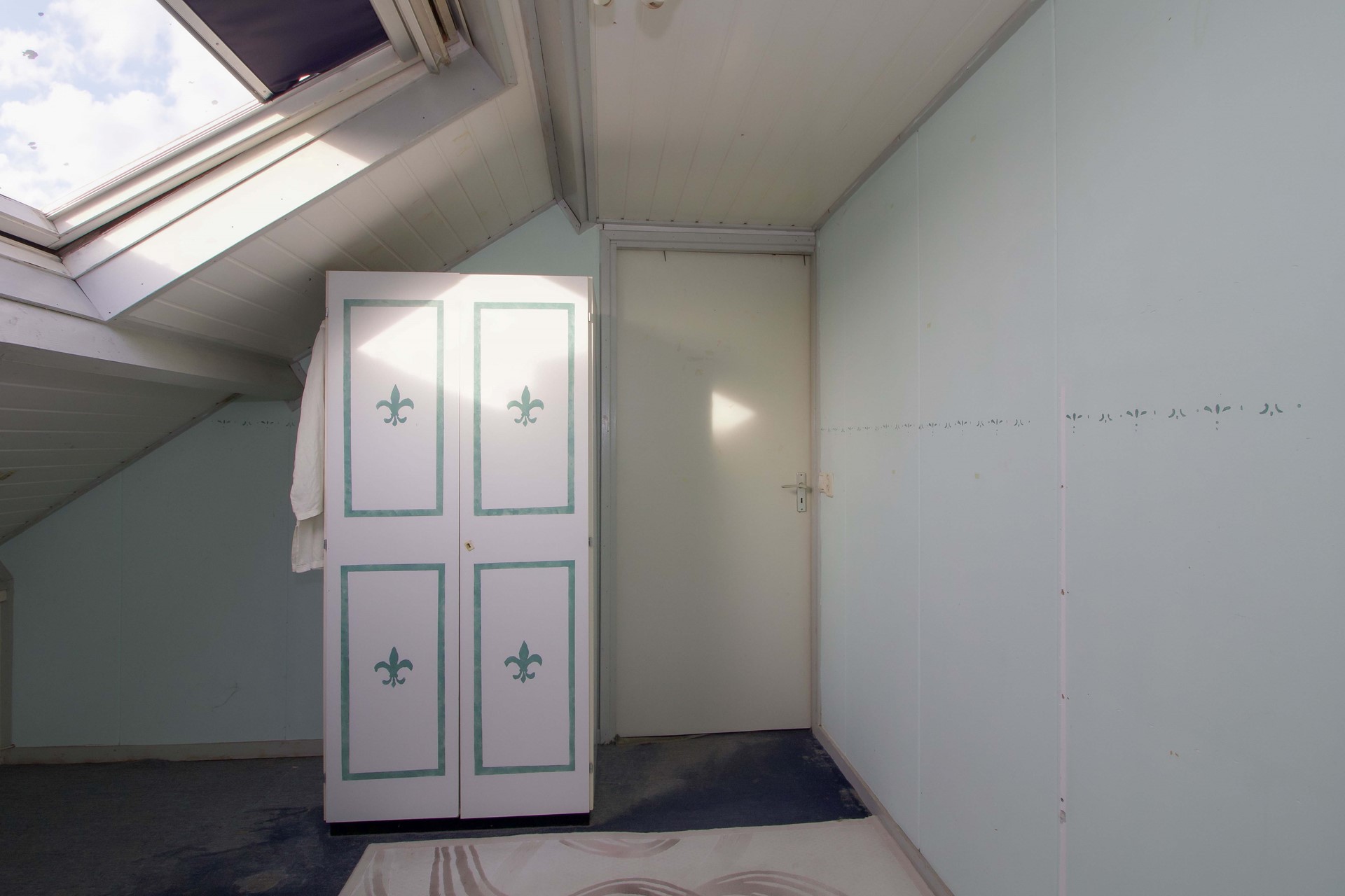 Via een vaste trap kom je op de zolderverdieping, die verrassend veel ruimte en mogelijkheden biedt. De overloop geeft toegang tot twee ruime slaapkamers en handige bergruimtes (VK) aan beide zijden, weggewerkt onder de schuine dakdelen.