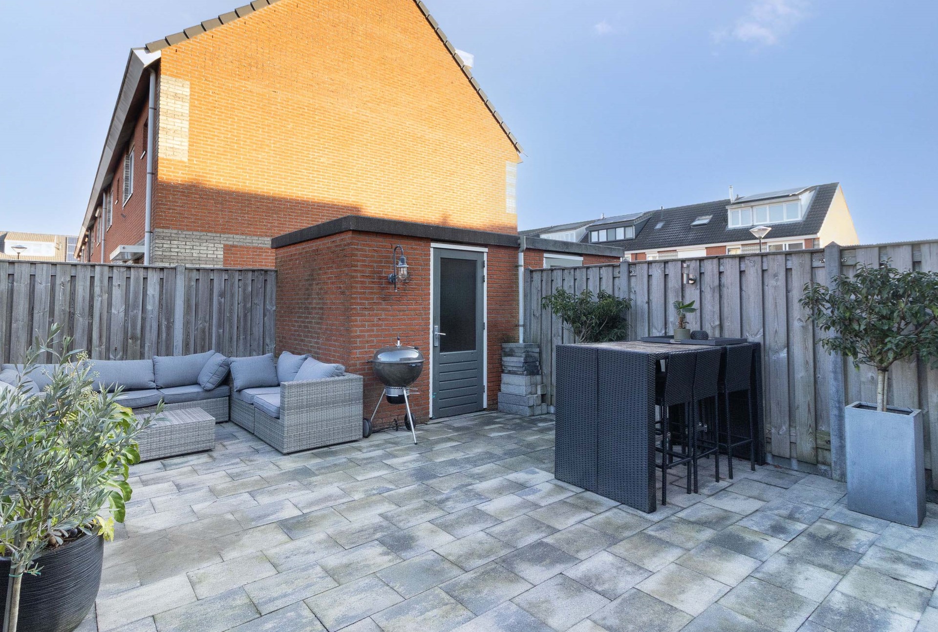 De fraai aangelegde achtertuin is gelegen op het noorden en biedt een verrassend prettige buitenruimte. De tuin is grotendeels bestraat en daardoor onderhoudsvriendelijk, met voldoende ruimte voor zowel een comfortabele loungehoek als een eettafel. Door de open ligging en de breedte van de tuin is er gedurende de dag zowel zon als schaduw aanwezig, wat het een fijne plek maakt om op elk moment van de dag buiten te zitten. Achterin de tuin bevindt zich een praktische berging met elektra, ideaal voor het stallen van fietsen en tuingereedschap. De tuin is volledig omsloten en biedt veel privacy.