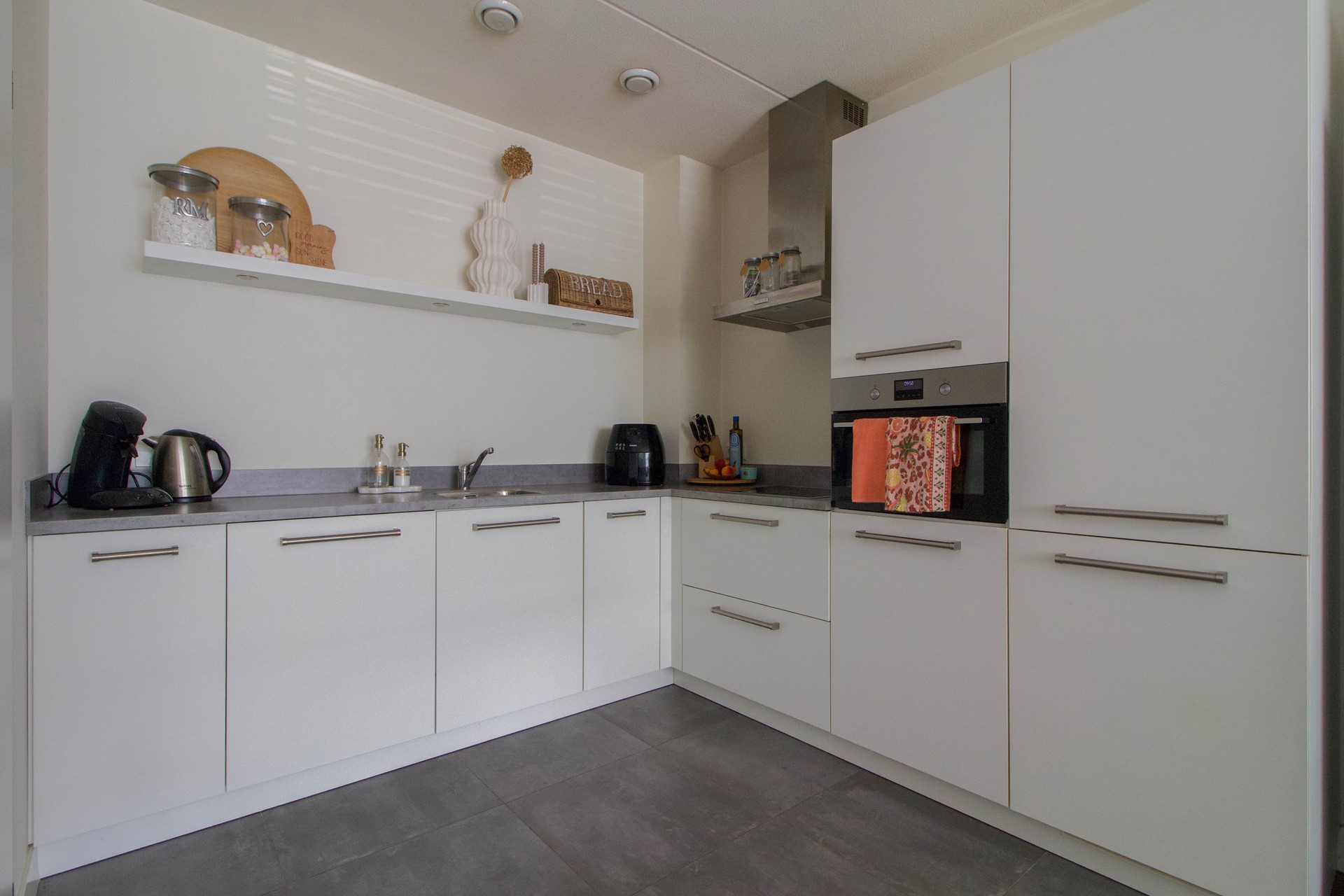 De woonkamer is licht en ruim, met een mooie tegelvloer voorzien van vloerverwarming die zorgt voor comfort in elk seizoen. De open keuken ligt aan de achterzijde. Alles is keurig afgewerkt, precies zoals je het verwacht van een jonge woning.