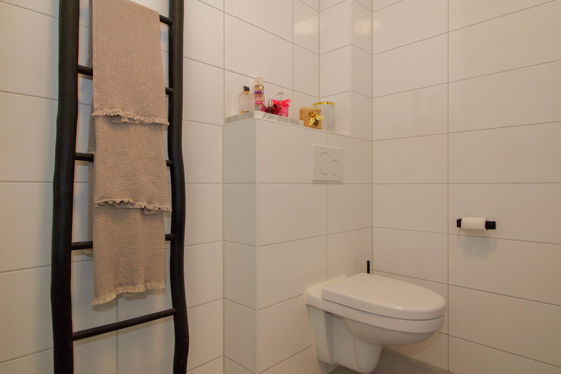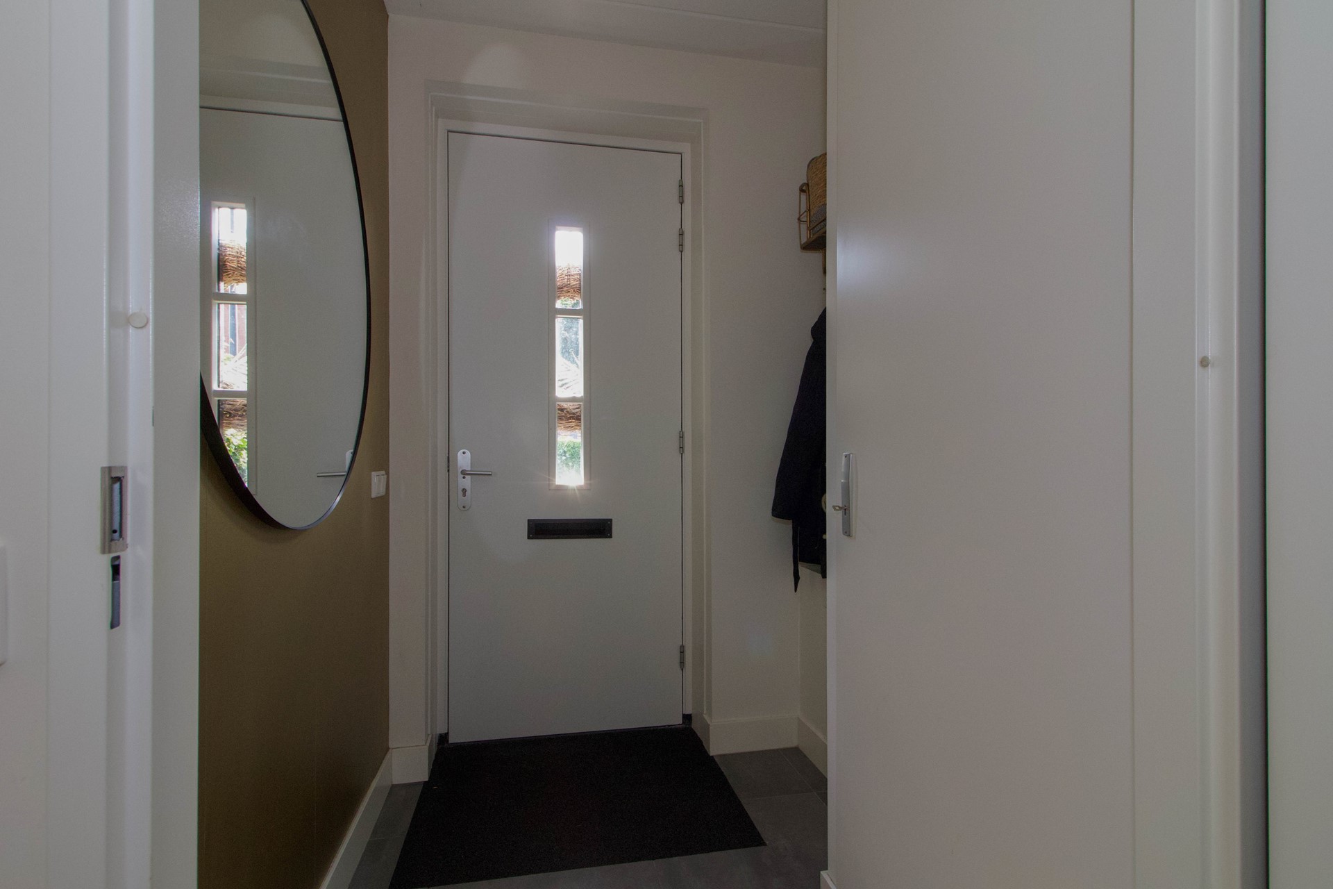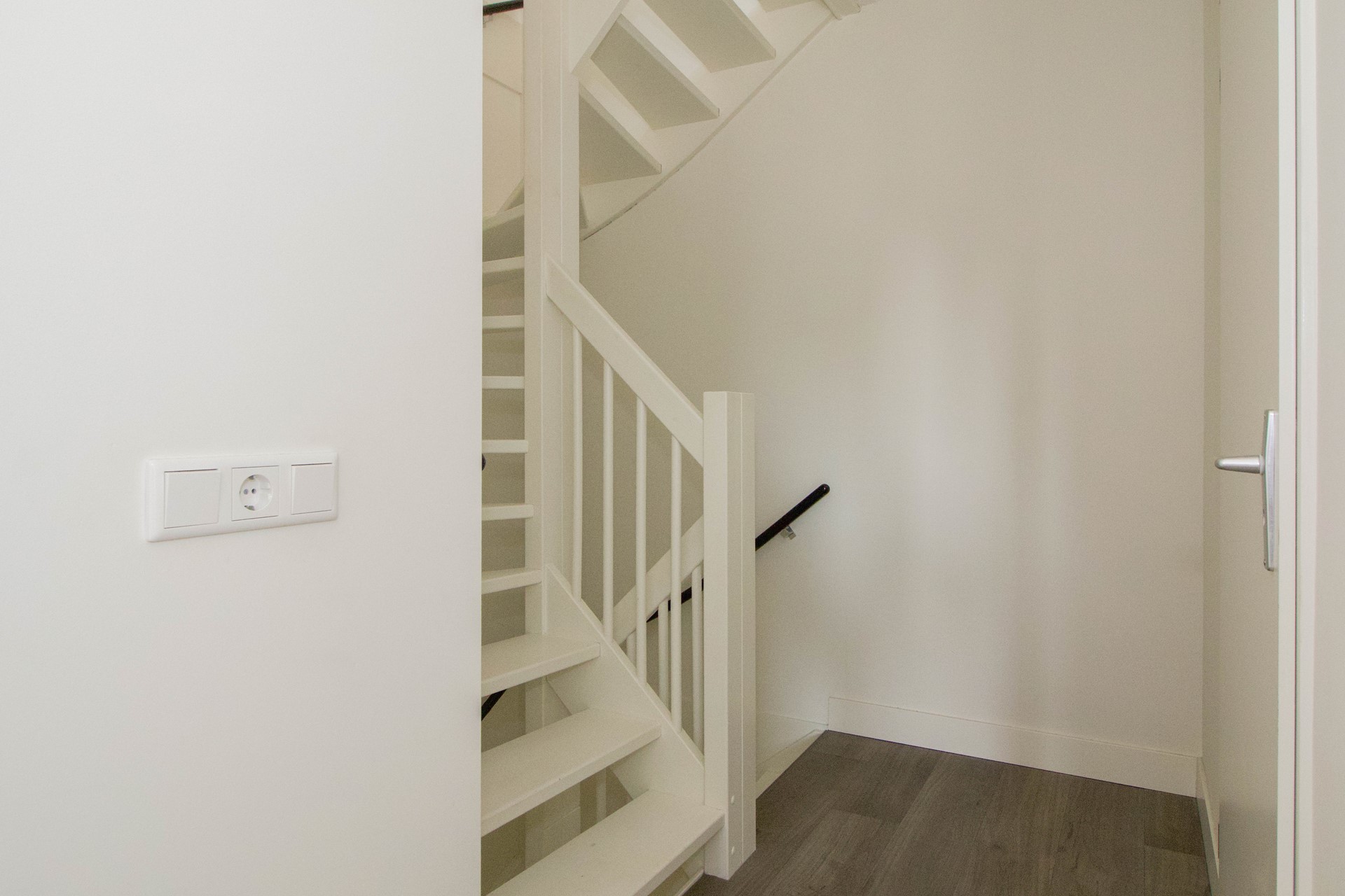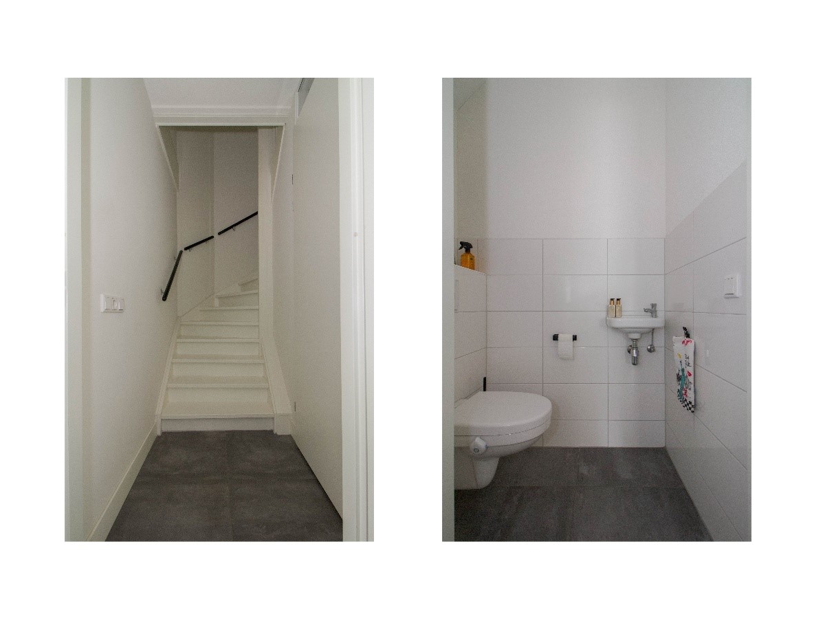 Aansluitend aan de keuken bevindt zich een tweede hal, waar de trapopgang naar de eerste verdieping en het toilet met fontein zijn gesitueerd. Deze hal zorgt voor een praktische verbinding tussen de leefruimte en de overige functies van de woning, zonder dat het de open indeling verstoort.