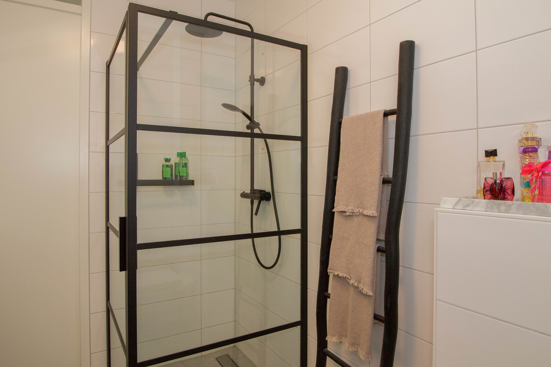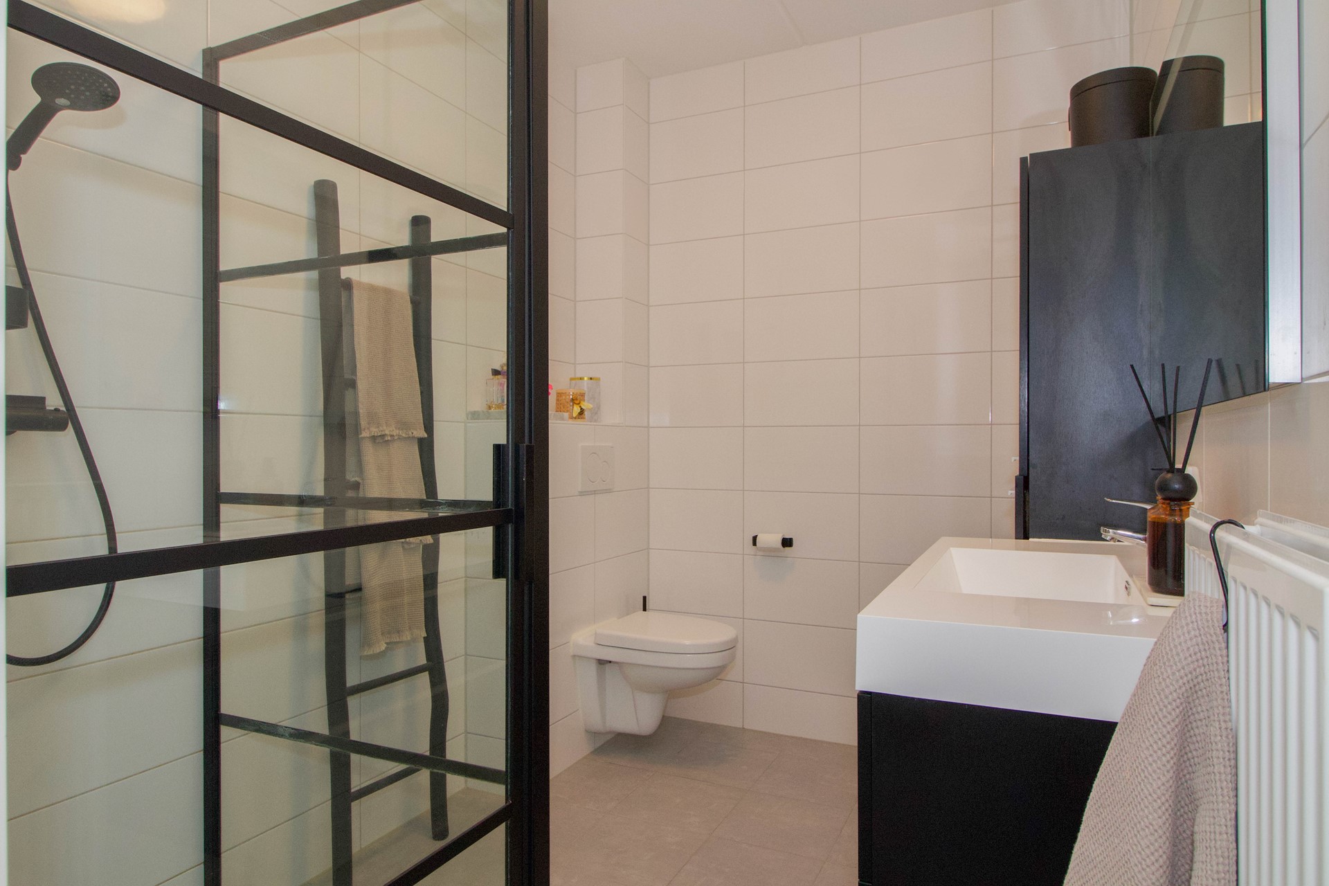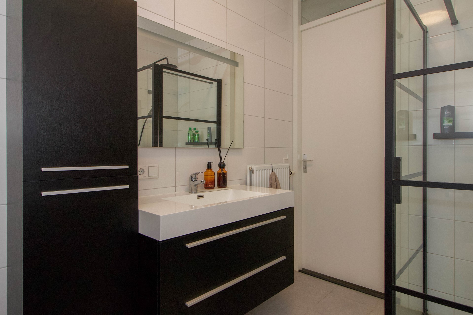 De badkamer is modern en volledig betegeld, voorzien van een inloopdouche, een toilet en een wastafelmeubel. Hoewel er geen raam aanwezig is, zorgt het mechanische ventilatiesysteem voor een goed binnenklimaat.