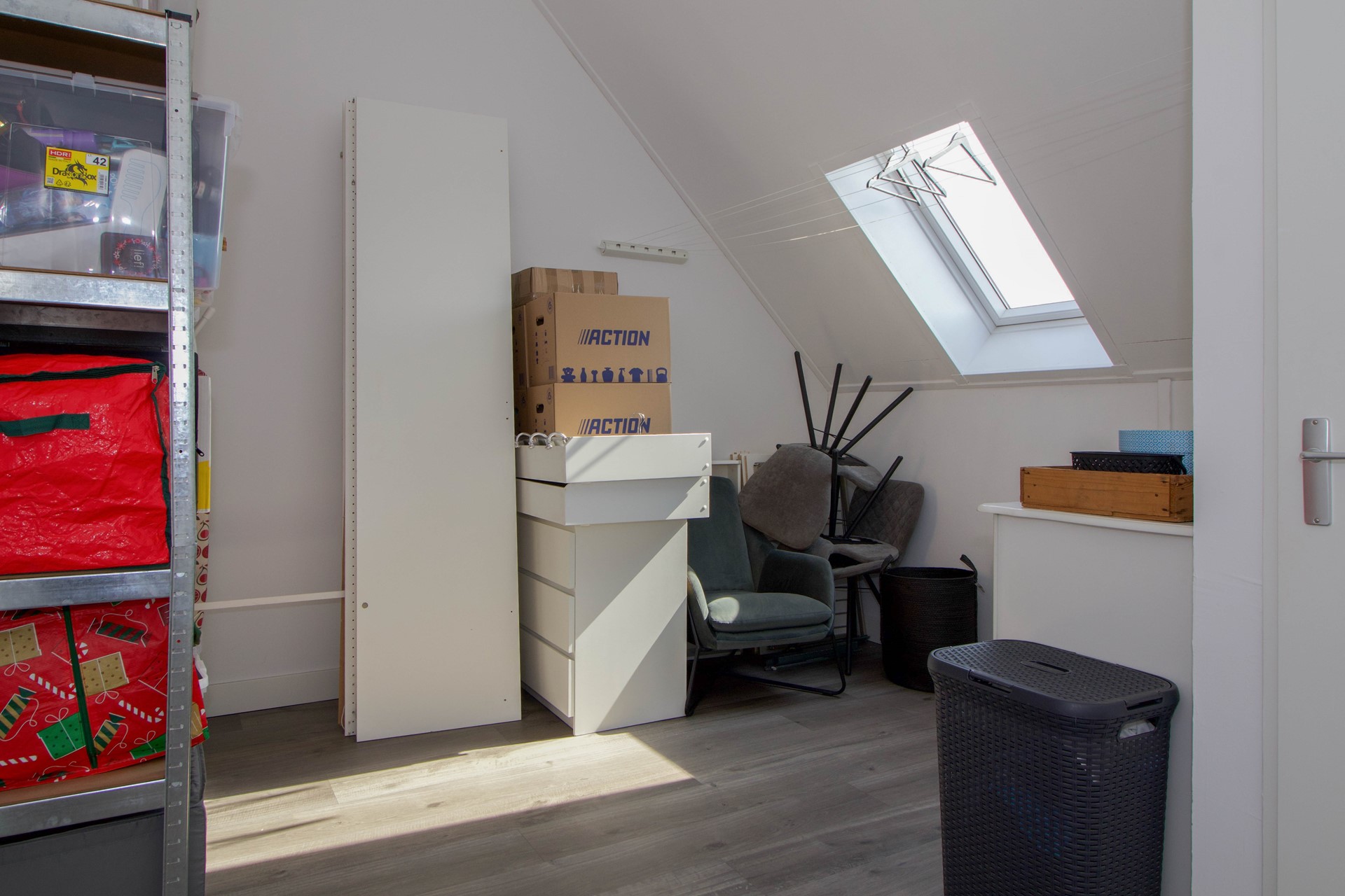 Via een vaste trap bereik je de zolderverdieping. Deze royale ruimte is momenteel in gebruik als zolderkamer en biedt volop mogelijkheden voor diverse functies — denk aan een extra slaapkamer, werkruimte of hobbykamer. Dankzij de aanwezige dakramen is er voldoende daglicht en voelt de ruimte prettig licht en open aan.