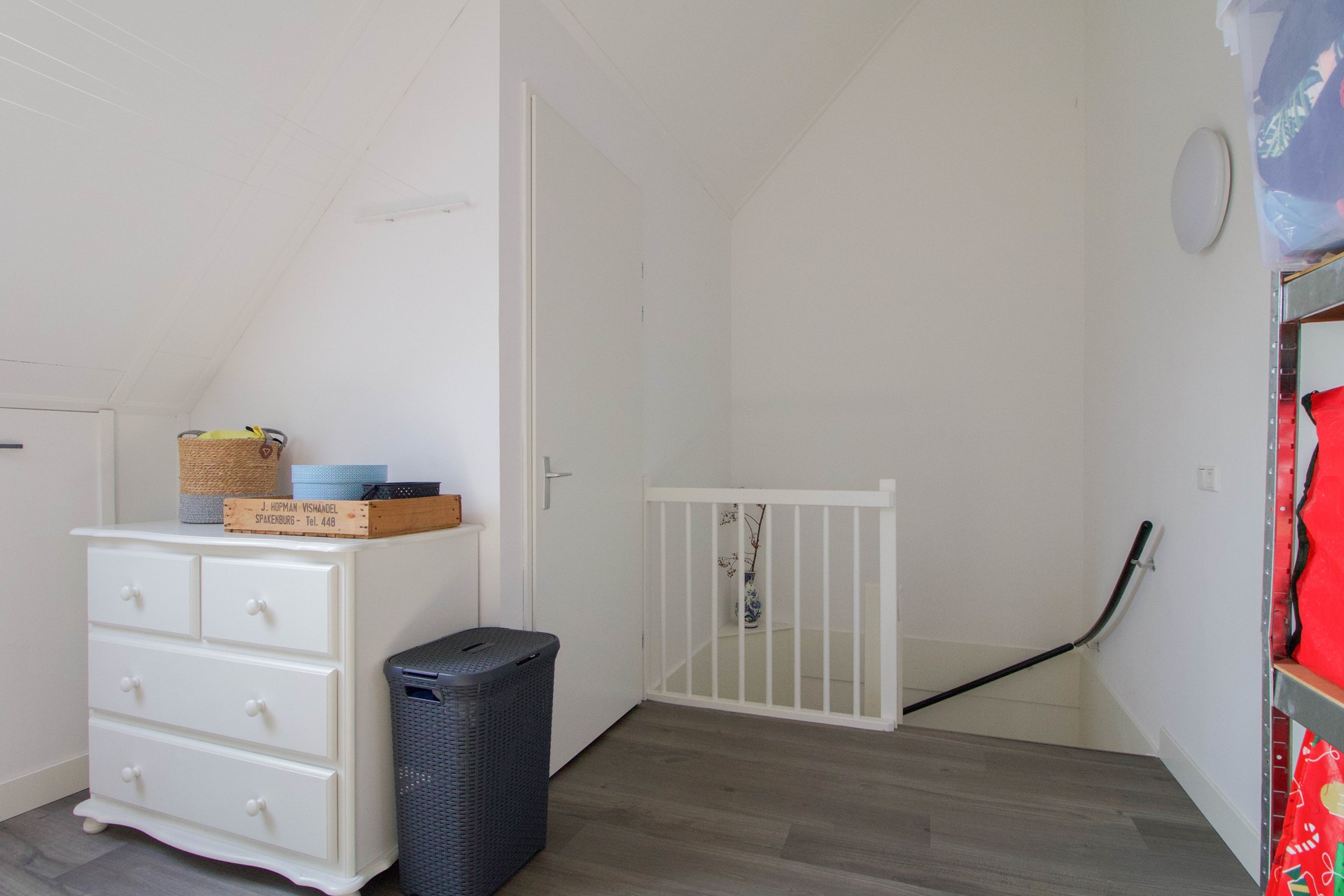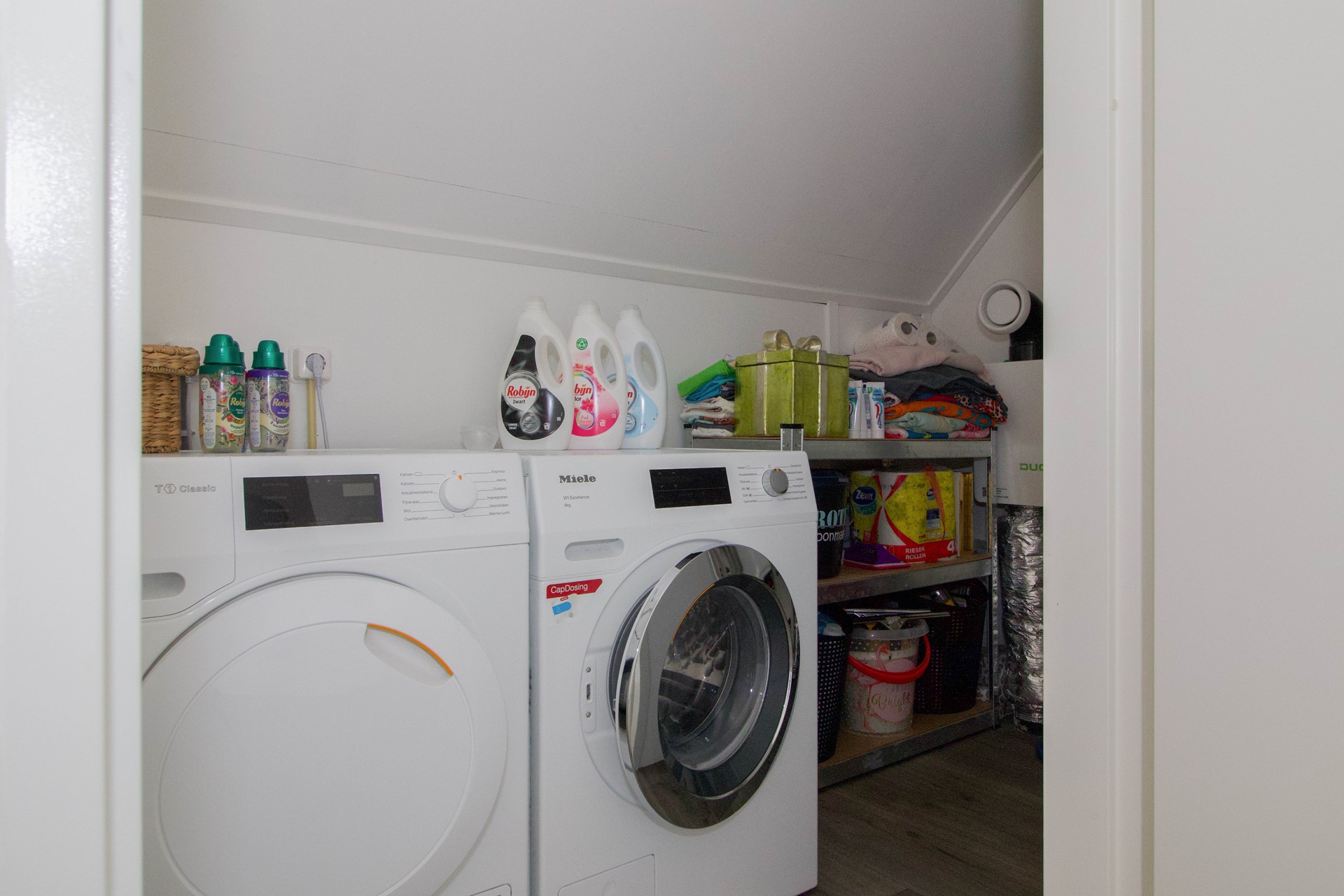 Op deze verdieping bevindt zich tevens een vaste kast (VK) met de cv-installatie en de aansluitingen voor de wasmachine en droger. Er is daarnaast nog extra bergruimte achter de knieschotten, ideaal voor het opbergen van seizoensspullen of koffers.