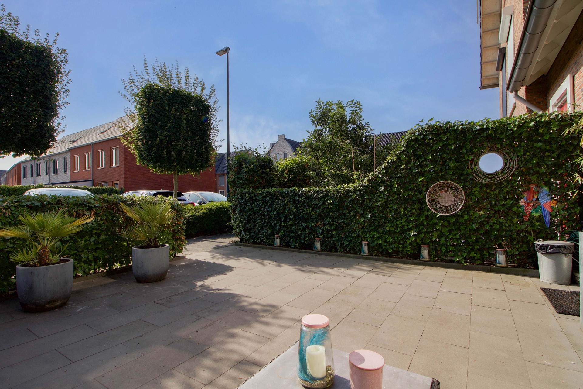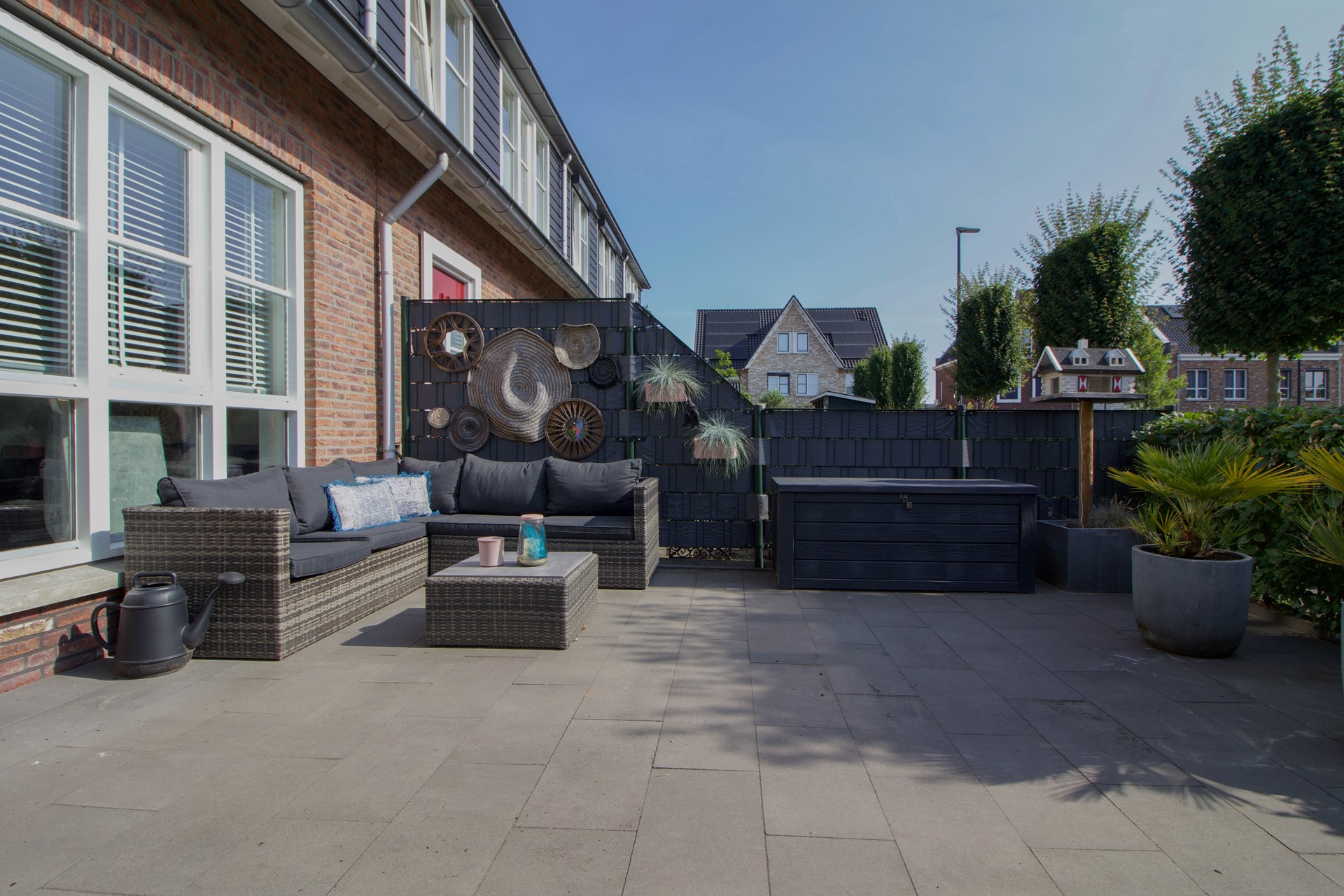 De tuin is grotendeels bestraat en daardoor onderhoudsvriendelijk, met voldoende plek voor een loungeset of eettafel. Groene accenten, zoals de verzorgde hagen en plantenbakken, zorgen voor een prettige, natuurlijke sfeer.