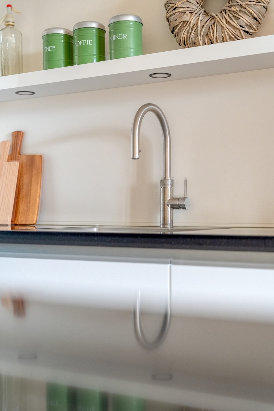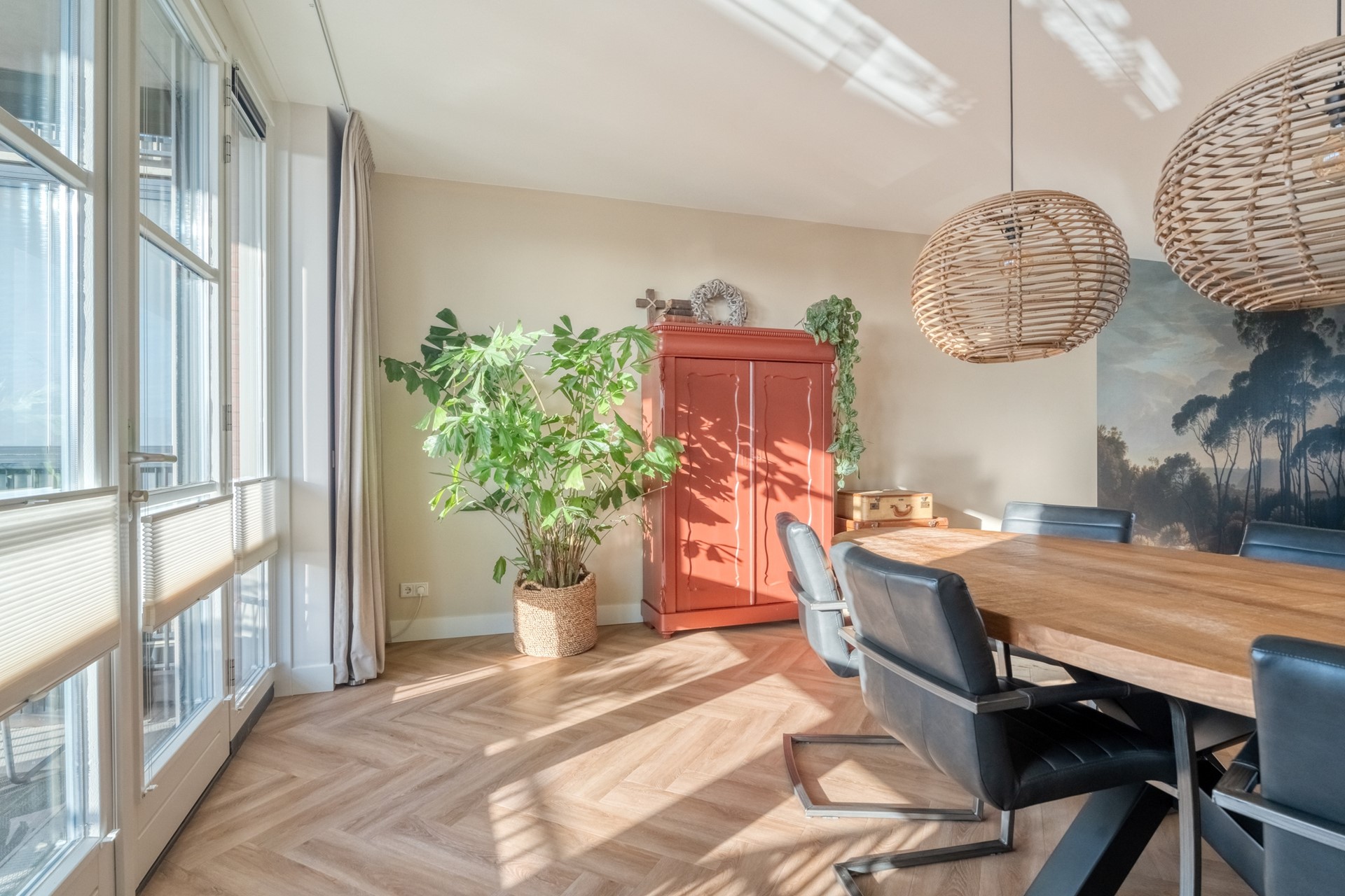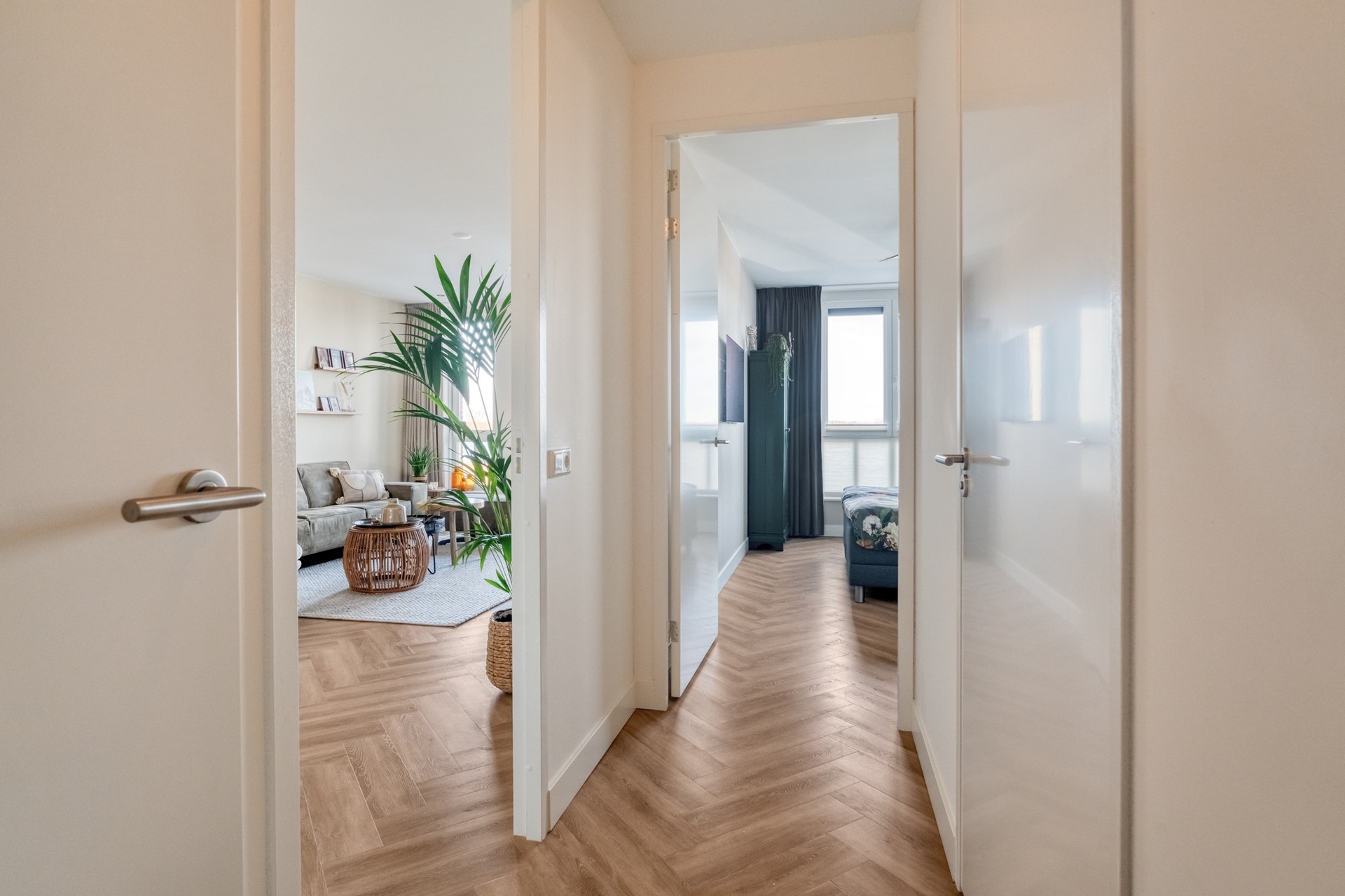 Binnen is de indeling logisch en prettig. De woonruimte loopt over de volledige lengte van het appartement en wordt op natuurlijke wijze verbonden door het kookeiland in het midden. Aan de ene zijde de woonkamer, ruim en ontspannen, aan de andere zijde de eetruimte waar lange diners vanzelf ontstaan. Alles klopt hier. De hoogwaardige afwerking met een PVC visgraatvloer door de hele woning en strak afgewerkte plafonds geeft het appartement een rustige, luxe uitstraling.