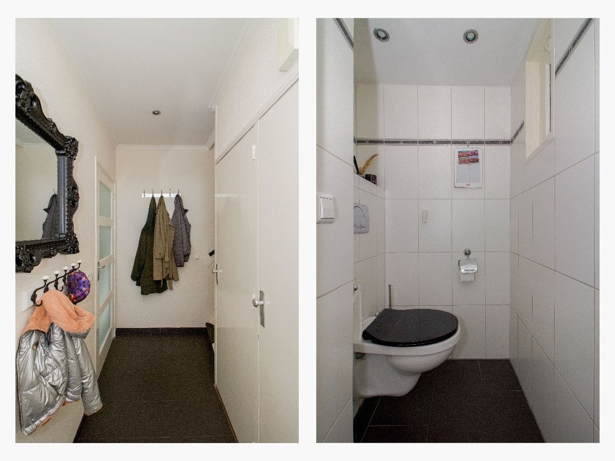 Hal met toilet, voorraadkast en toegang tot de woonkamer.