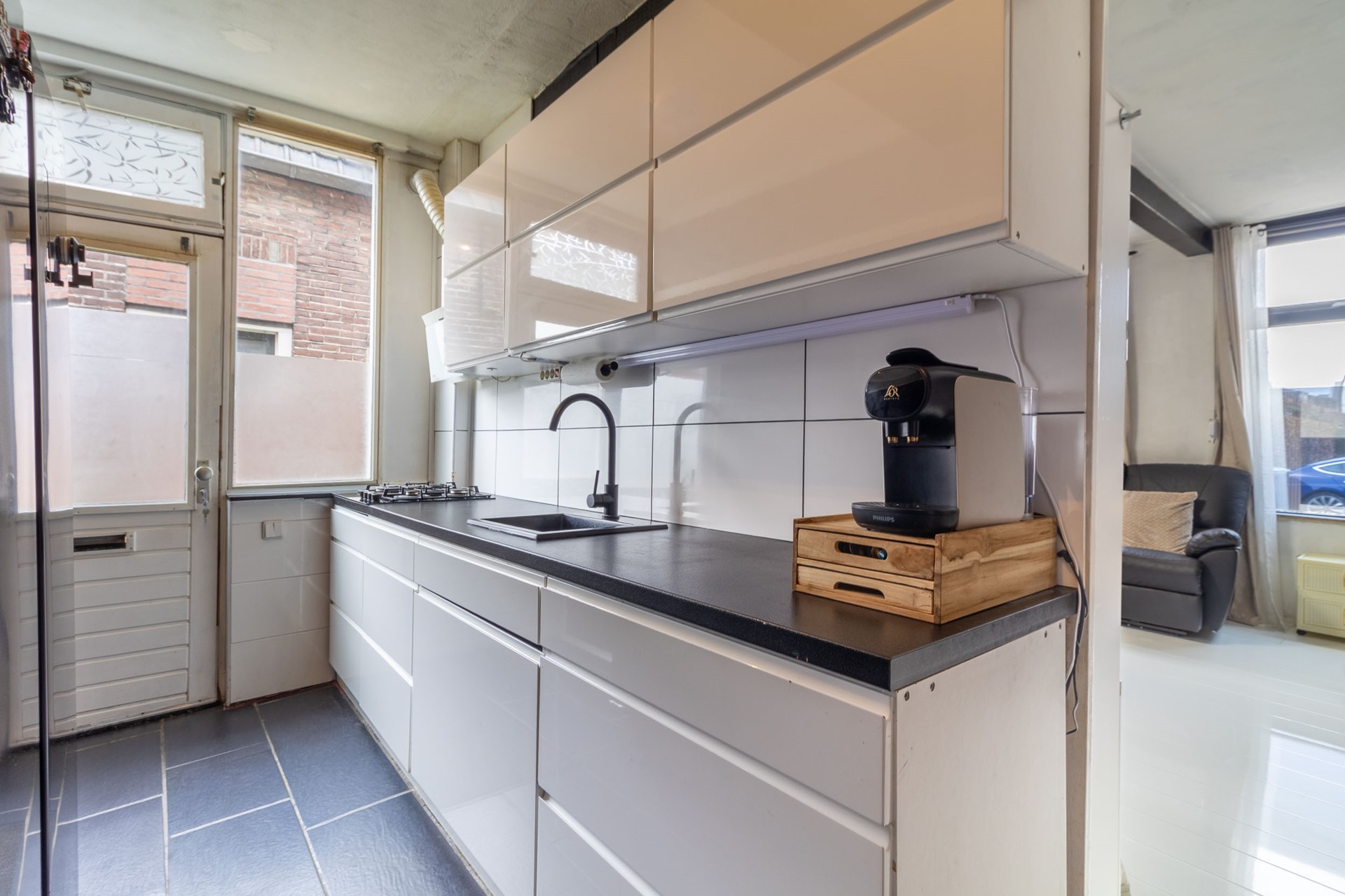 Via de entree komt u binnen in de keuken, die praktisch is ingedeeld met een rechte opstelling. Vanuit de keuken is er toegang tot het toilet en een deur naar de woonkamer. In de woonkamer bevindt zich de trapopgang naar de eerste verdieping. De woonkamer is gelegen aan de voorzijde van de woning en beschikt over grote raampartijen, wat zorgt voor een prettige lichtinval en een ruimtelijk gevoel.