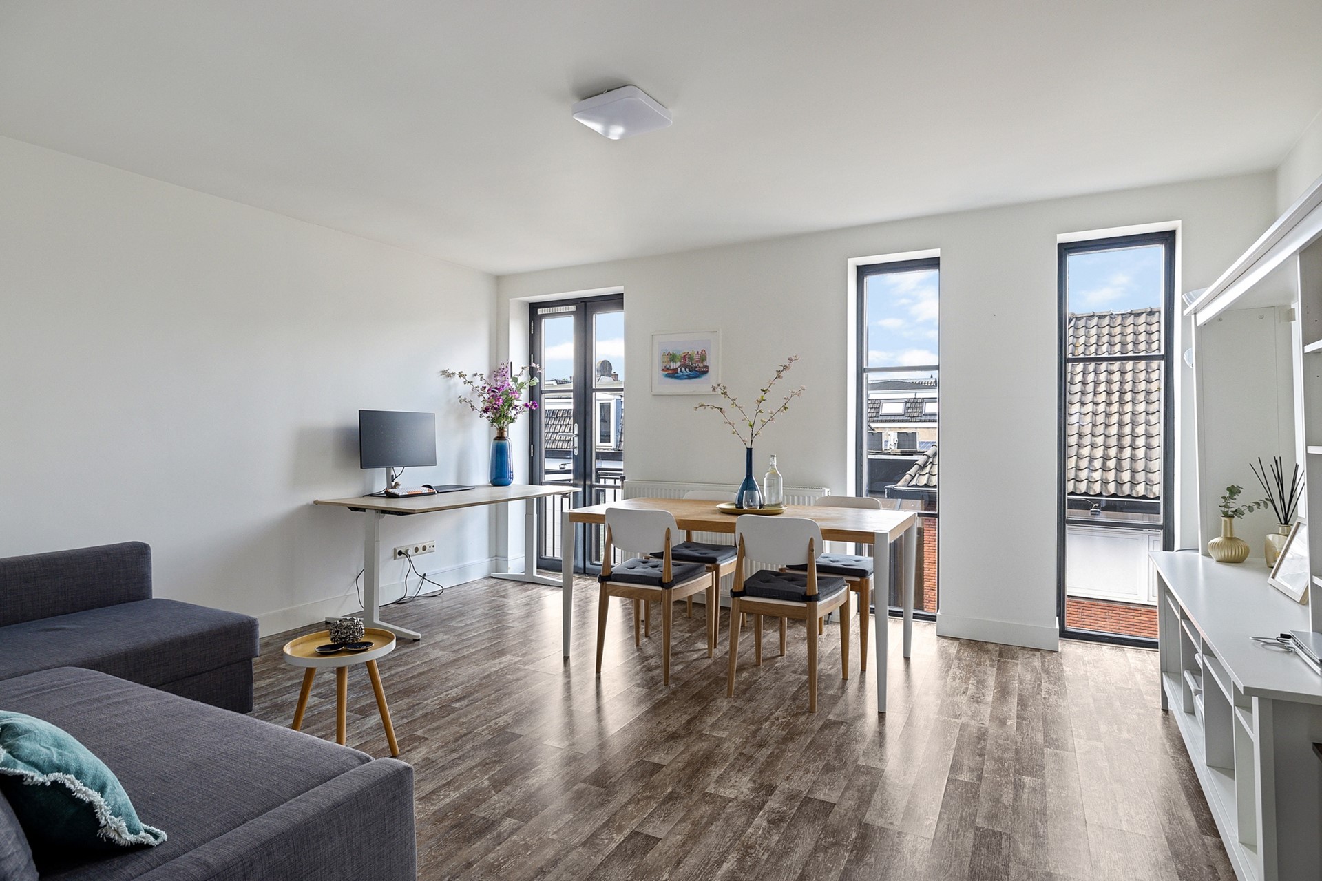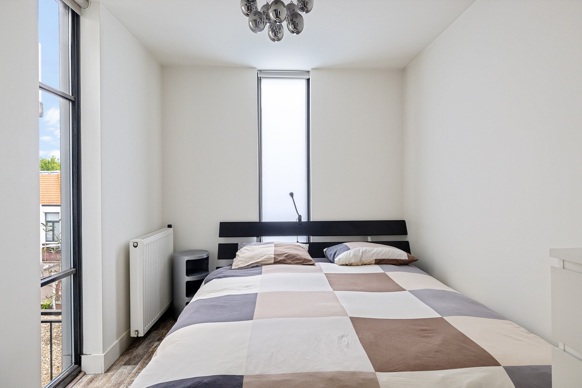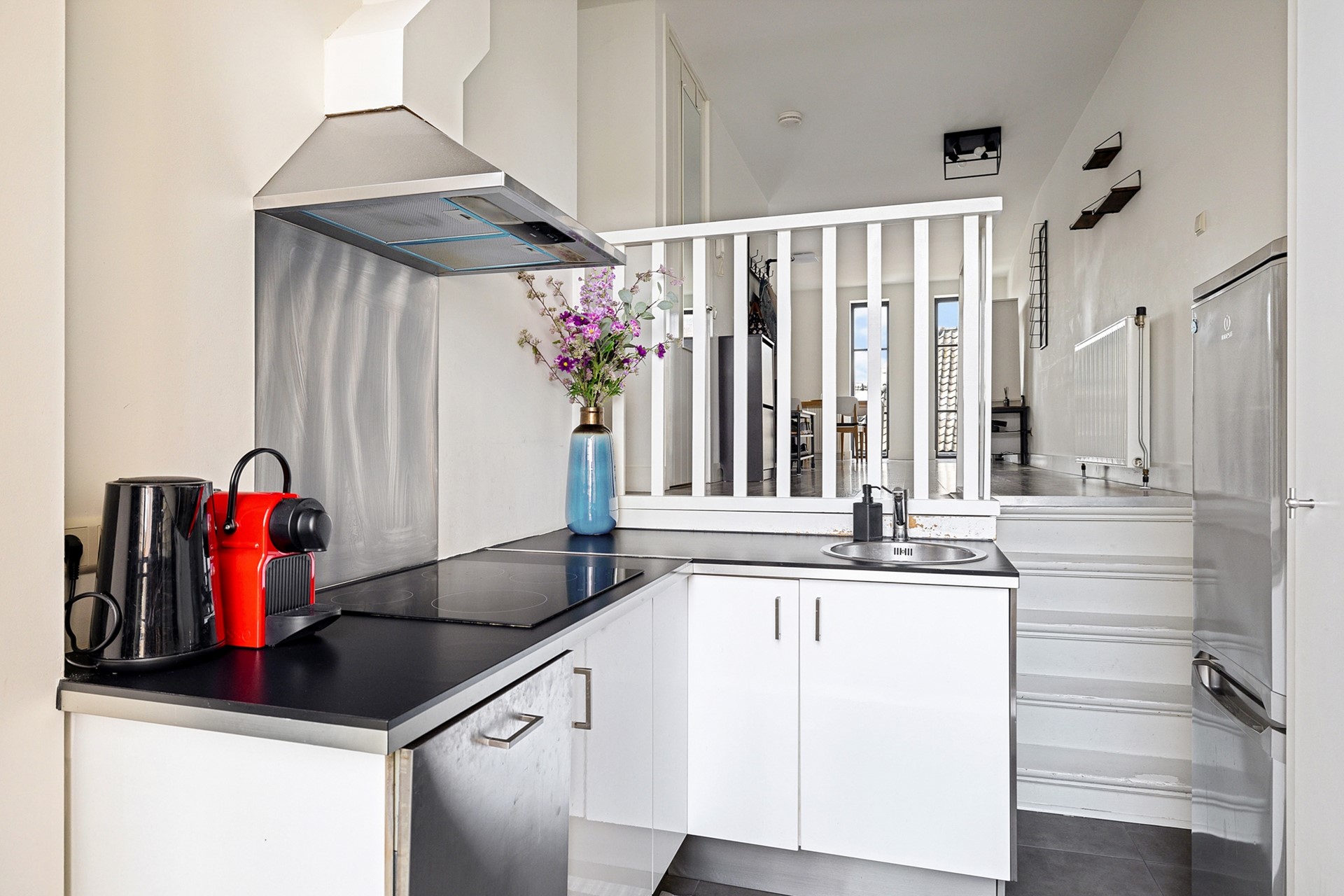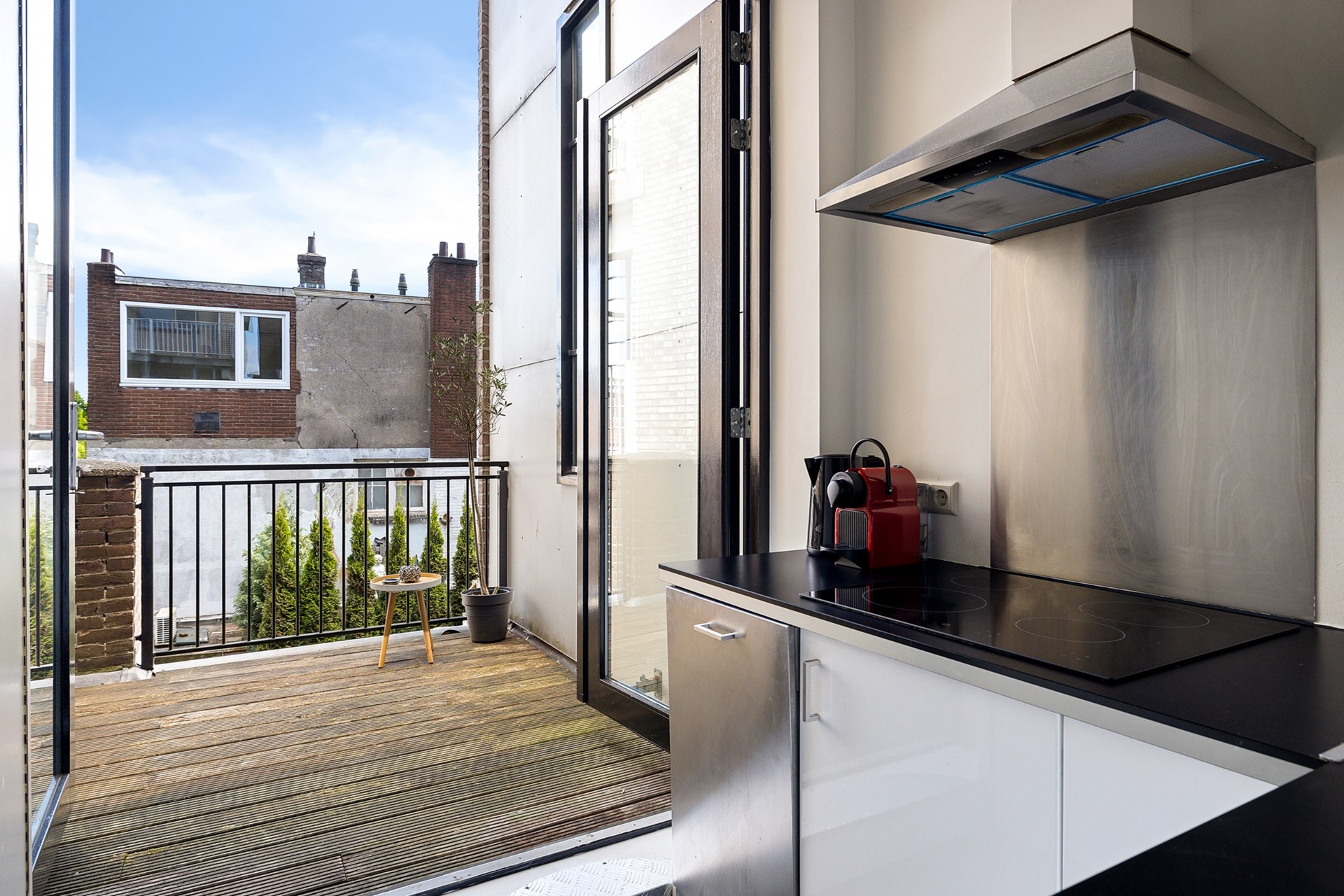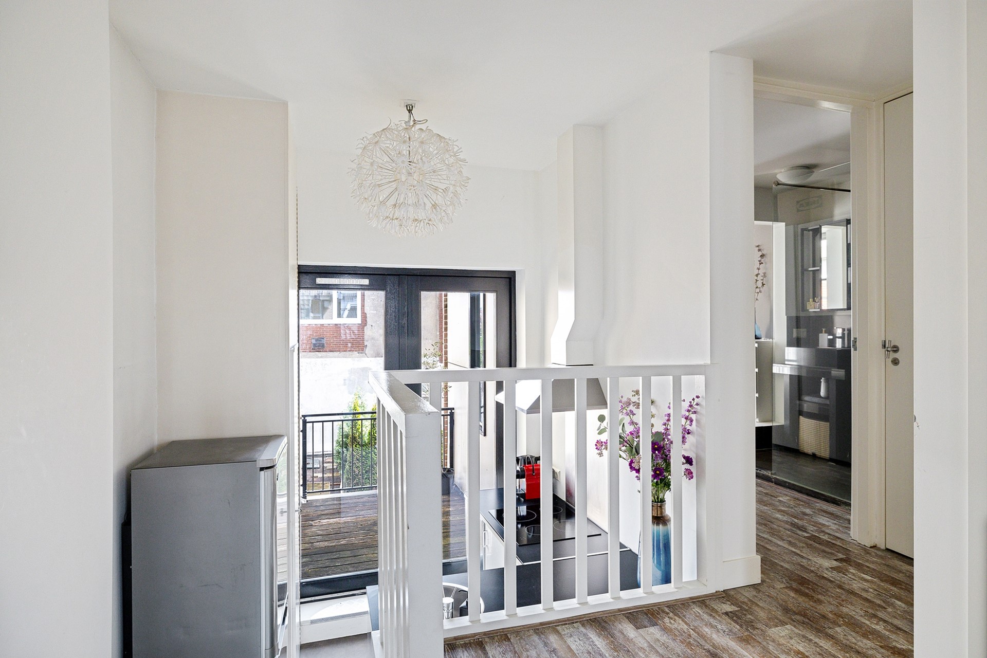 Een paar treden lager kom je in de nette L-vormige keuken, uitgerust met een spoelbak, vaatwasser, inductiekookplaat en afzuigkap. Hier vind je ook een vaste kast met de wasmachineaansluiting en cv-ketel. Via openslaande deuren heb je toegang tot het dakterras, waar je heerlijk kunt genieten van de ochtendzon.