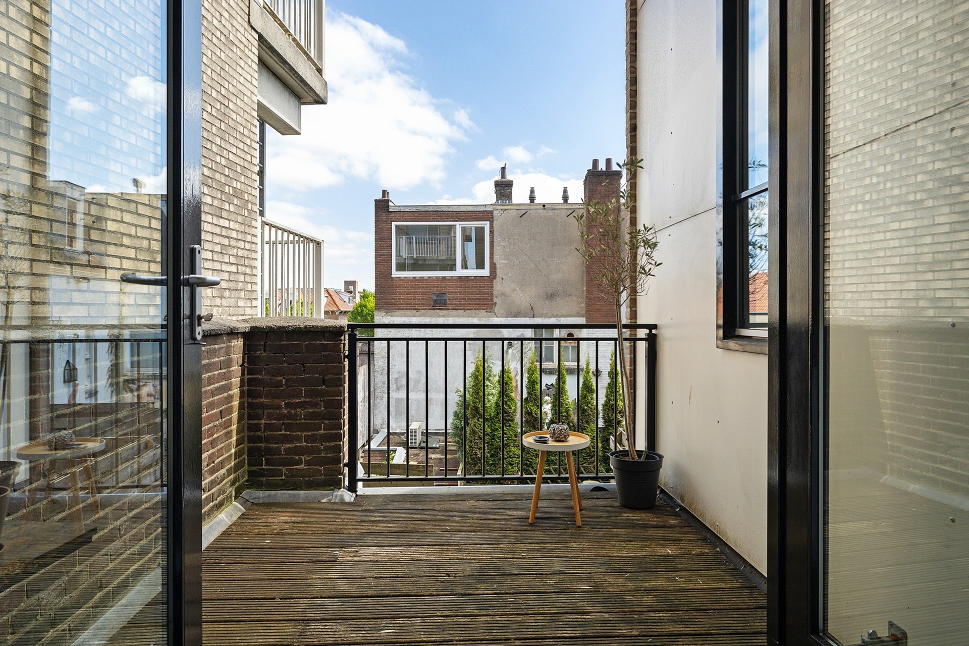 Balkon aan de voorkant (westen) aan de Brinklaan en een dakterras aan de achterkant op het oosten.