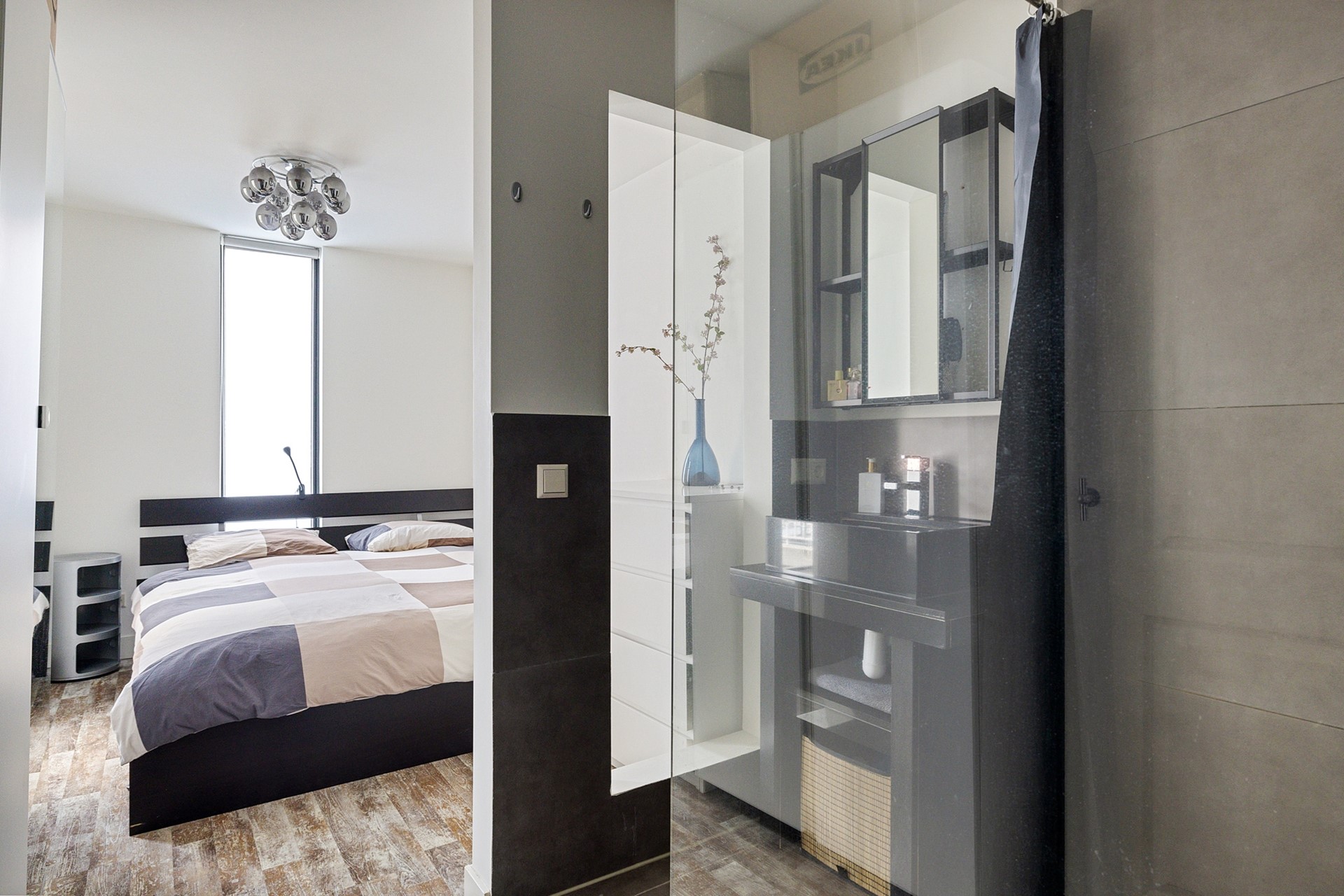 Vanuit de woonkamer is er een doorloop naar een modern toilet en de ruime slaapkamer, die is voorzien van een half open badkamer (met vloerverfwarming) met een inloopdouche en stijlvol wastafelmeubel. De slaapkamer is aan de achterzijde gelegen, weg van de drukke straat, dus heerlijk rustig.