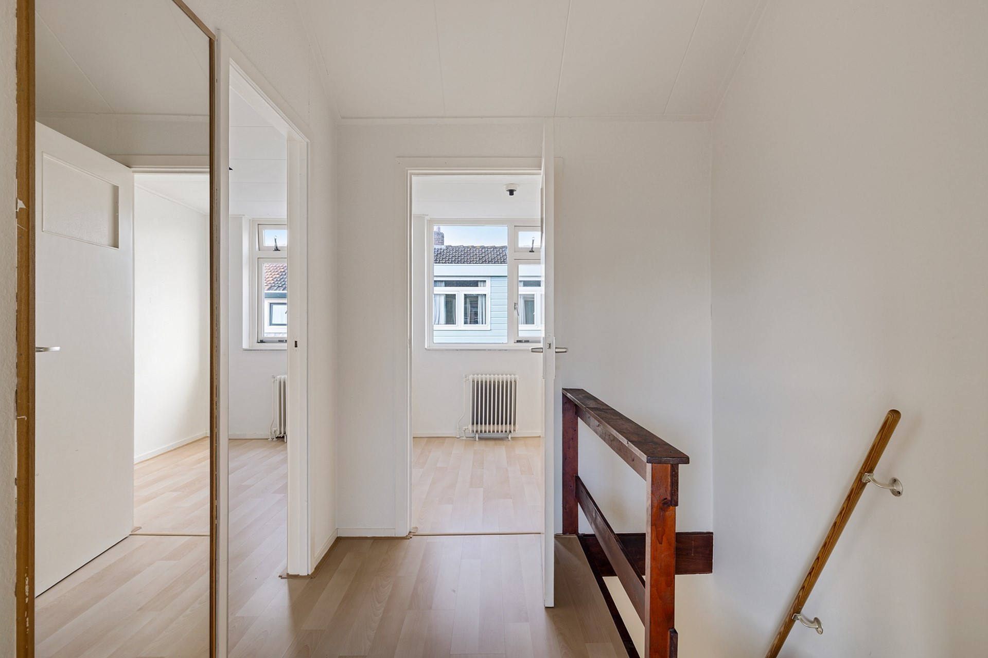 Overloop, 3 in grootte variërende slaapkamers, waarvan 1 ruime slaapkamer met wastafel. Vanaf een de overloop is de vliering bereikbaar.
