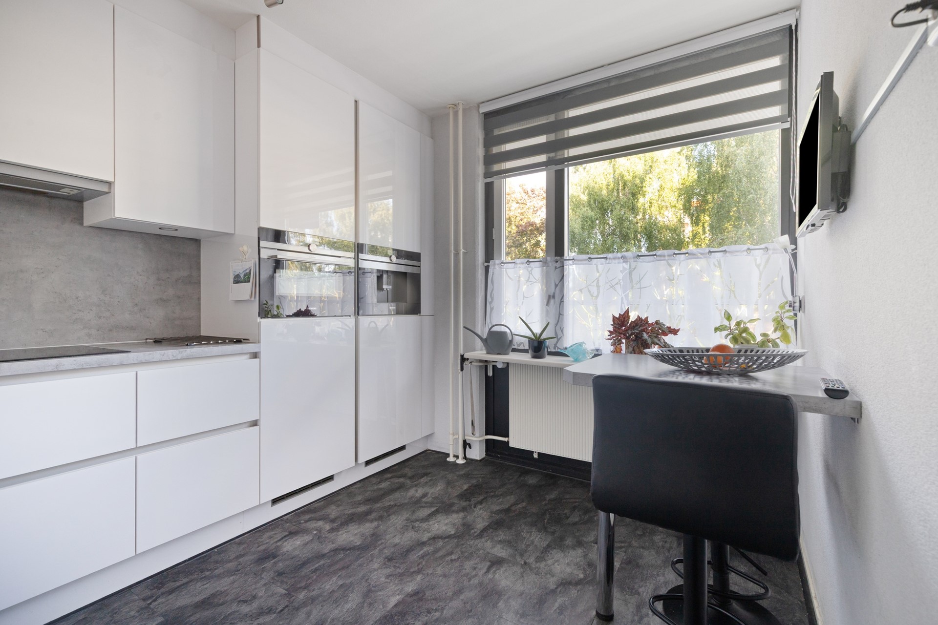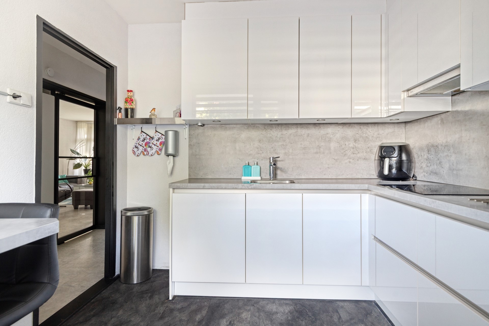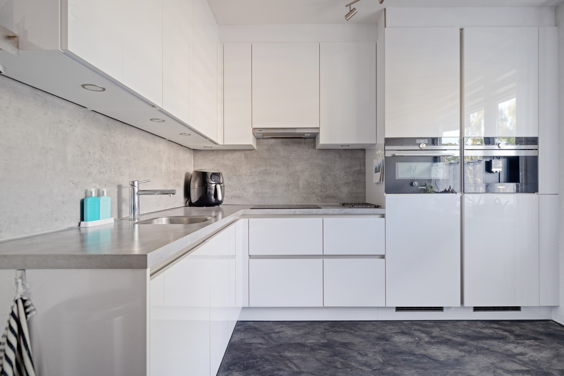 De dichte, Witte keuken is voorzien van een Laminaat en diverse inbouwapparatuur: (merken Siemens en AEG) + koffiezetapparaat.