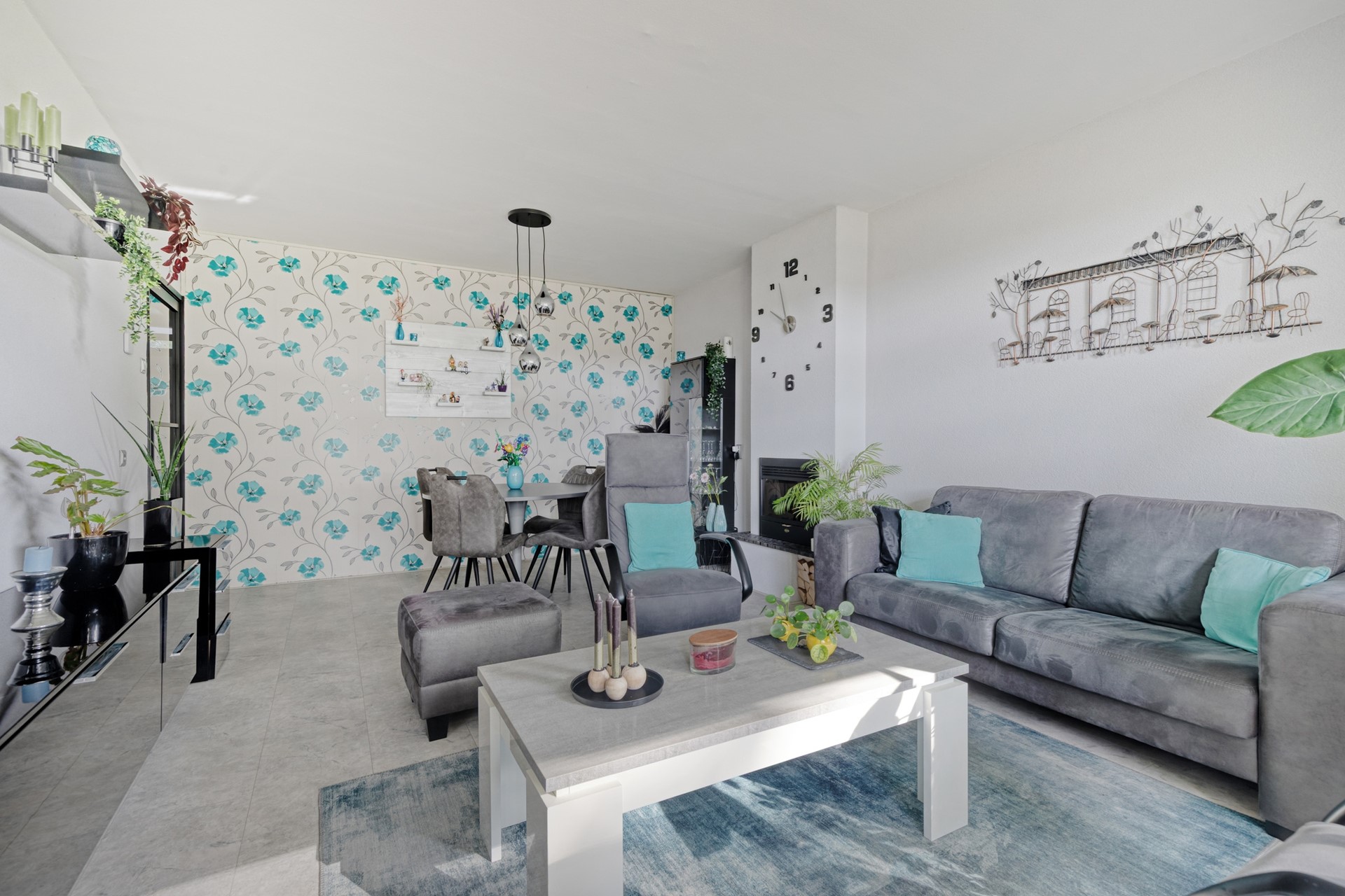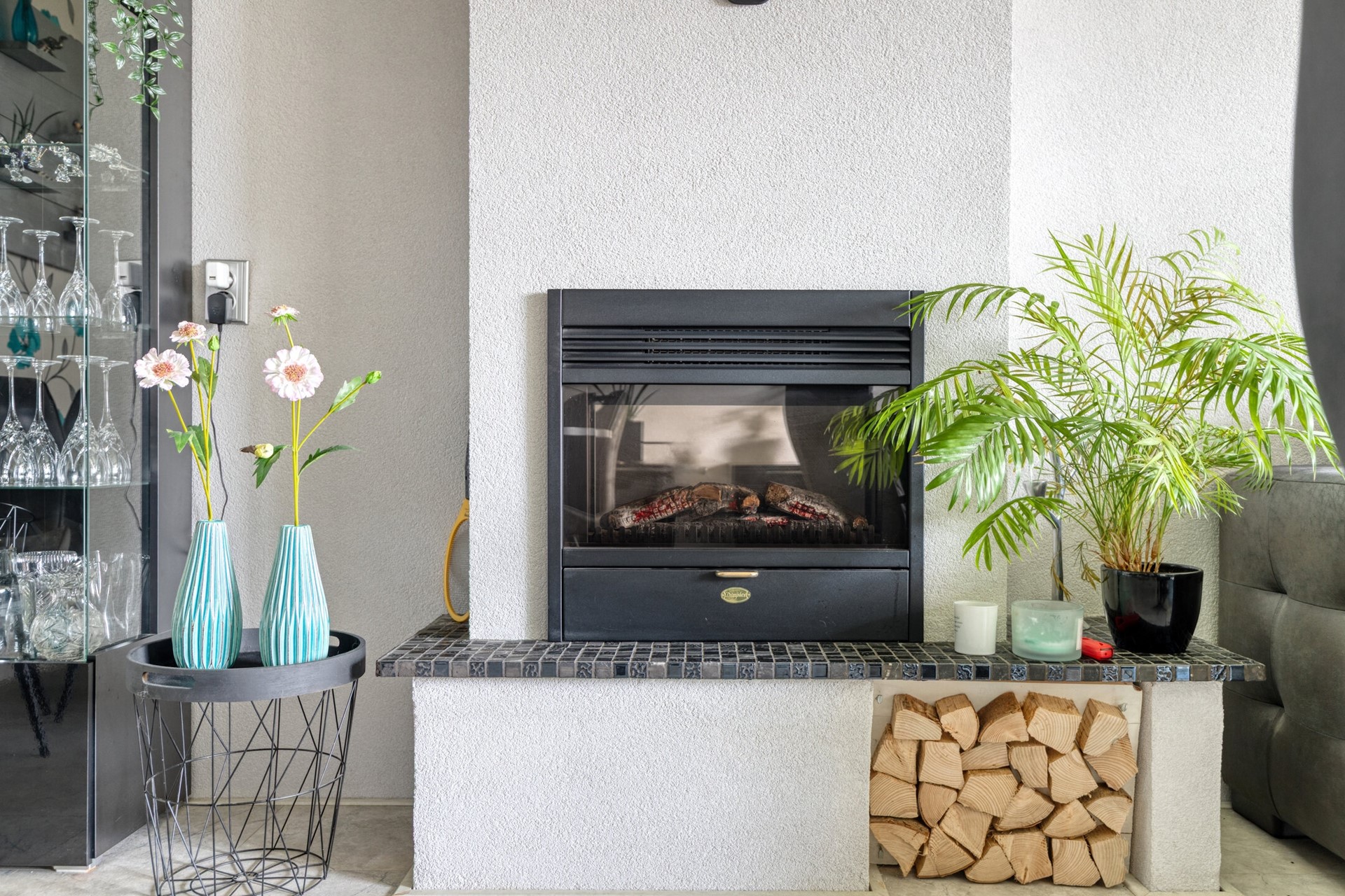 De woonkamer is voorzien van een elektrische sierhaard, Laminaat en structuurwanden.