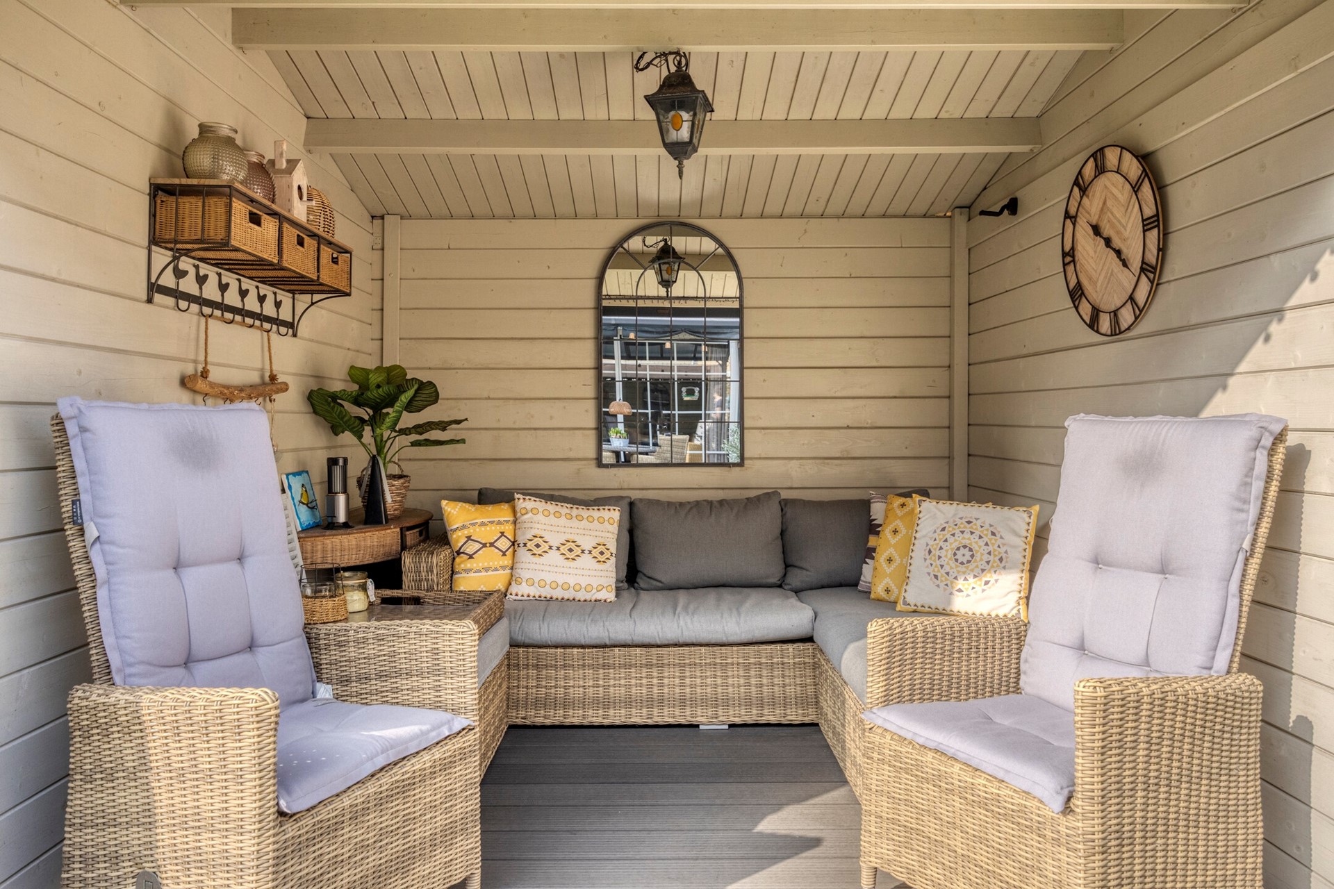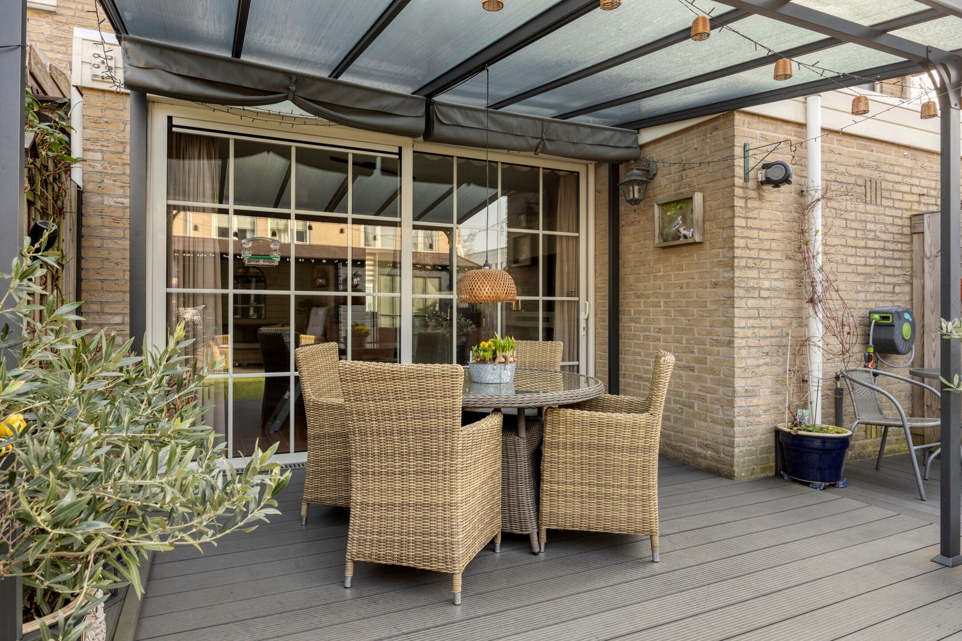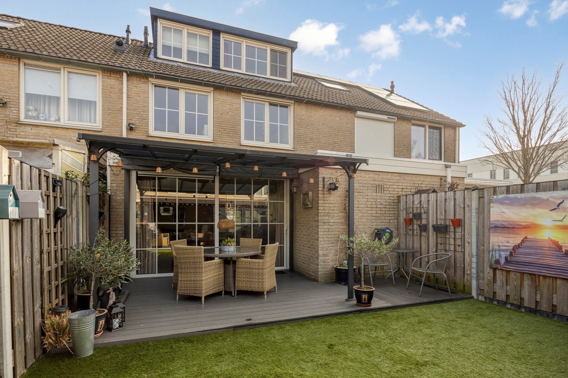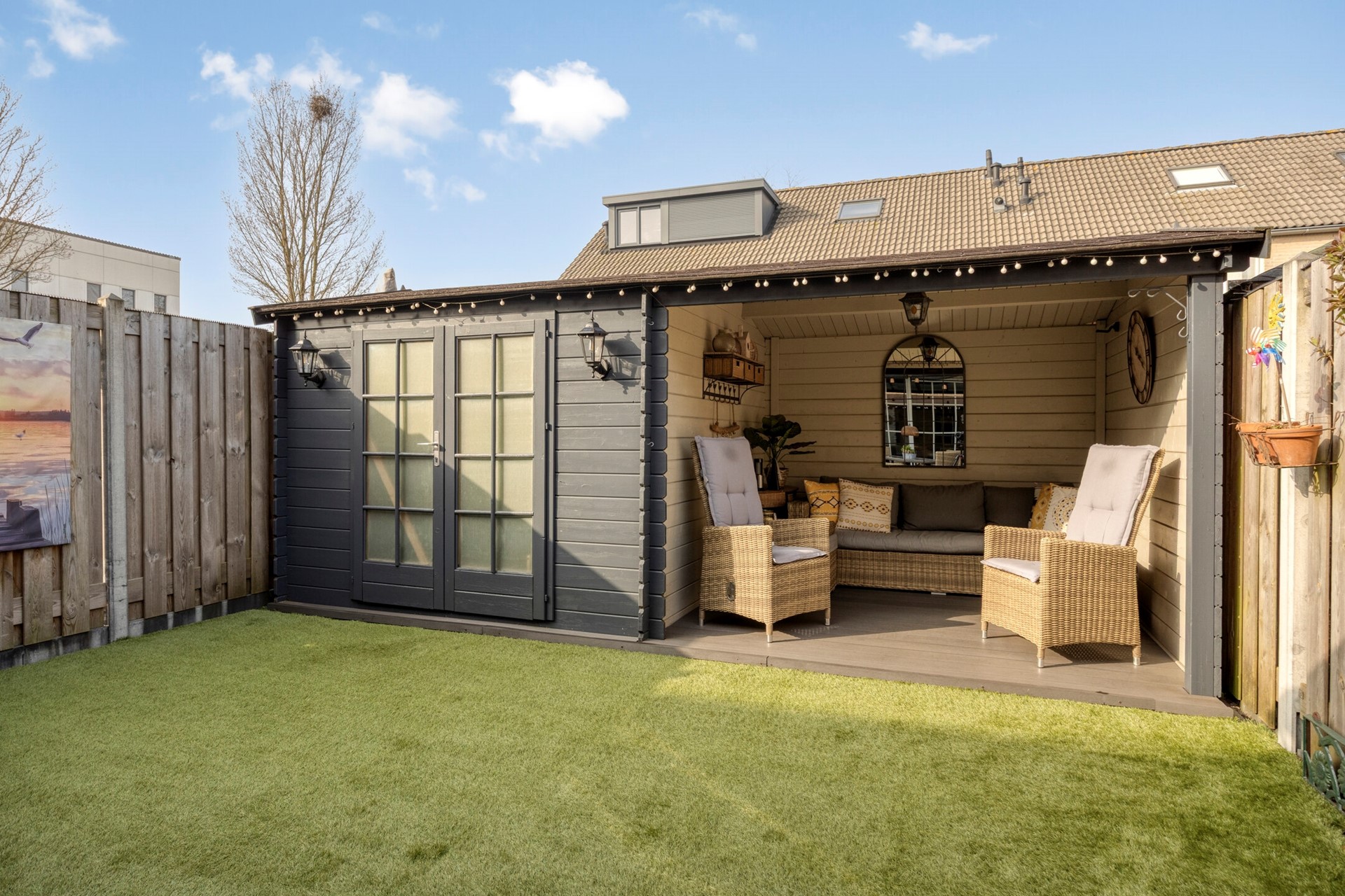 Achtertuin 6,25 meter met overkapping met zonwering, berging en prieeltje.