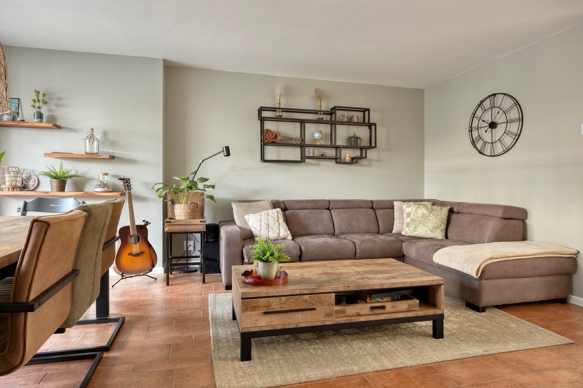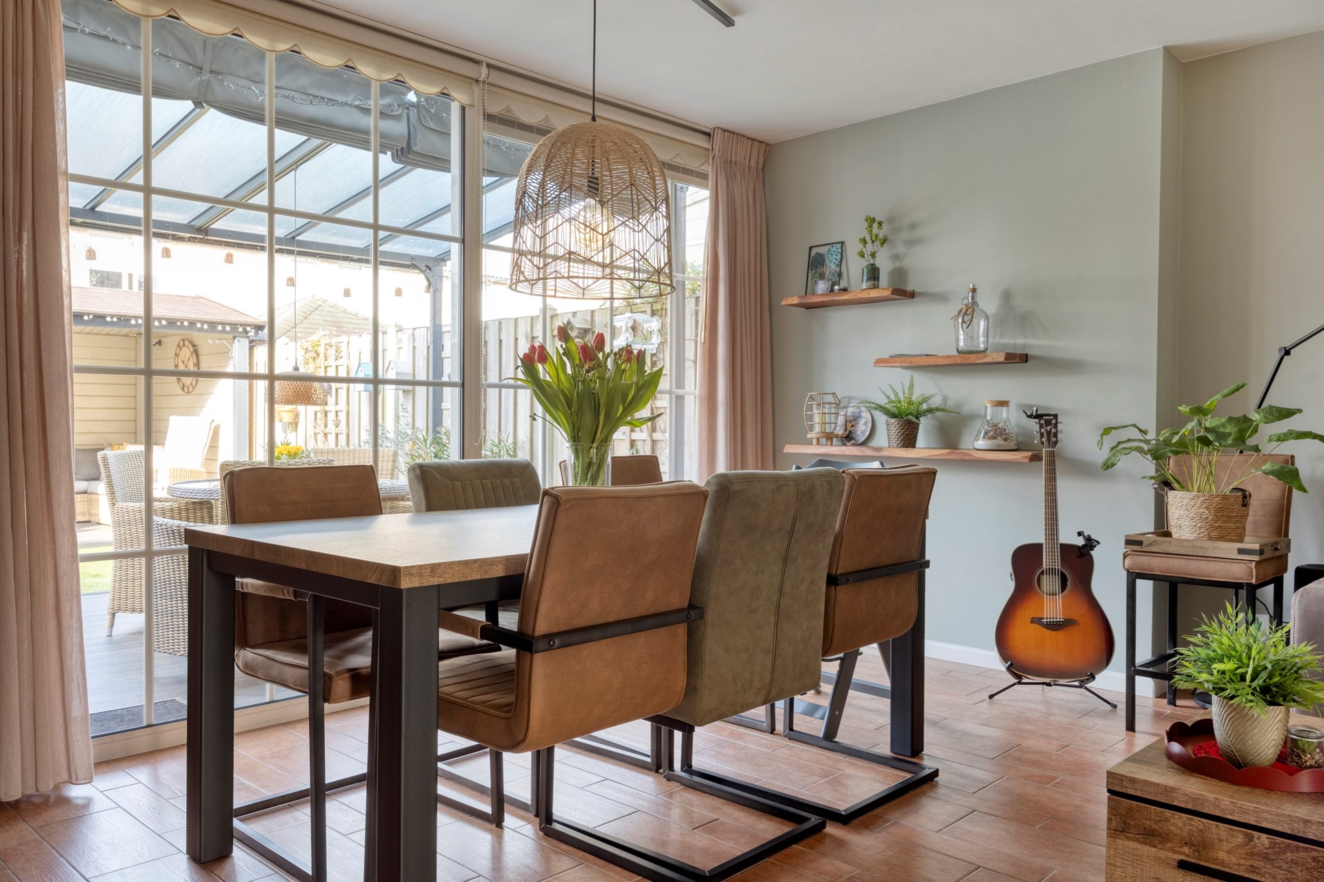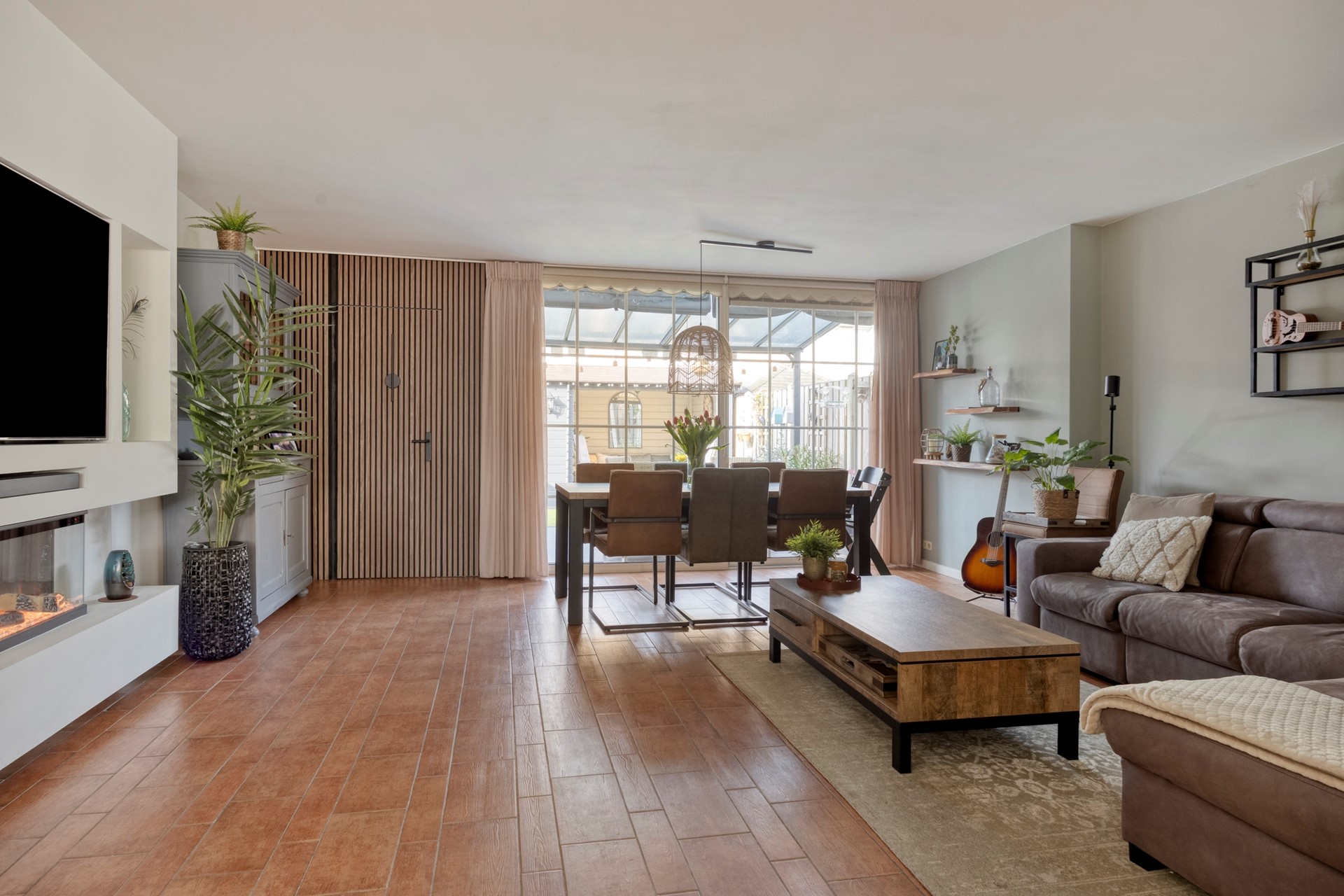 Dankzij de vele raampartijen is het een lichte en sfeervolle leefruimte.