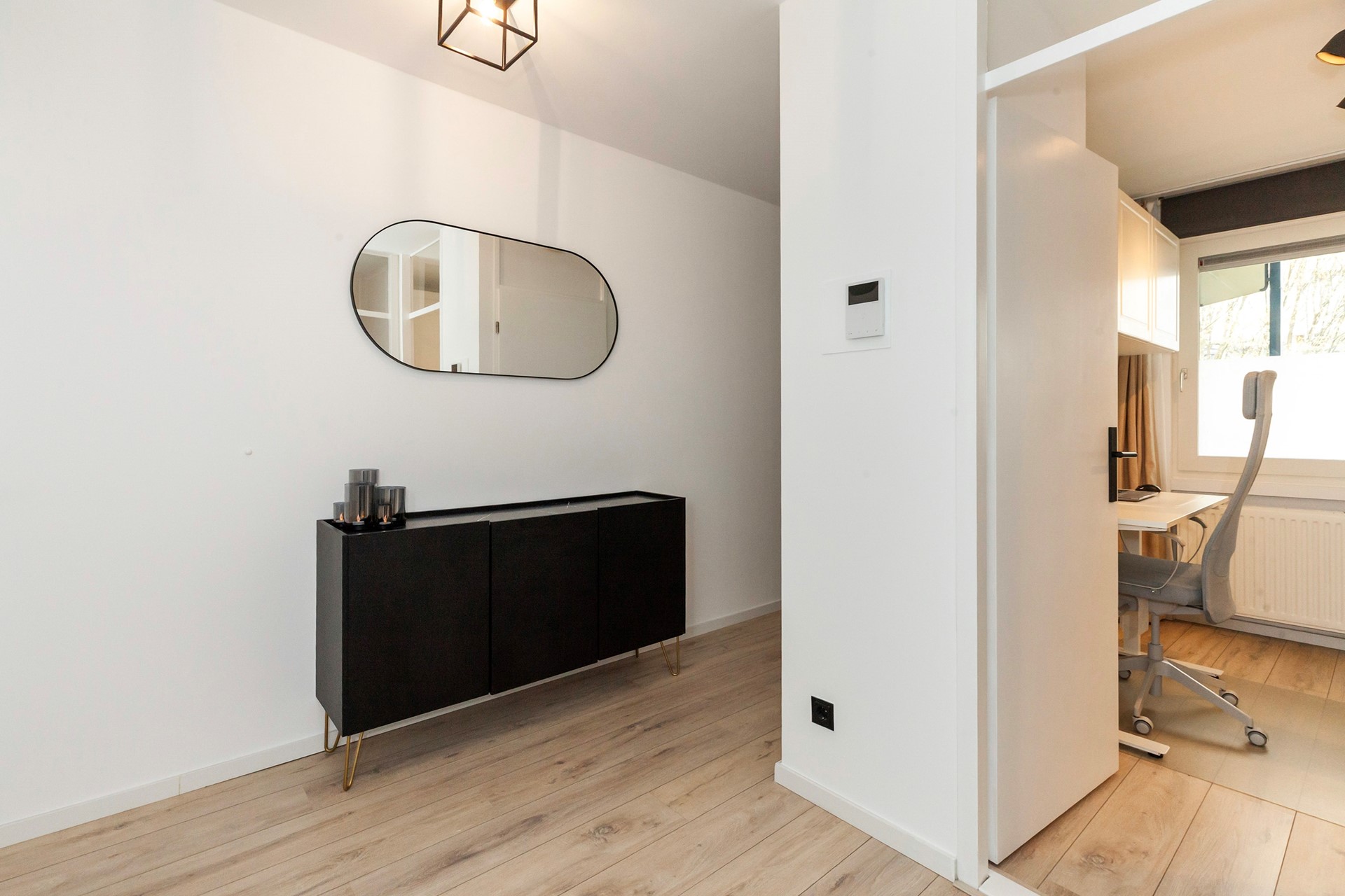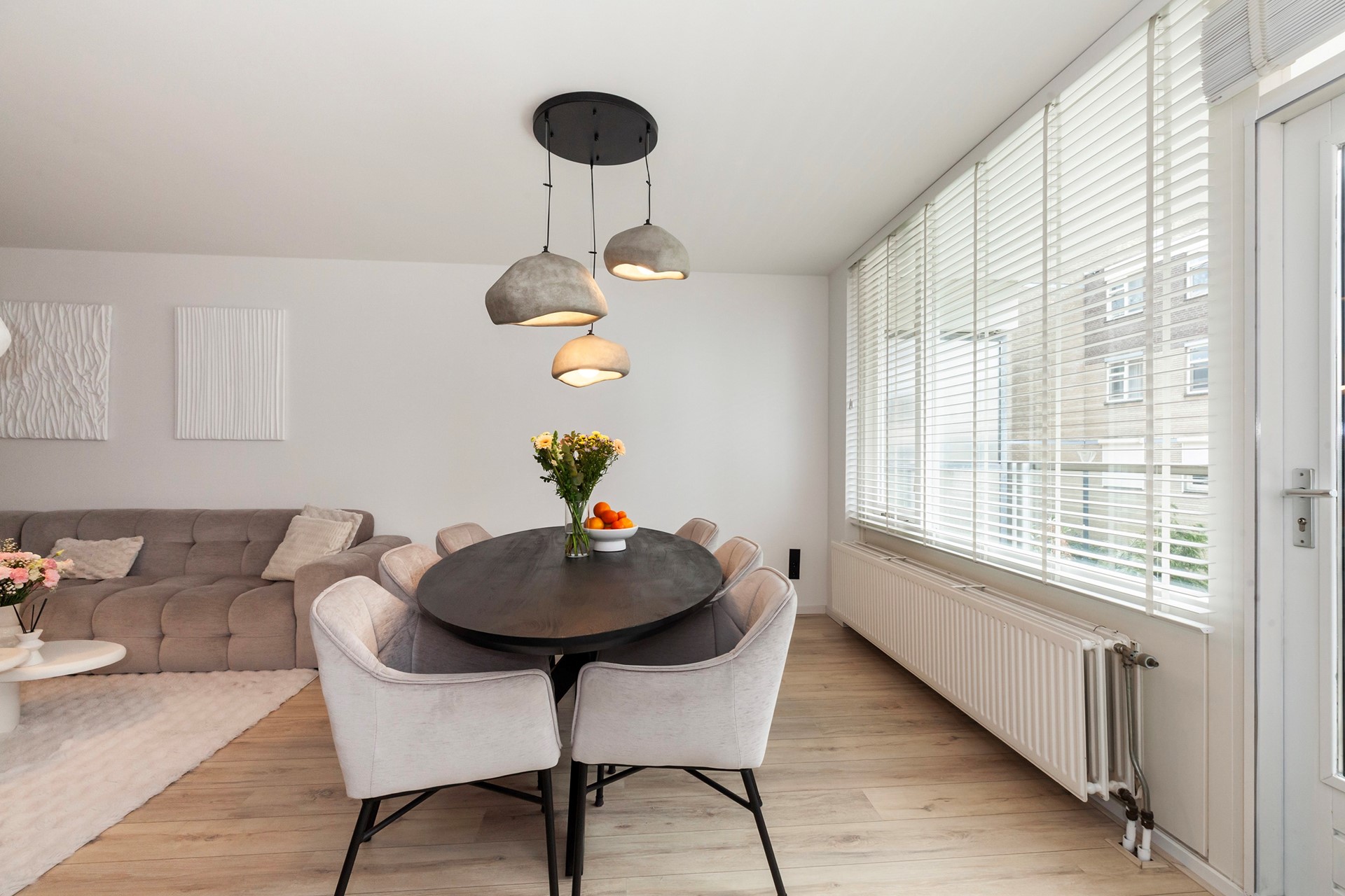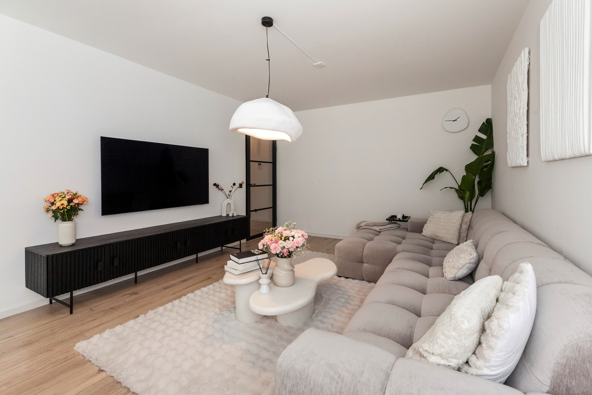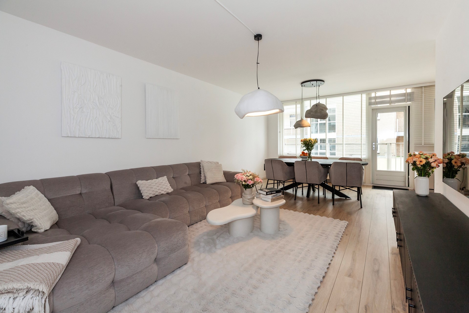 De woonkamer is heerlijk licht en strak afgewerkt, met directe toegang tot het zonnige balkon op het zuidwesten, een fijne plek om na je werk nog even van de zon te genieten.