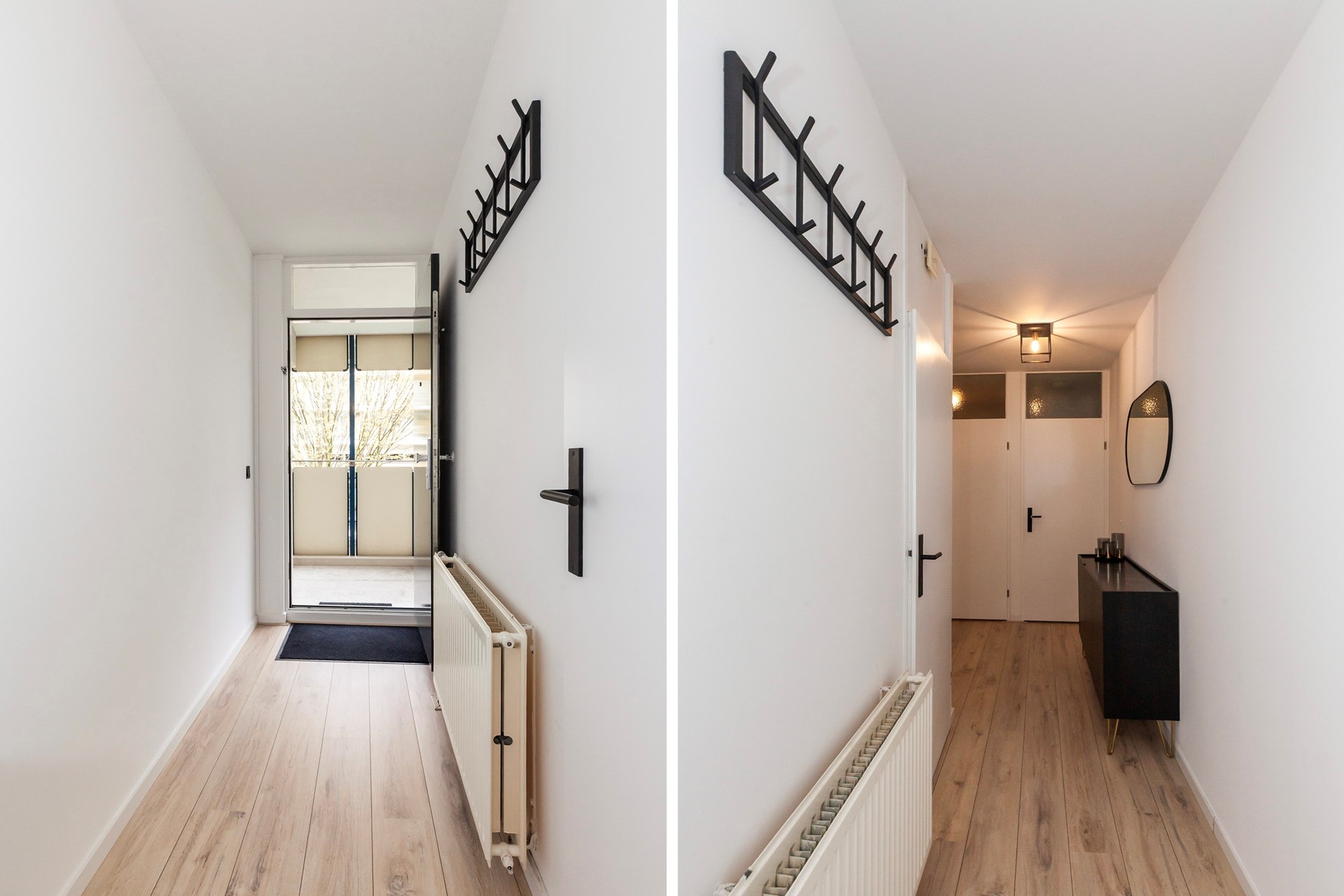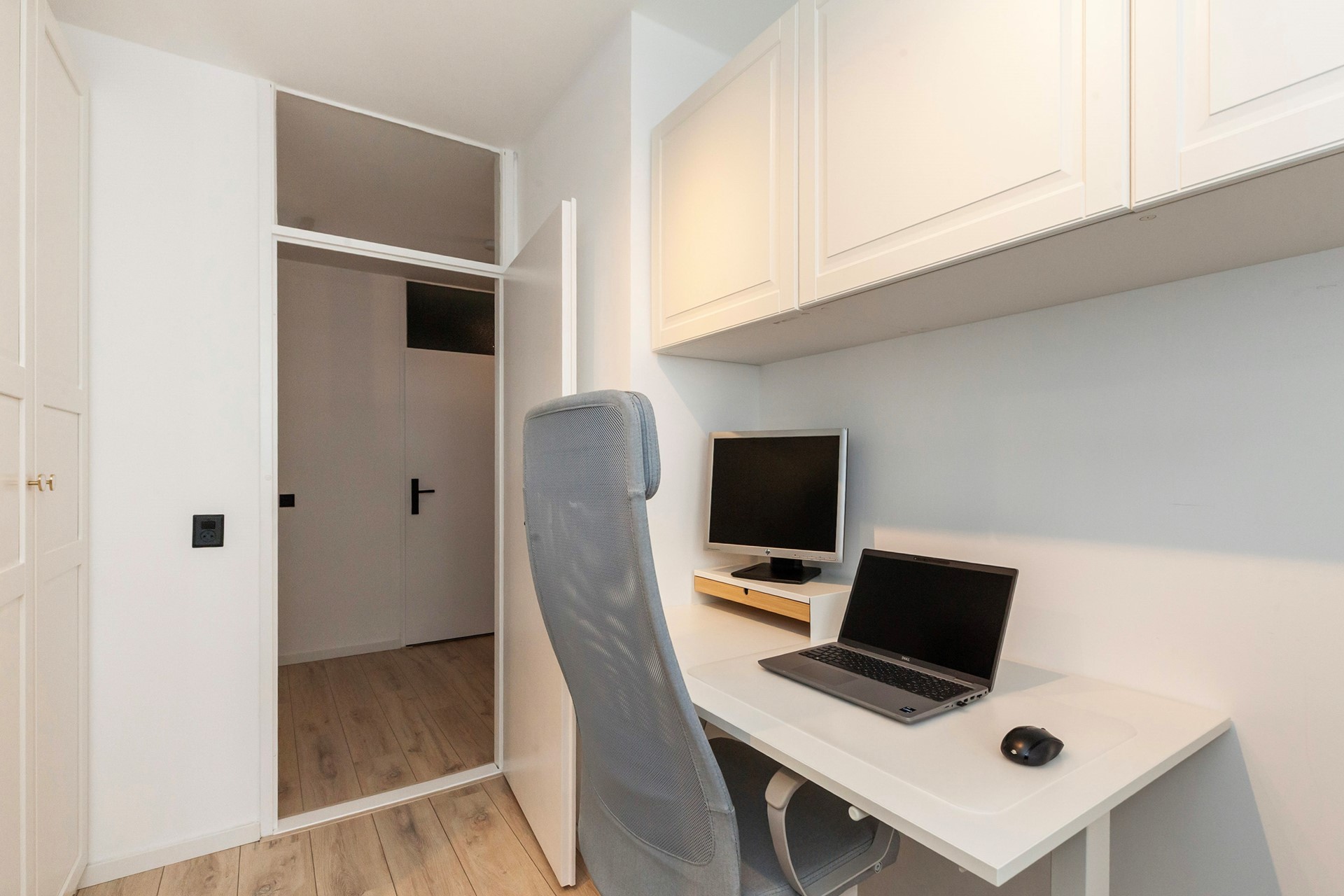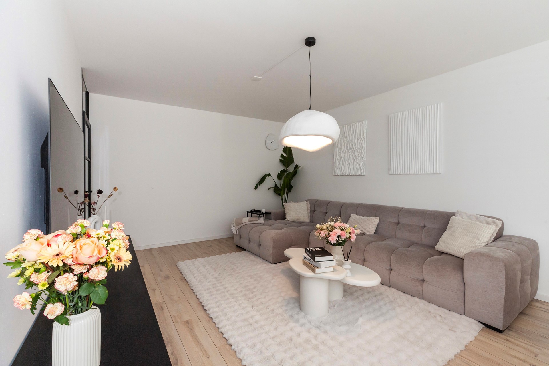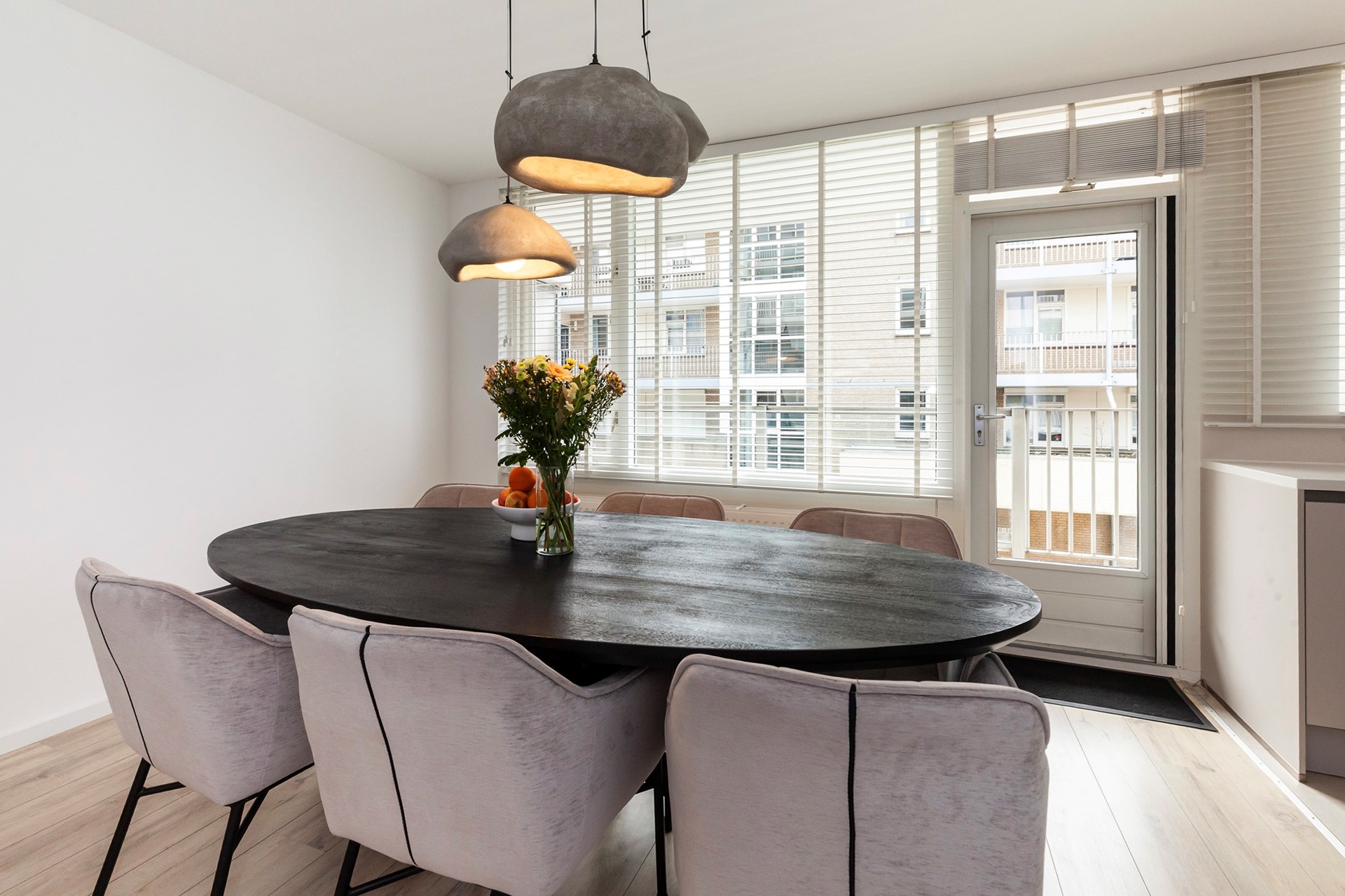 De woonkamer is heerlijk licht en strak afgewerkt, met directe toegang tot het zonnige balkon op het zuidwesten, een fijne plek om na je werk nog even van de zon te genieten.