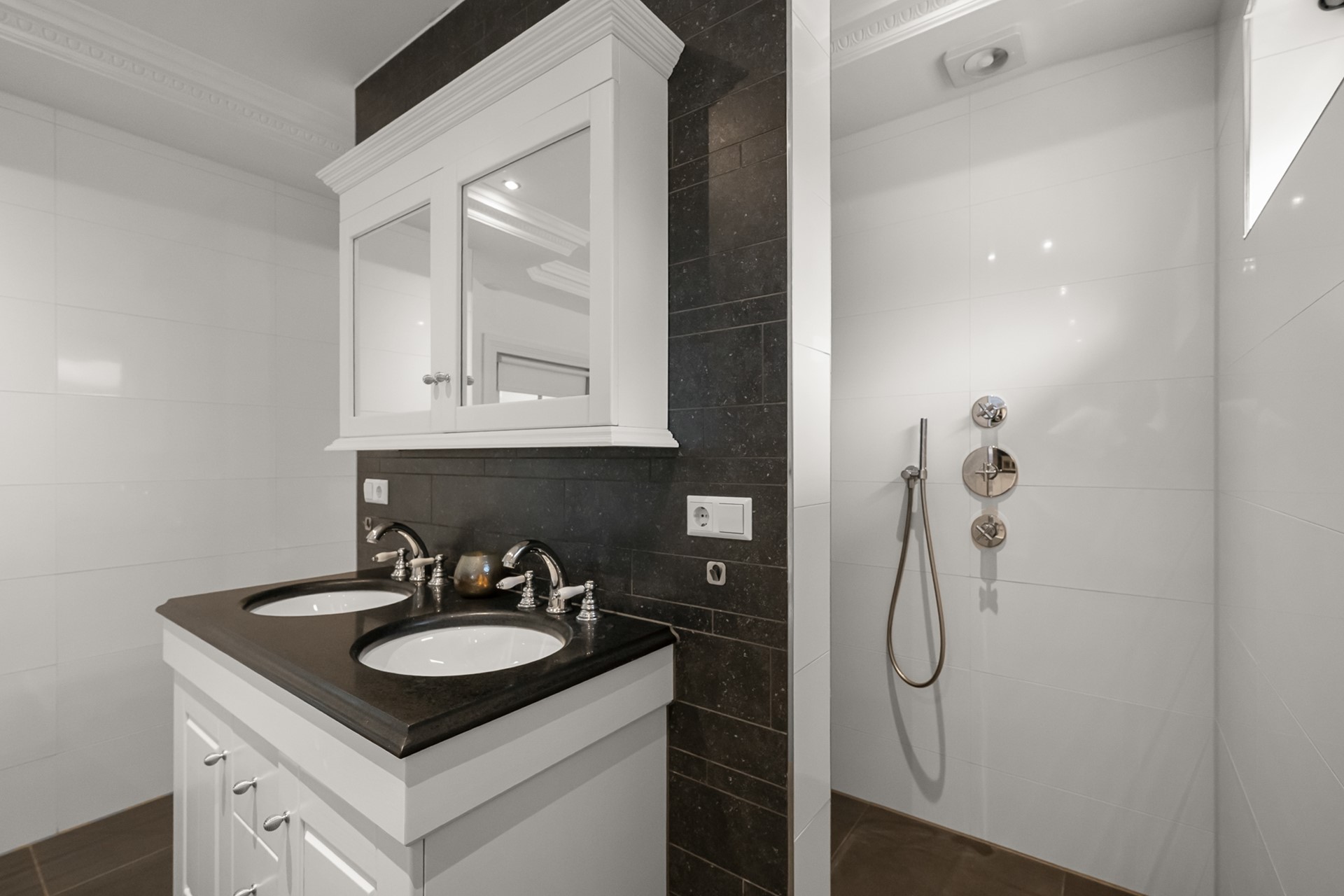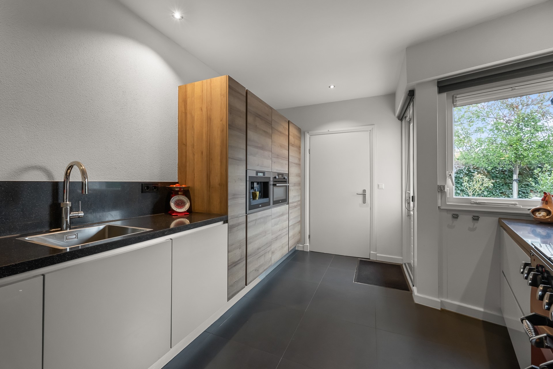 De keuken is compleet uitgevoerd en is voorzien van een koelkast en separate vriezer, combi-magnetron, vaatwasser, ingebouwd koffieapparaat, Quooker én een karakteristiek Falcon fornuis. Hiermee is er alle ruimte en comfort voor kookliefhebbers. Direct naast de keuken bevindt zich de bijkeuken met extra opbergruimte en aansluiting voor wasmachine en droger. Vanuit hier is ook de eerste, inpandige garage toegankelijk — ideaal voor opslag, hobby’s of het parkeren van een auto.