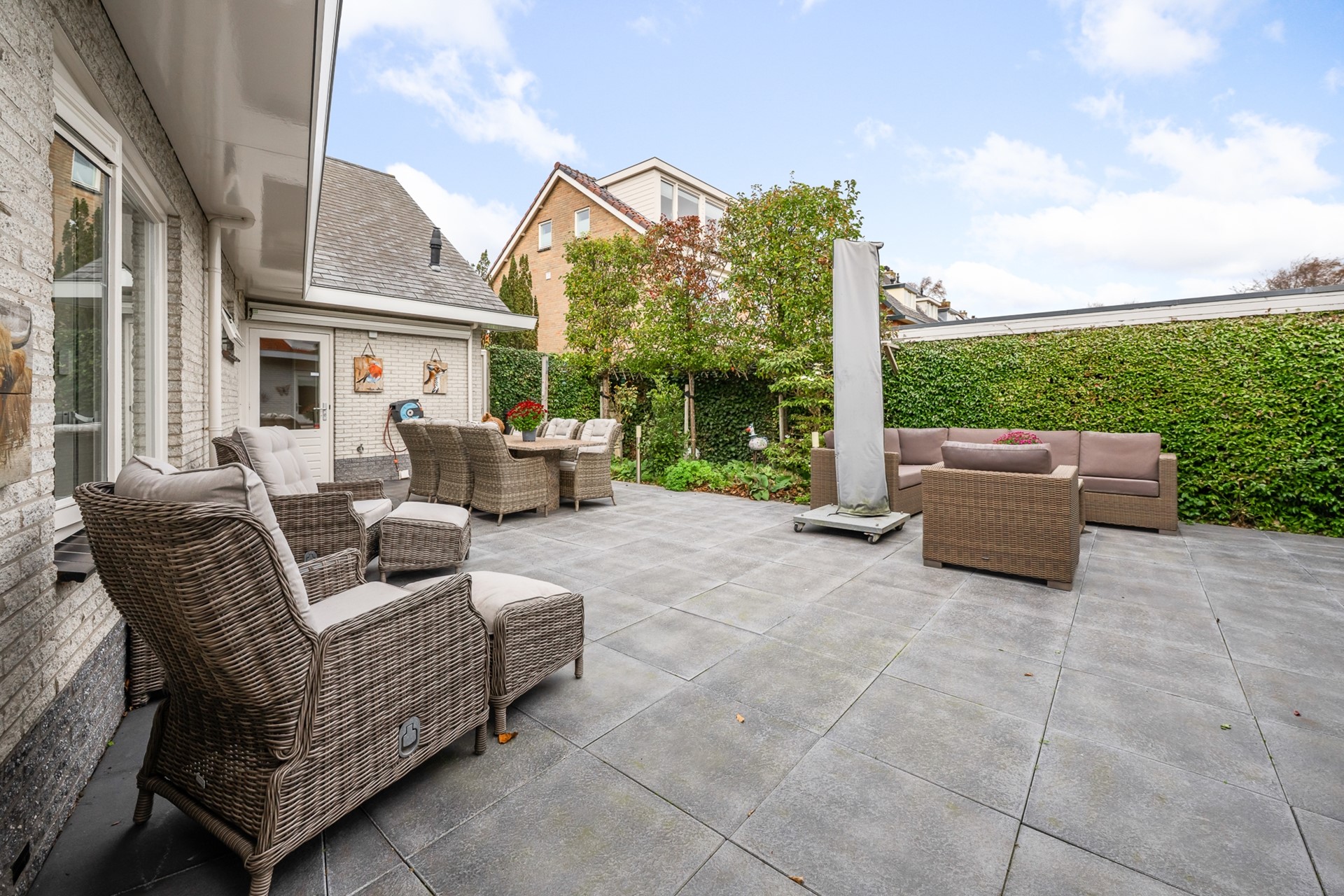 Rondom de woning ligt een verzorgde tuin met overkapping aan de entreezijde. Hier kunt u heerlijk genieten van het buitenleven, beschut zitten of een gezellige loungehoek creëren.