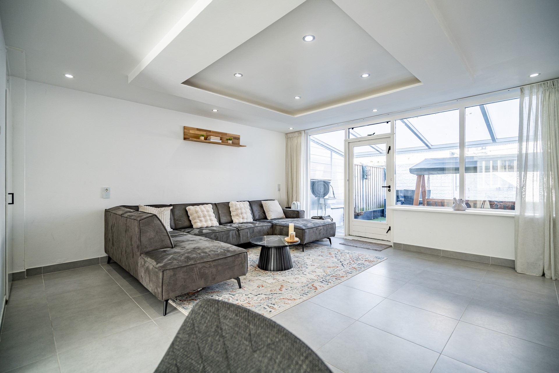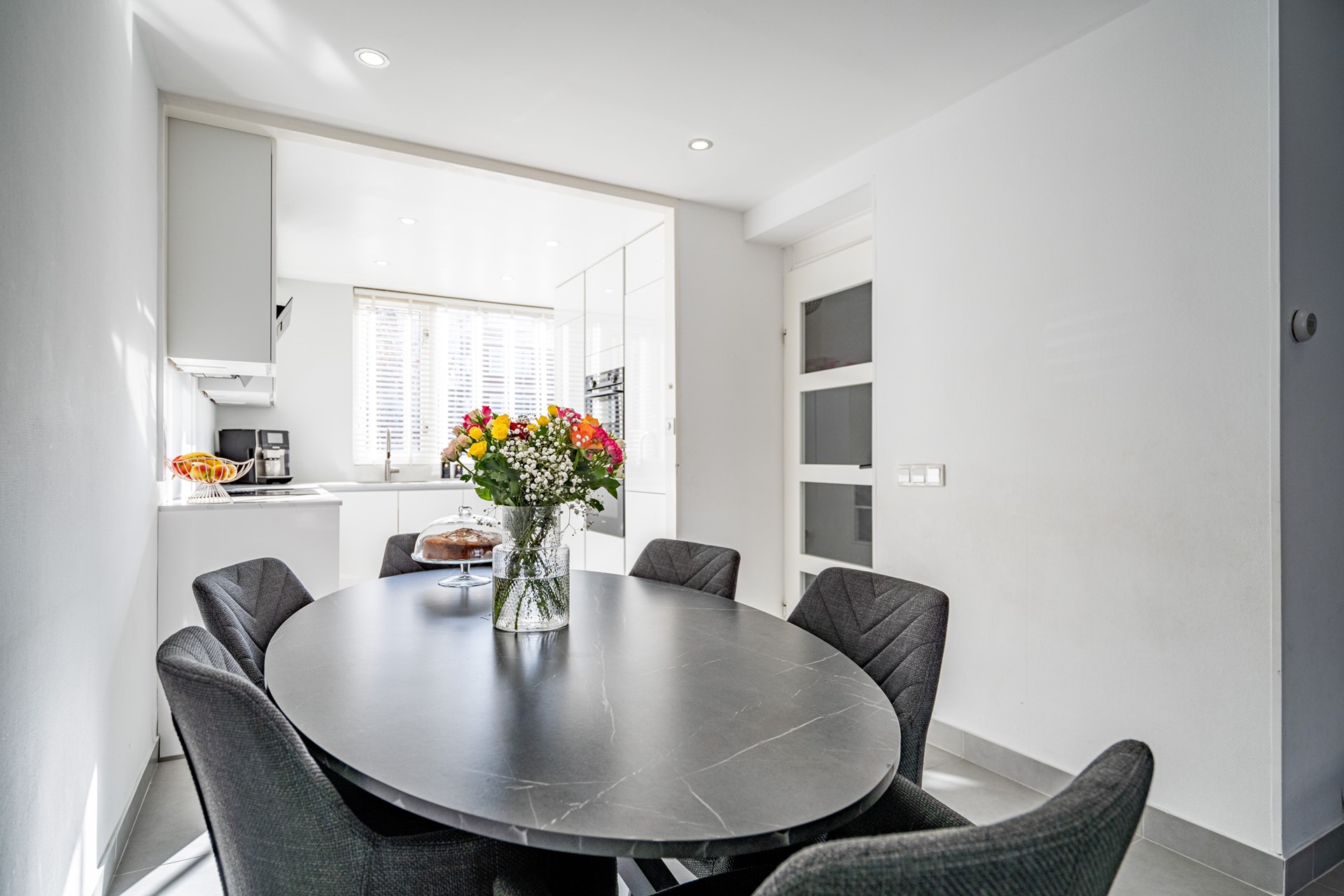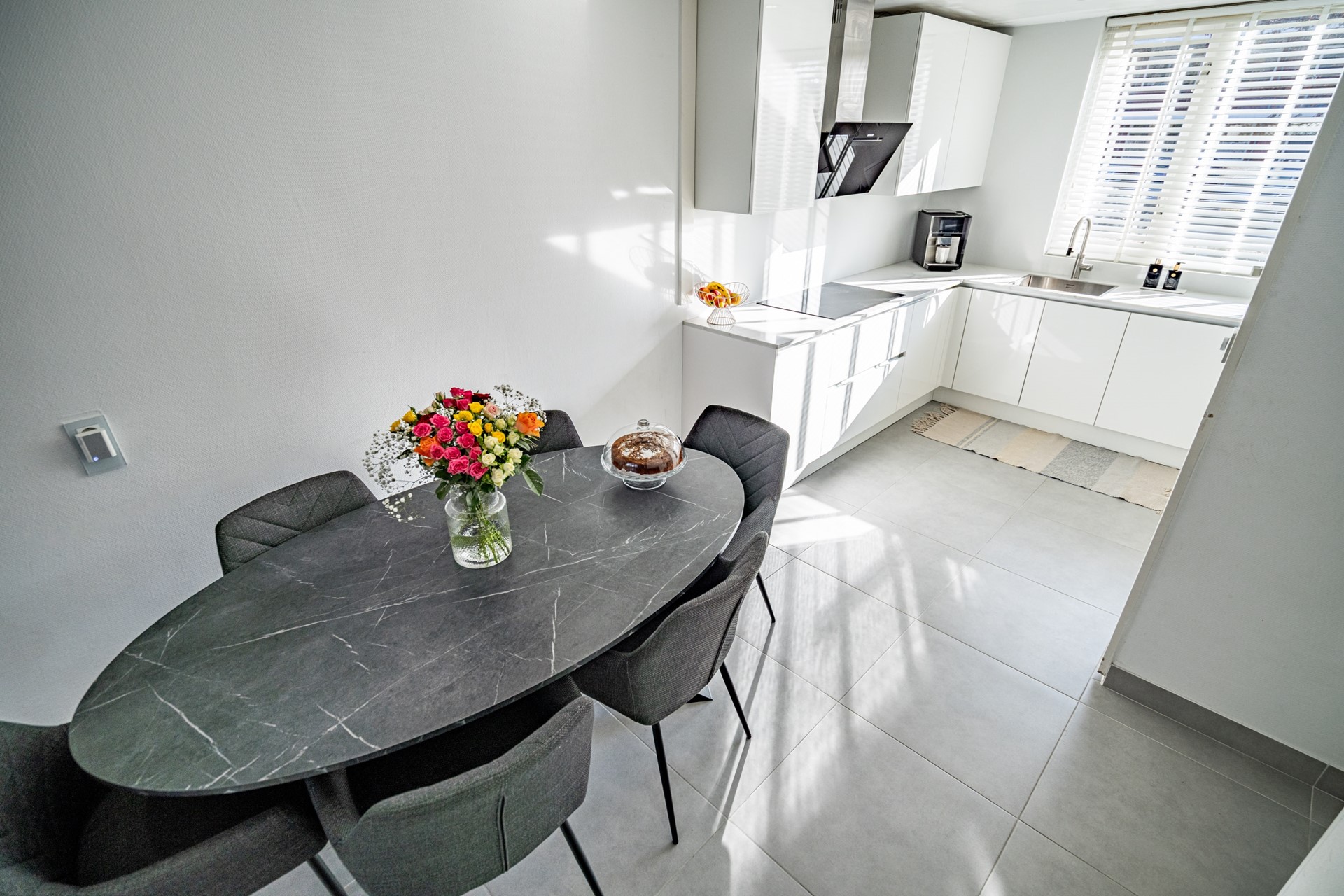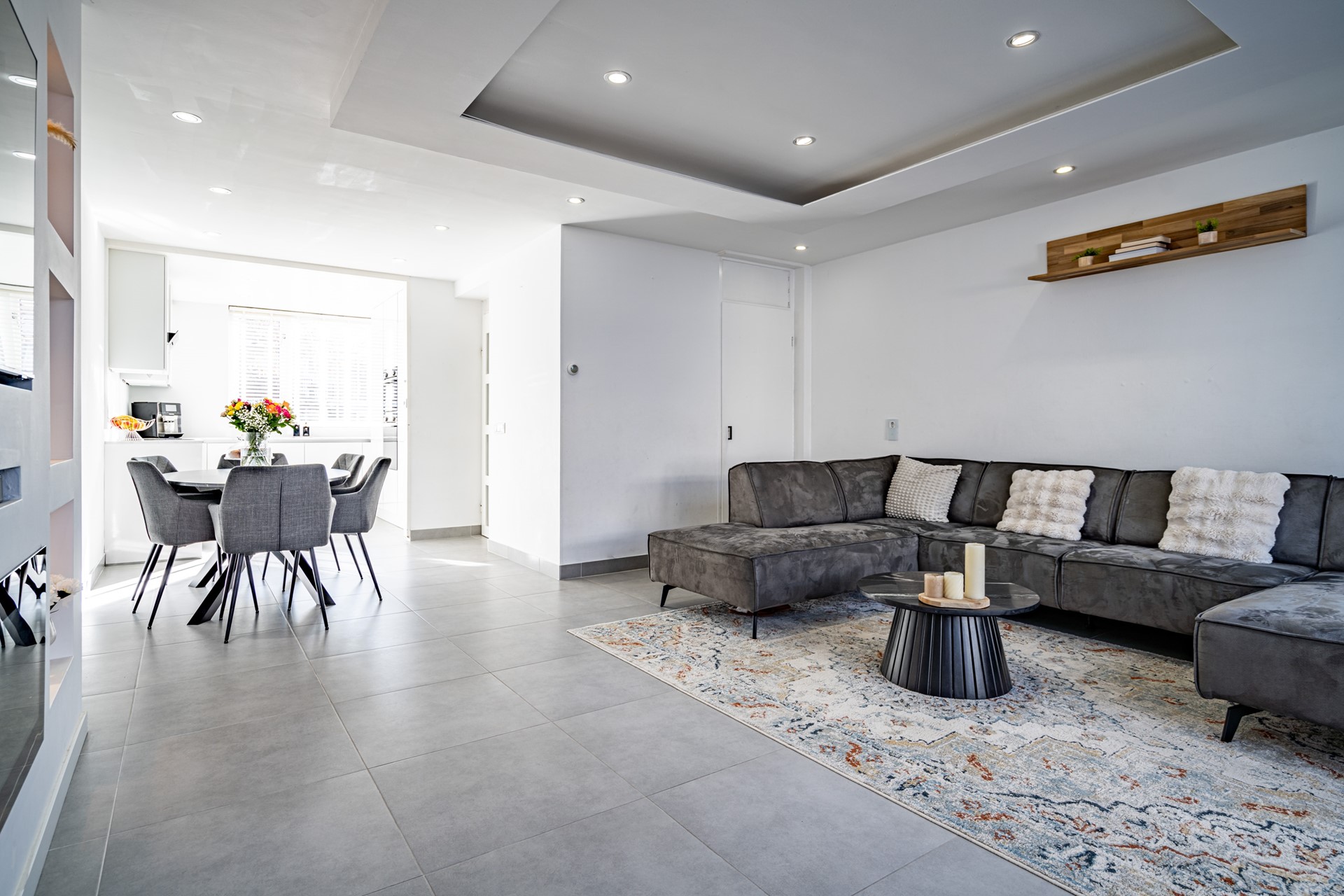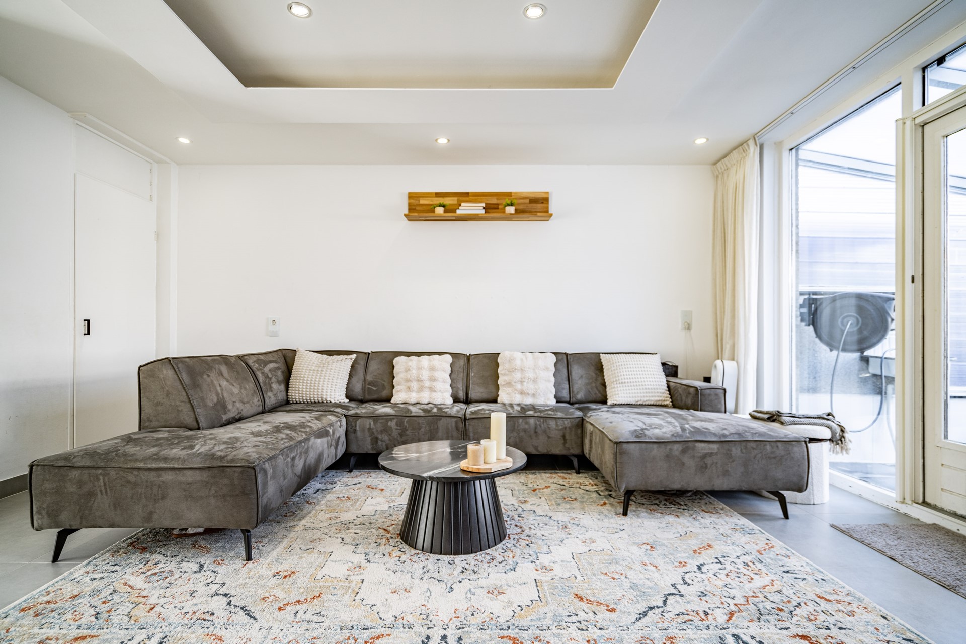 De keuken loopt naadloos over in de ruime woonkamer met voldoende plaats voor een royale zit- en eethoek. Het verlaagde plafond met koof en geïntegreerde spotverlichting zorgt voor een luxe uitstraling. Daarnaast beschikt de woonkamer over een stijlvolle cinema wall met elektrische open haard, wat bijdraagt aan sfeer en comfort.