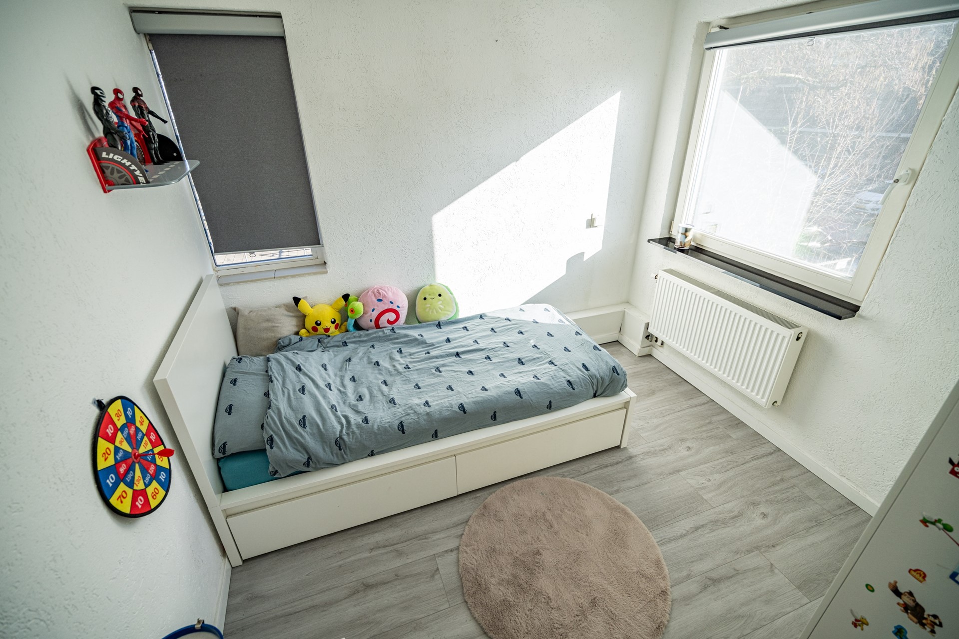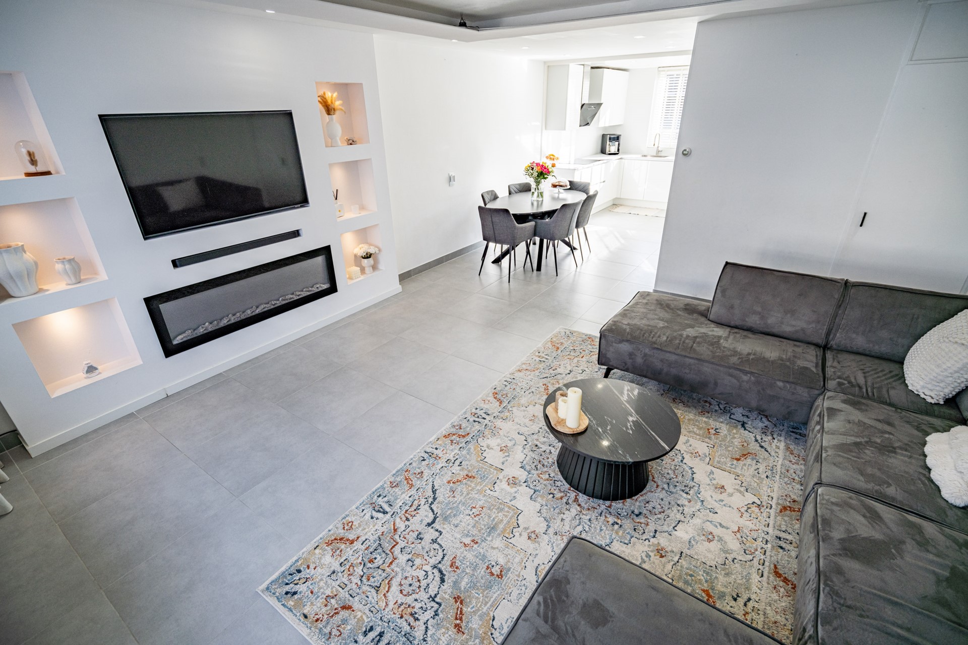 The kitchen flows seamlessly into the spacious living room, offering ample space for both a comfortable seating area and a generous dining table. The lowered ceiling with integrated spotlights creates a luxurious ambiance. In addition, the living room features a stylish cinema wall with an electric fireplace, adding both atmosphere and comfort.