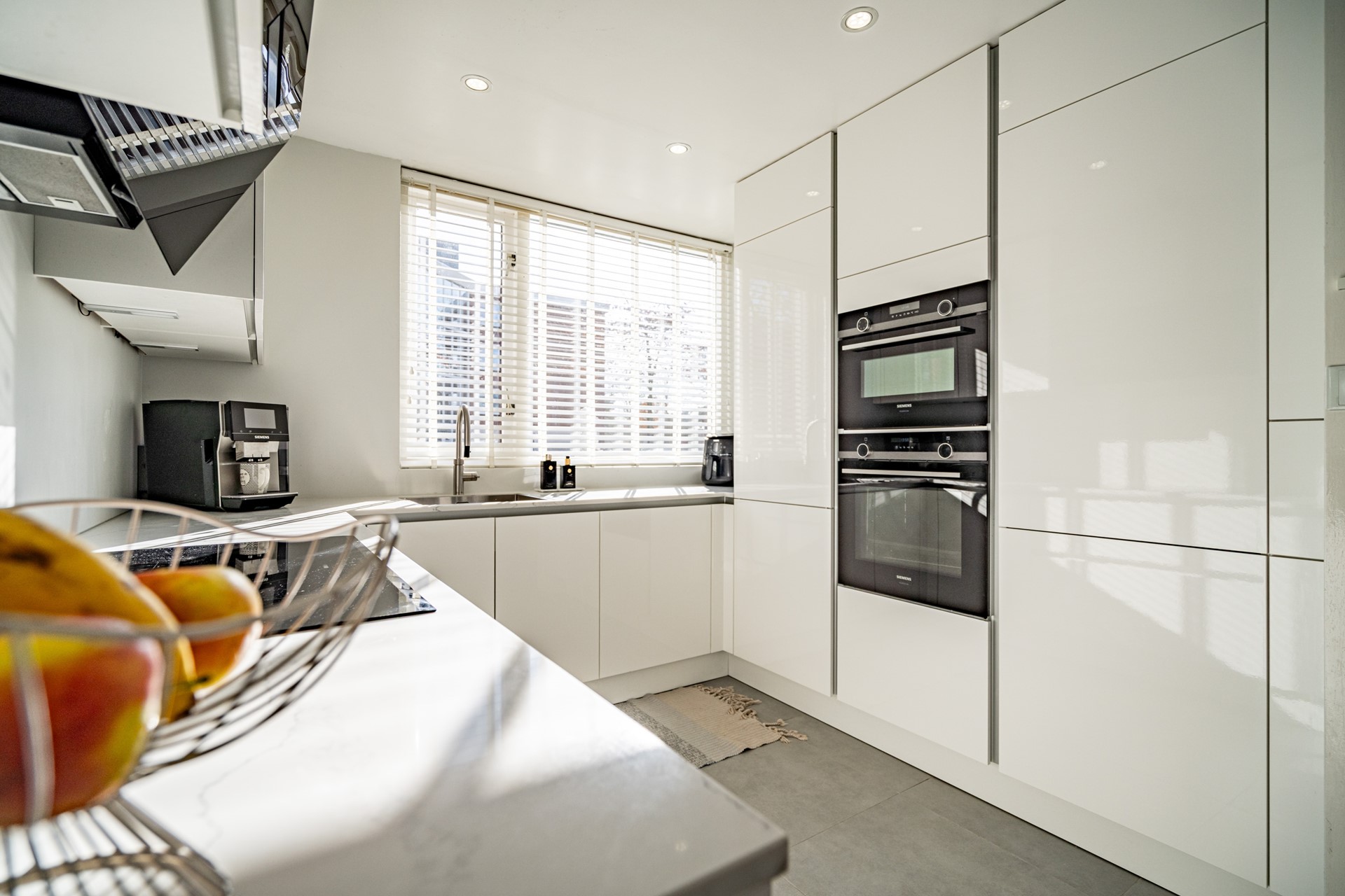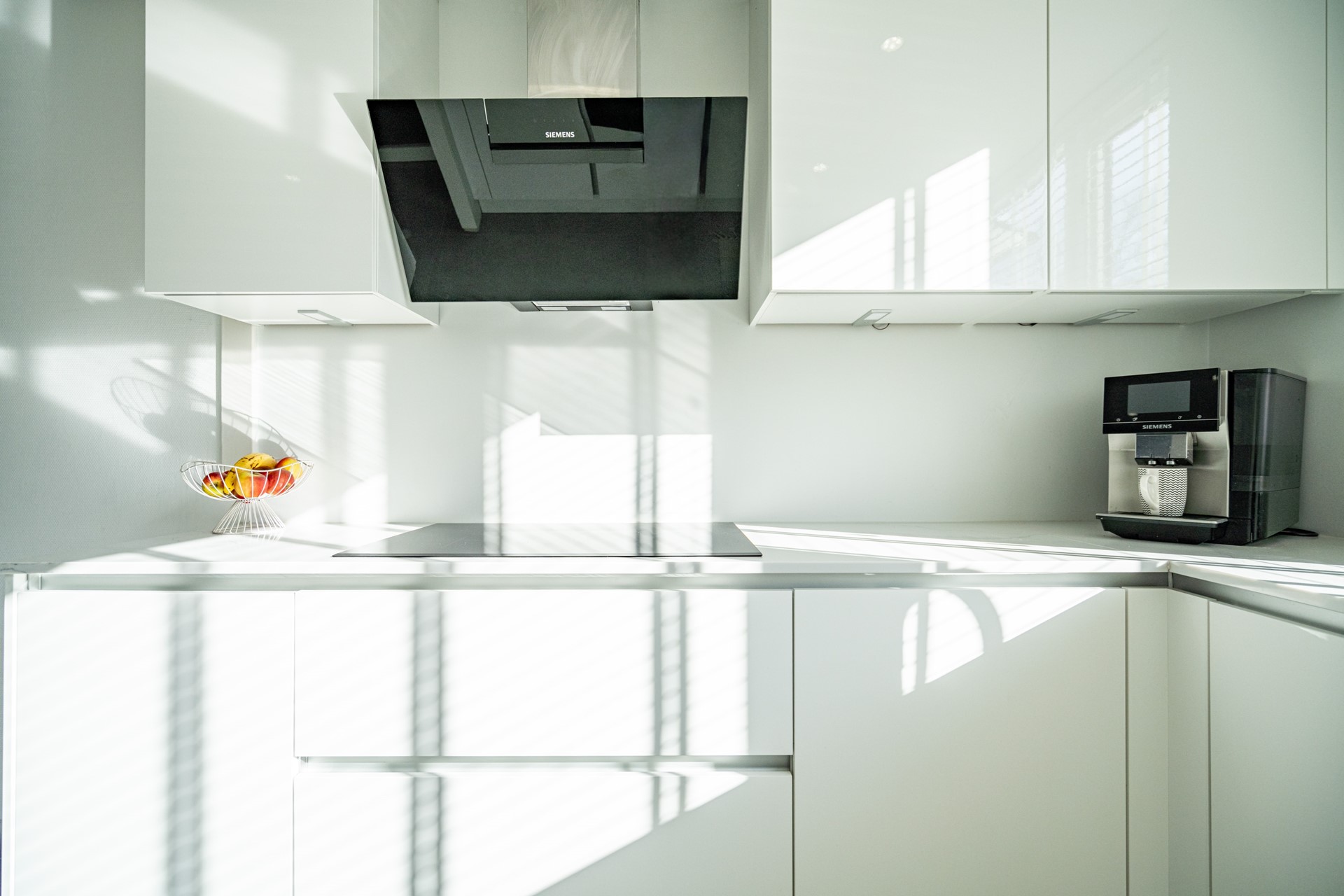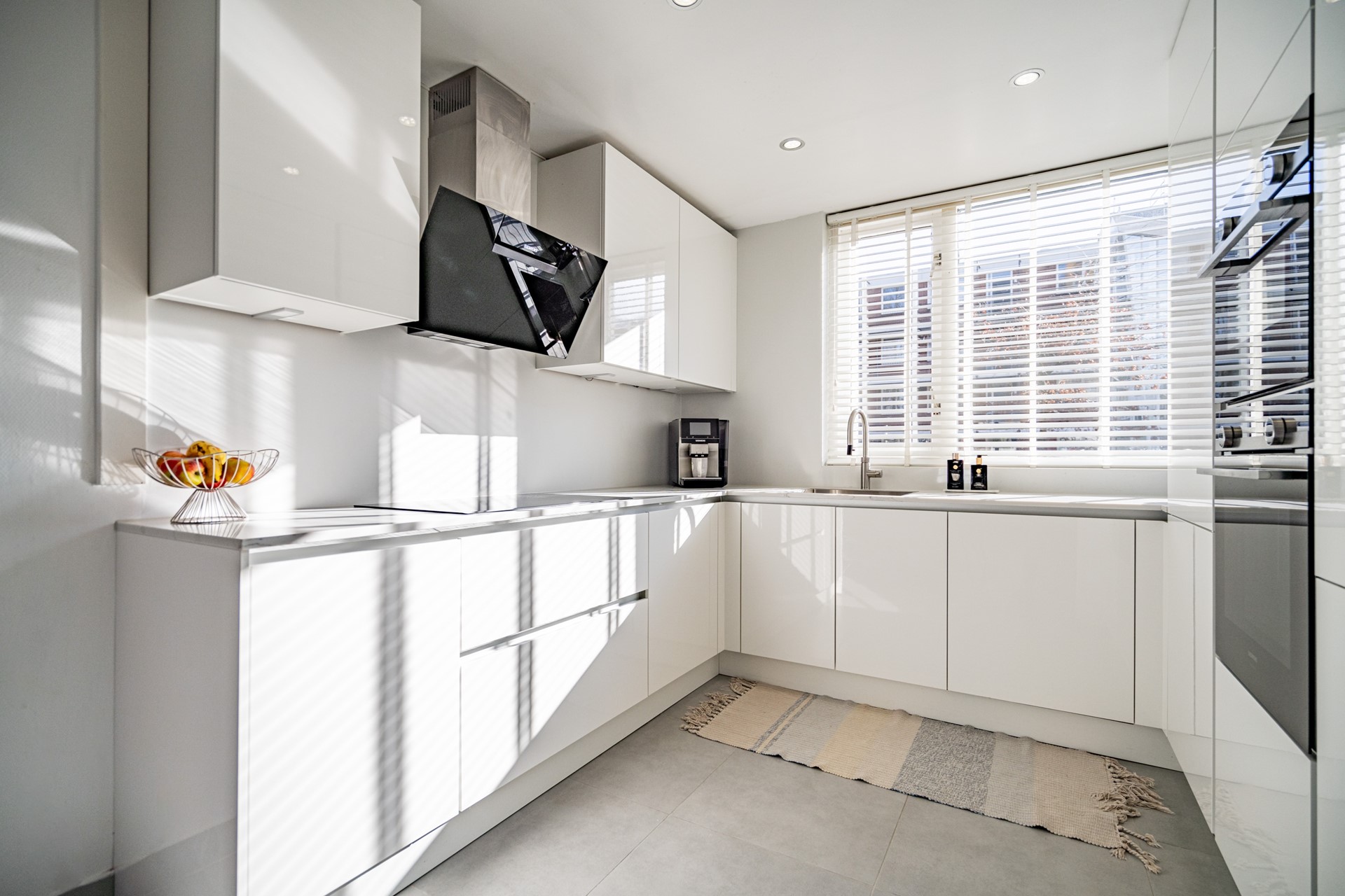 Aan de voorzijde van de woning bevindt zich de luxe open keuken, voorzien van diverse inbouwapparatuur waaronder een elektrische kookplaat, strak afgewerkte afzuigkap, vaatwasser, Quooker, ingebouwde koelkast en een dubbele combi-oven.