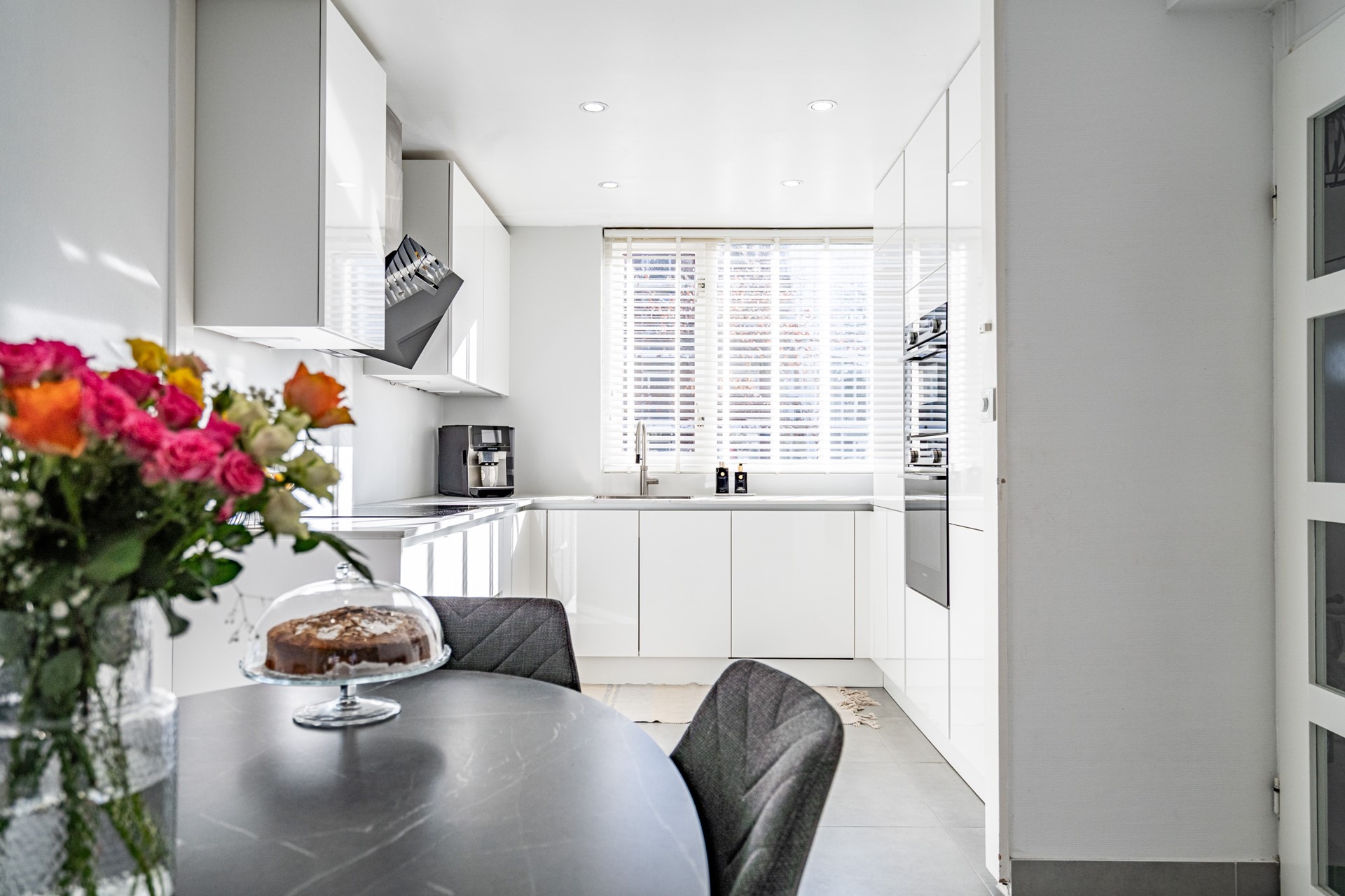 At the front of the house is the luxurious open-plan kitchen, equipped with various built-in appliances including an electric cooktop, sleek extractor hood, dishwasher, Quooker tap, integrated refrigerator and a double combi oven.