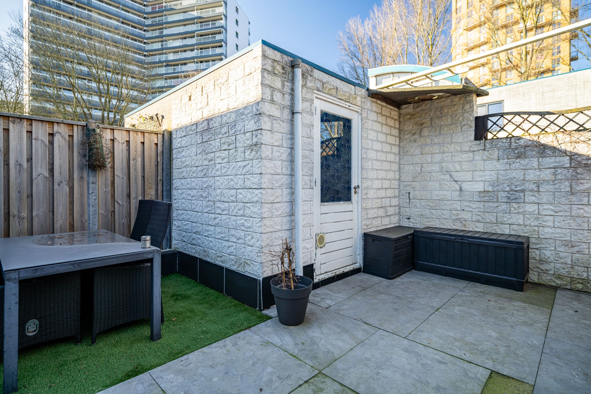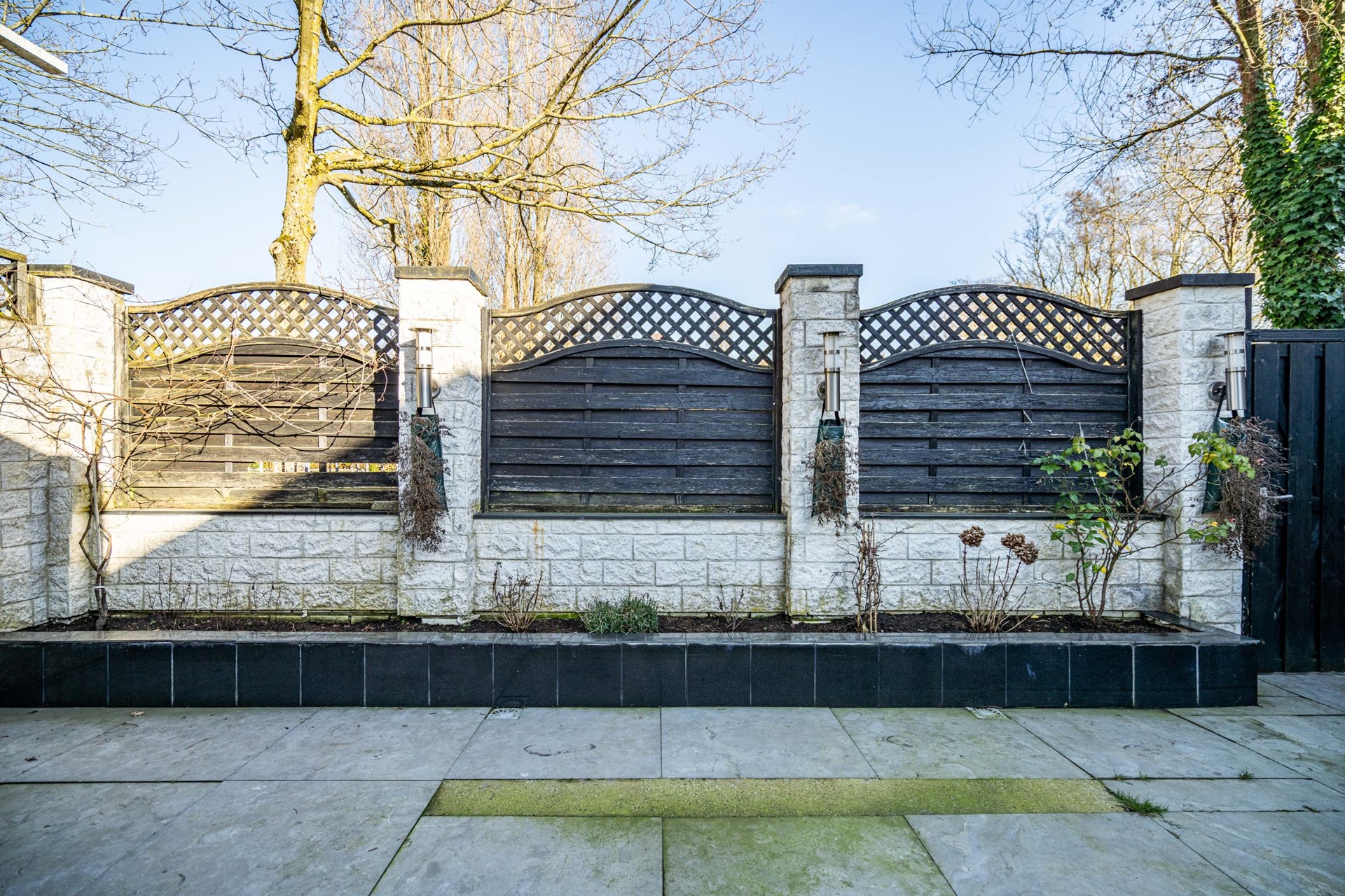 From the living room you access the north-facing rear garden. The garden is low-maintenance, finished with paving and a section of artificial grass. Thanks to its depth, you can enjoy both sun and shade throughout the day. At the rear of the garden there is a stone storage shed of approximately 11 m². Furthermore, the garden features a covered terrace with glass panels, allowing you to enjoy outdoor living all year round.