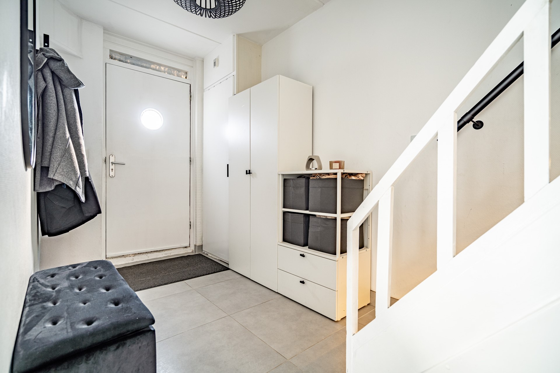 Upon entering, you arrive in the hallway with access to the utility meter cupboard and the modern toilet with wall-mounted closet and washbasin.