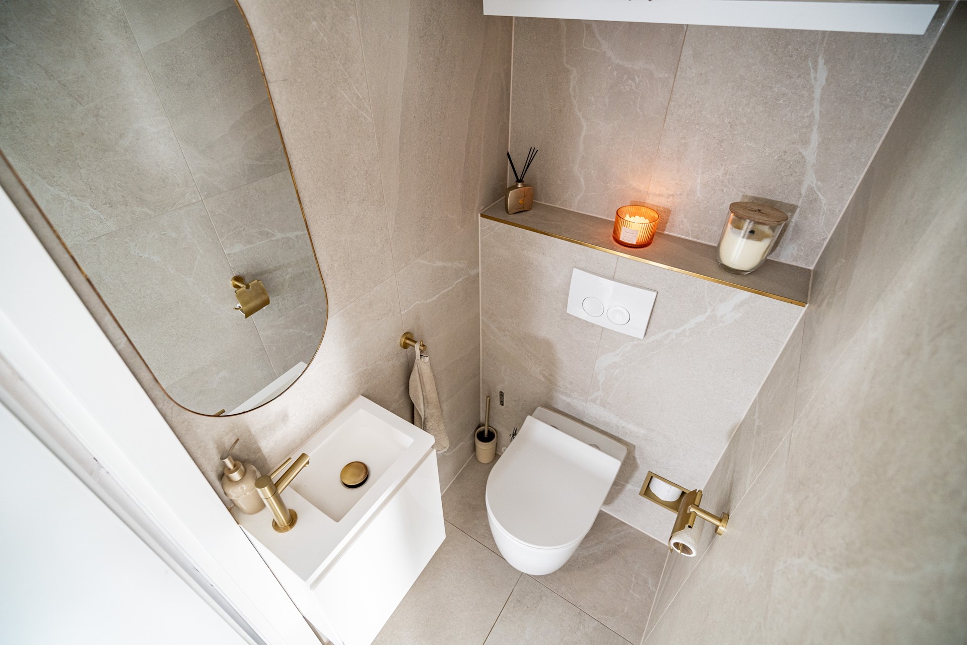 Via de entree komt u binnen in de hal met toegang tot de meterkast en het modern afgewerkte toilet met zwevend closet en fonteintje.