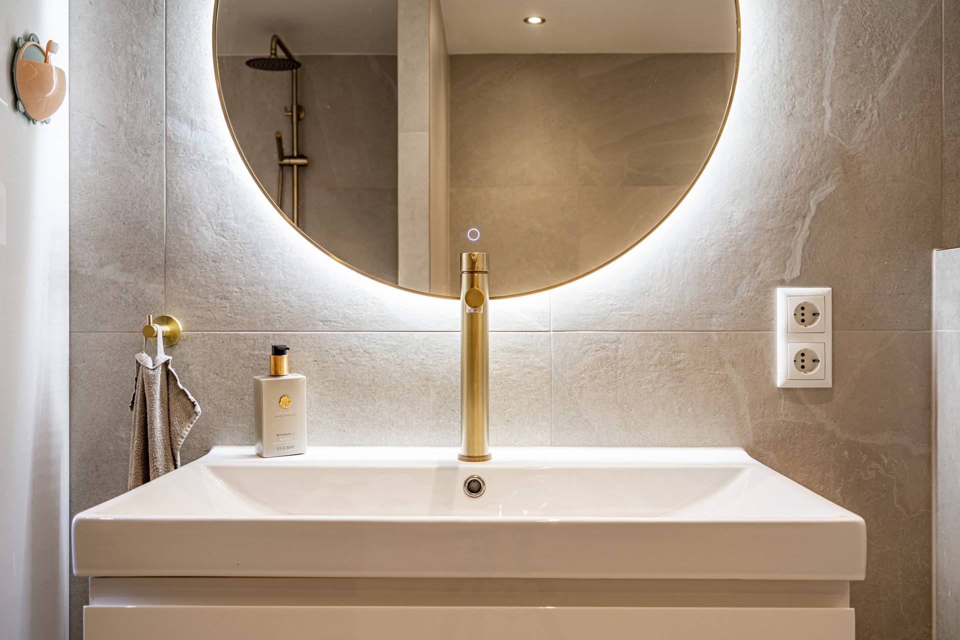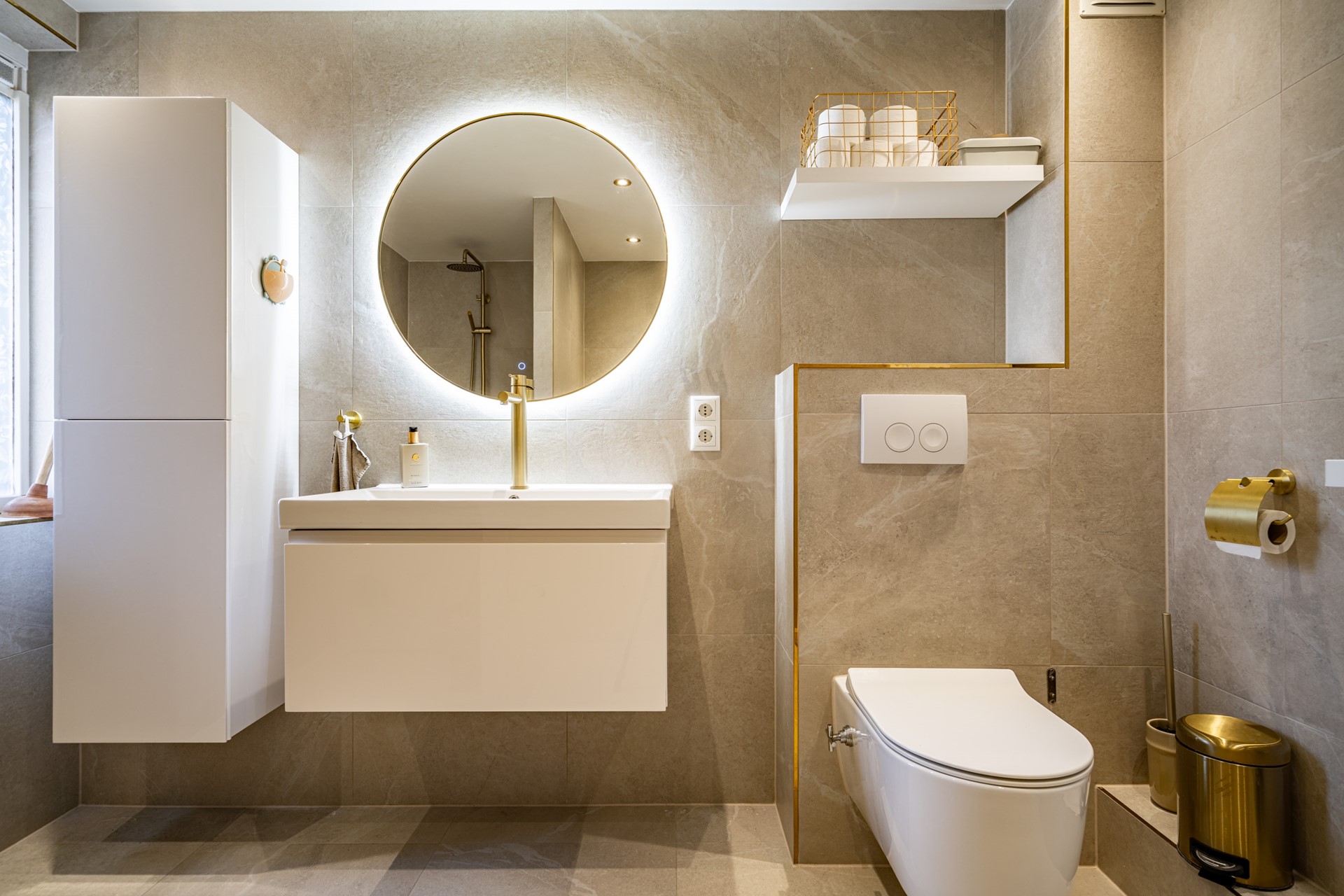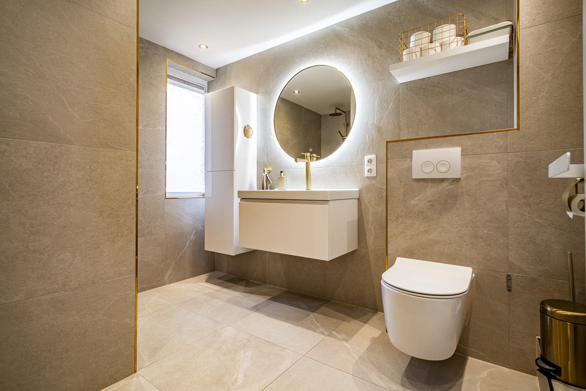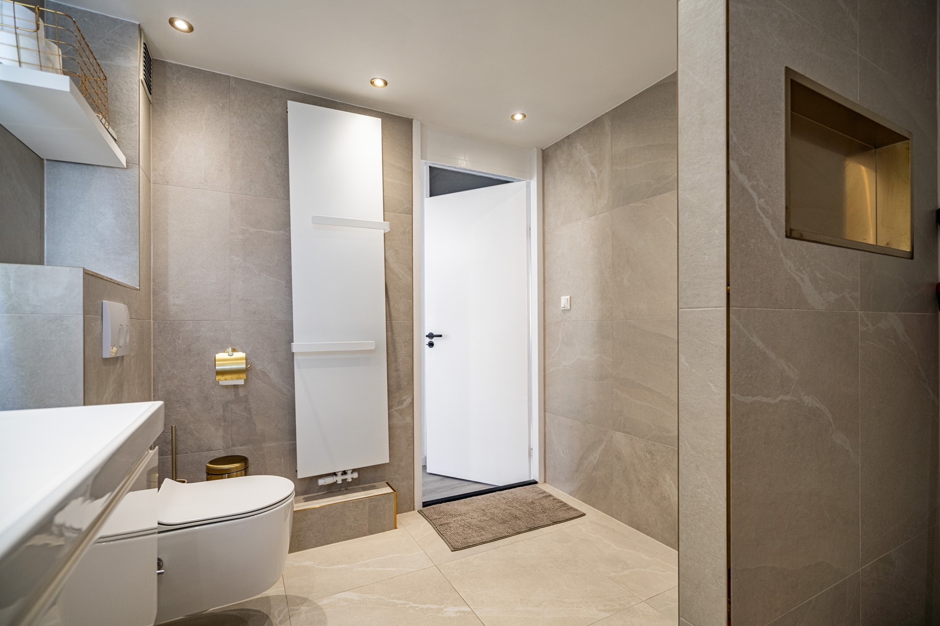 De centraal gelegen badkamer is luxe uitgevoerd en voorzien van een zwevend toilet, een ruime inloopdouche met strak afgewerkte douchenis en een modern badmeubel dat perfect aansluit bij de stijl van de woning. De overloop biedt toegang tot alle vertrekken op deze verdieping.