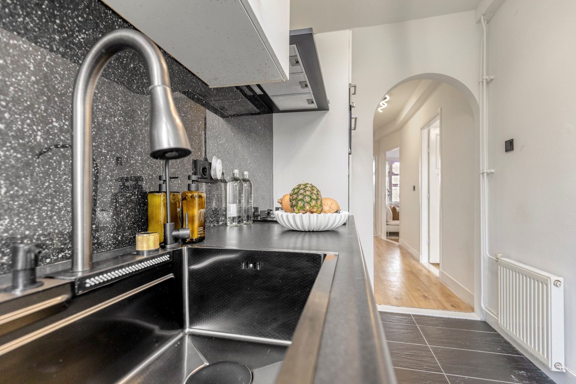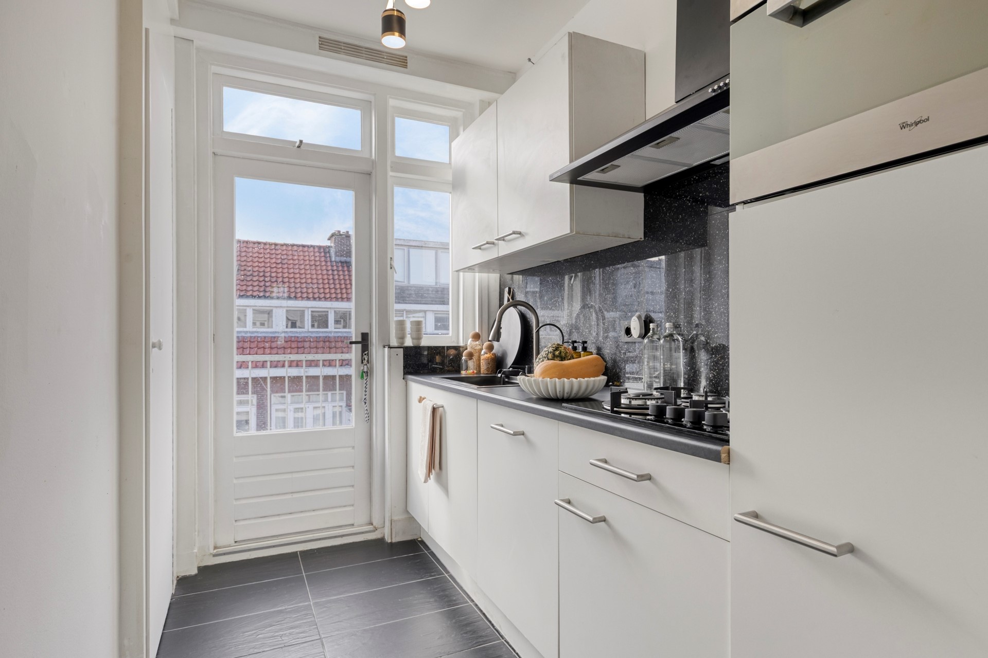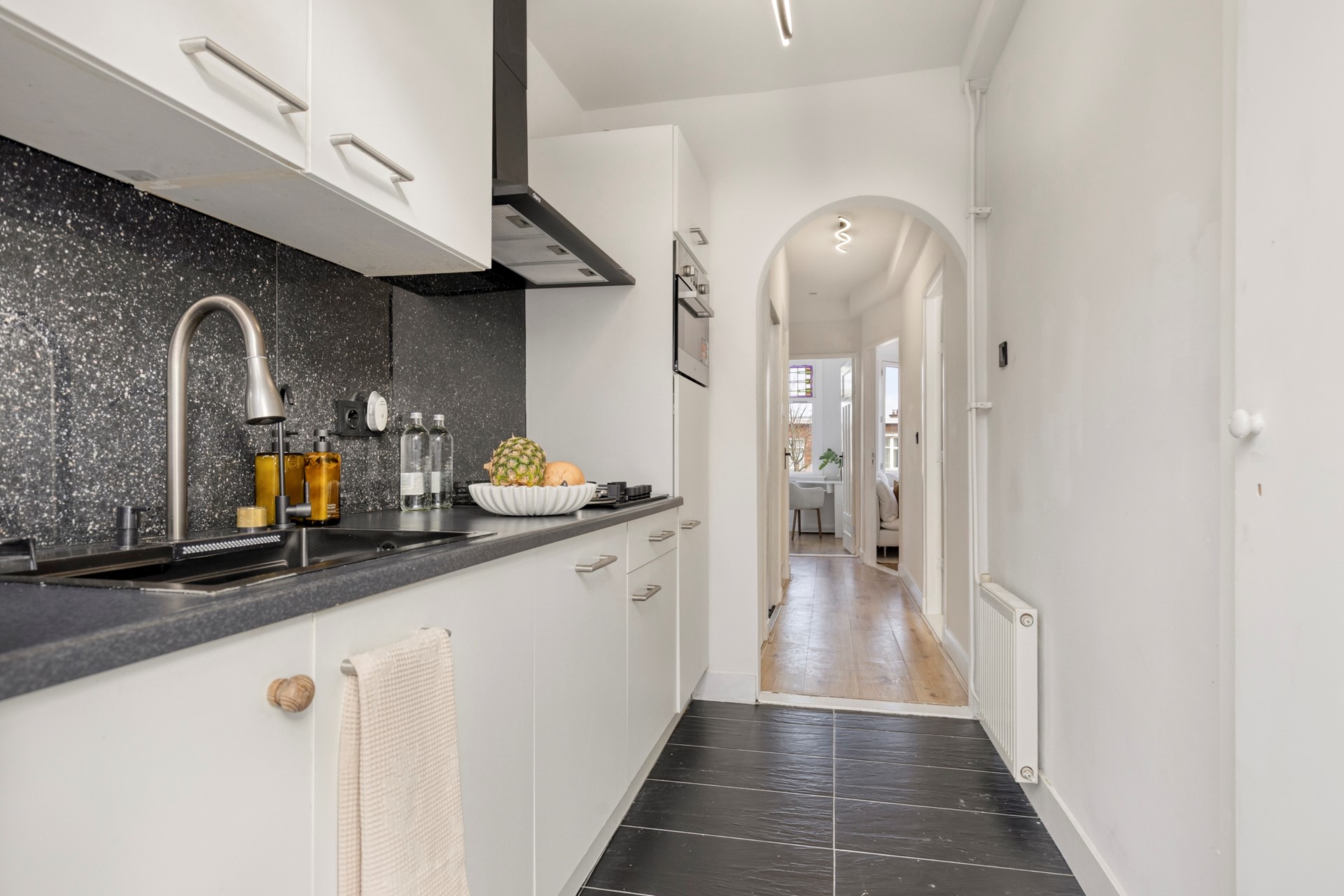 De moderne keuken sluit mooi aan op de leefruimte en is voorzien van een ingebouwde koelkast, een nieuwe oven en een multifunctionele spoelbak met glazenspoelgedeelte. Het recent vernieuwde werkblad geeft de keuken een frisse en verzorgde uitstraling. Vanuit de keuken is er direct toegang tot het zonnige balkon op het zuidwesten, een fijne plek om de dag rustig te beginnen of even te ontspannen.