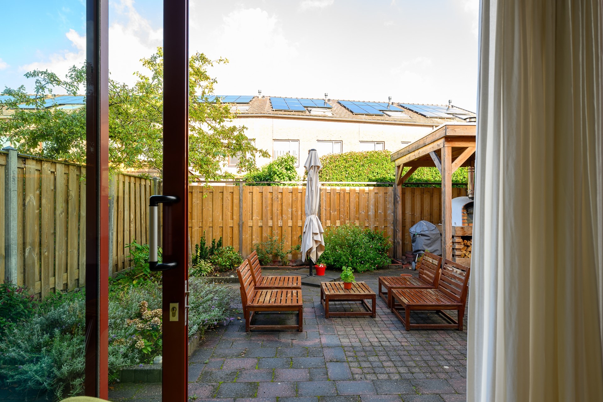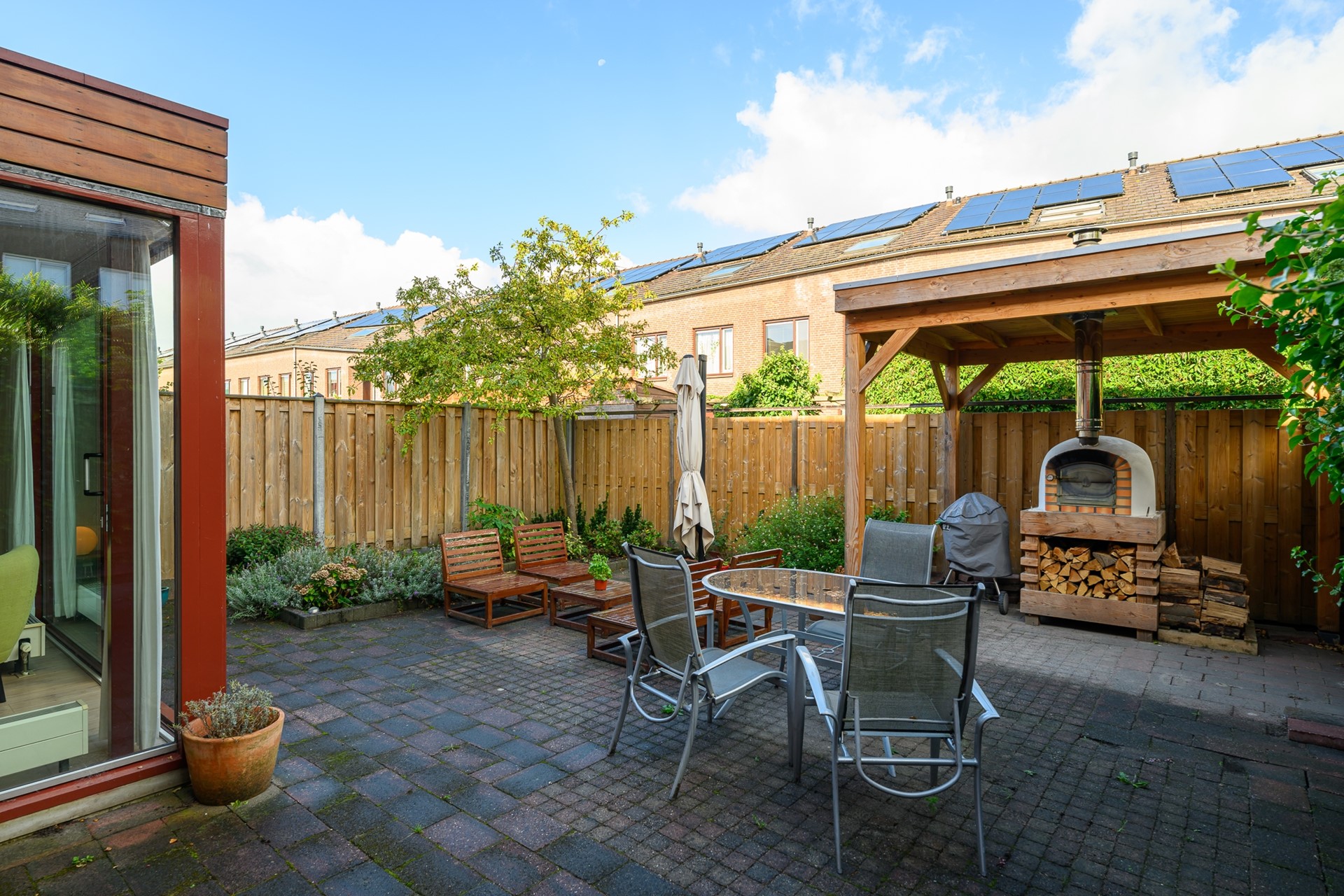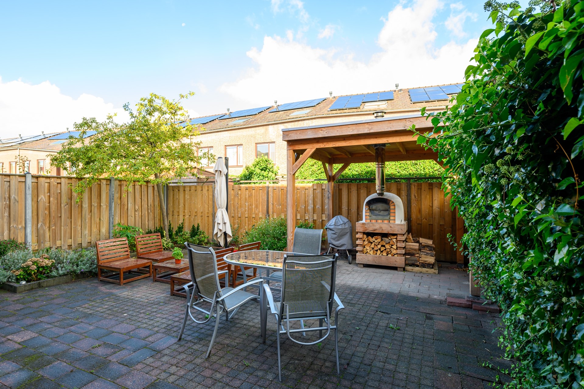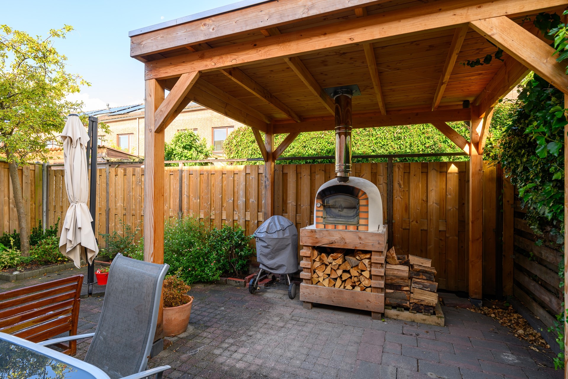 • Zonnige, onderhoudsvriendelijke tuin met overkapping en pizza-oven