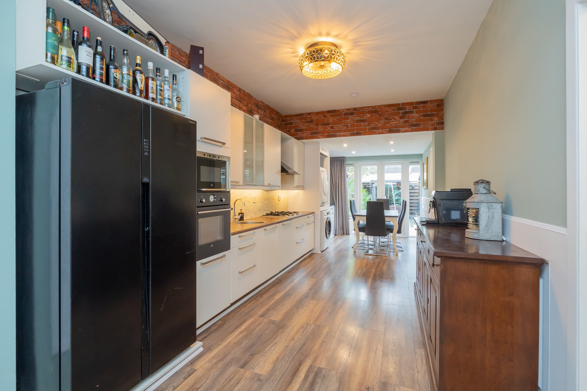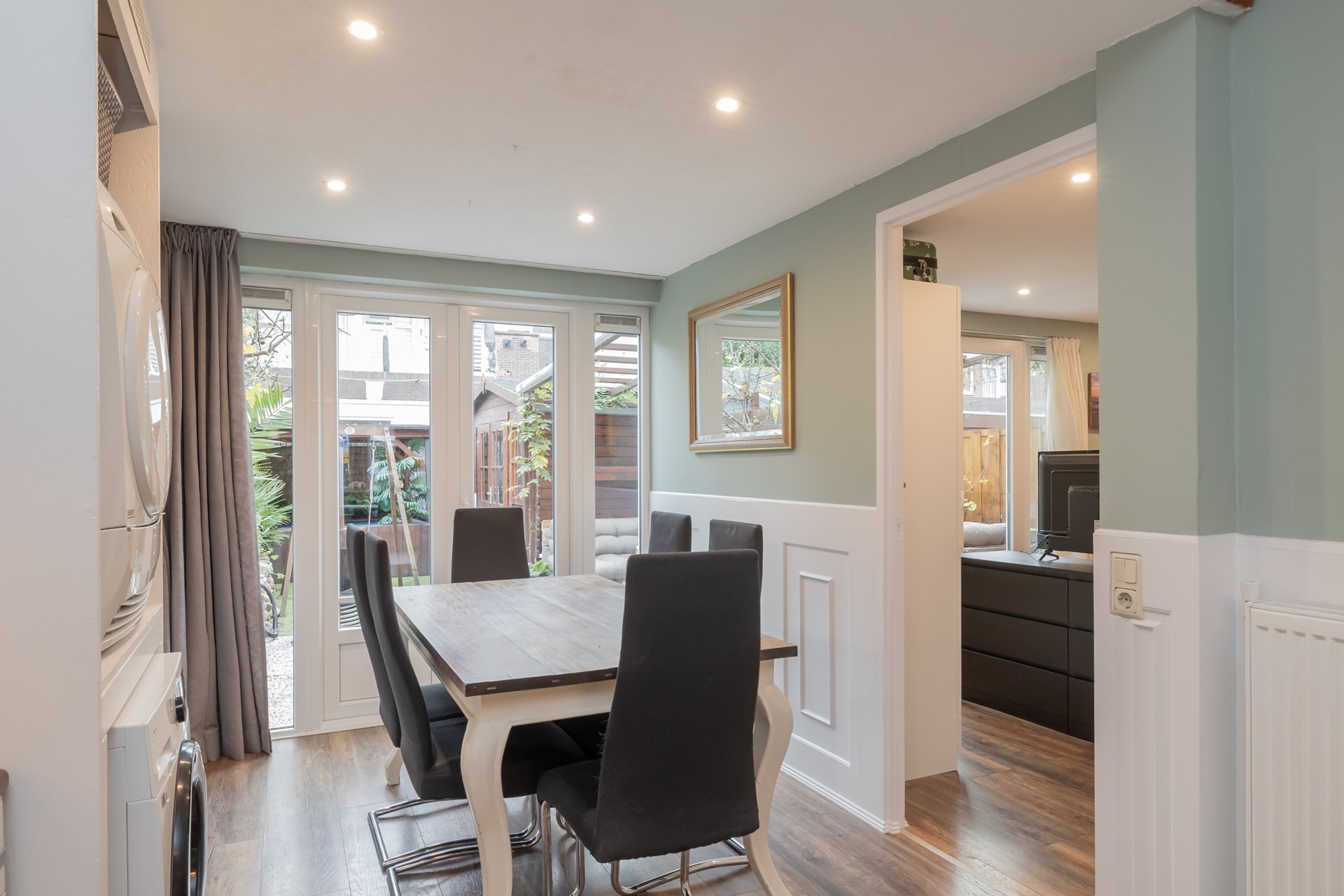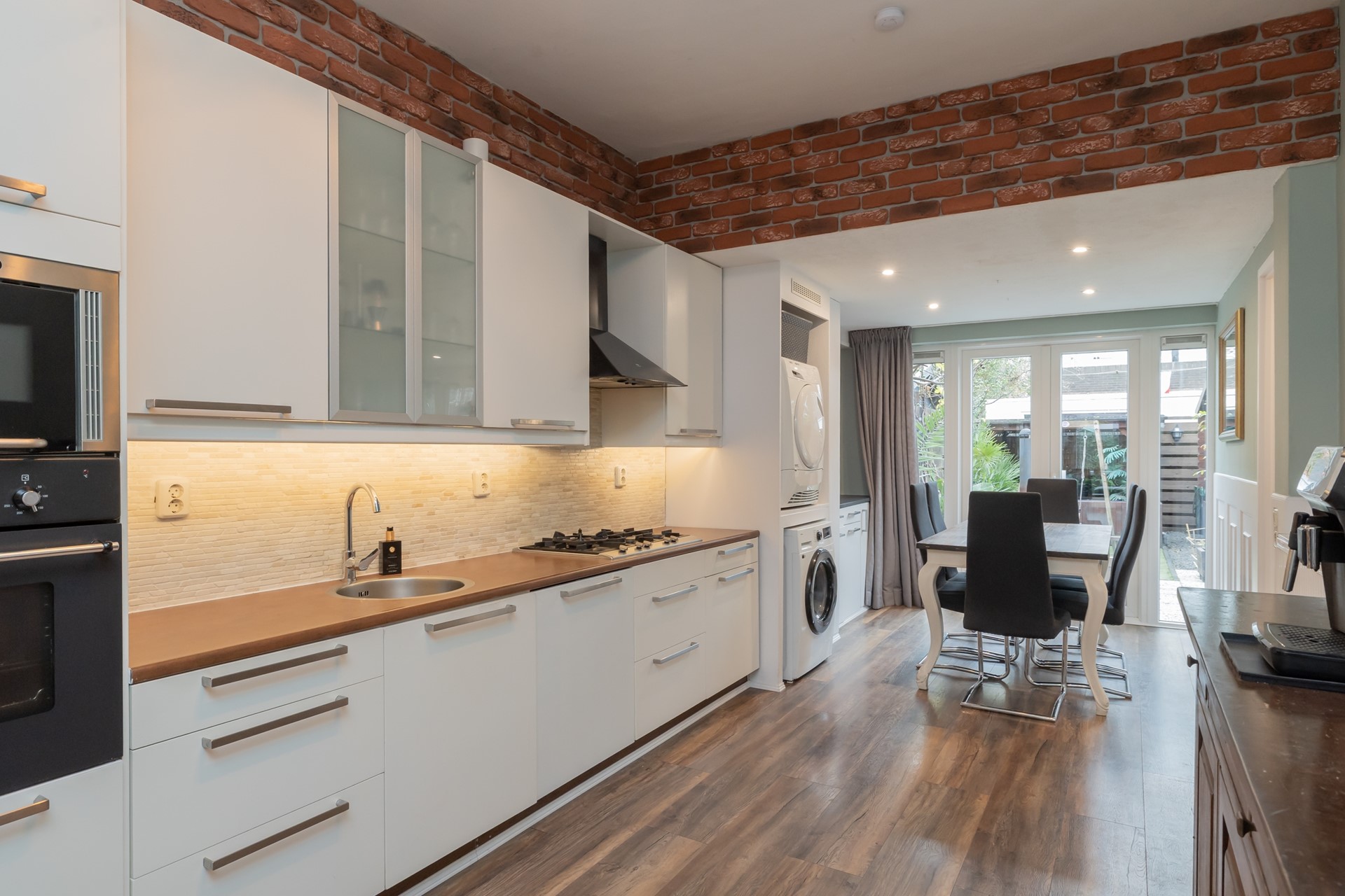 De woonkamer is gezellig ingedeeld met een zitgedeelte aan de voorzijde en een eetkamer met open keuken aan de achterzijde. De keuken is uitgerust met een oven, magnetron, vaatwasser, gasfornuis, afzuigkap en een ruime Amerikaanse koelkast. Naast de keuken is plek voor wasmachine en droger. Vanuit de woonkamer bereik je de derde slaapkamer, met uitzicht op de tuin.
