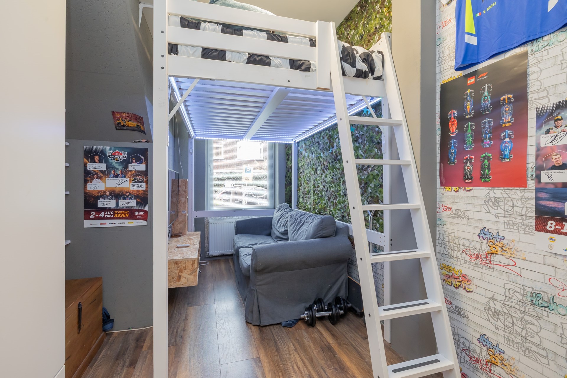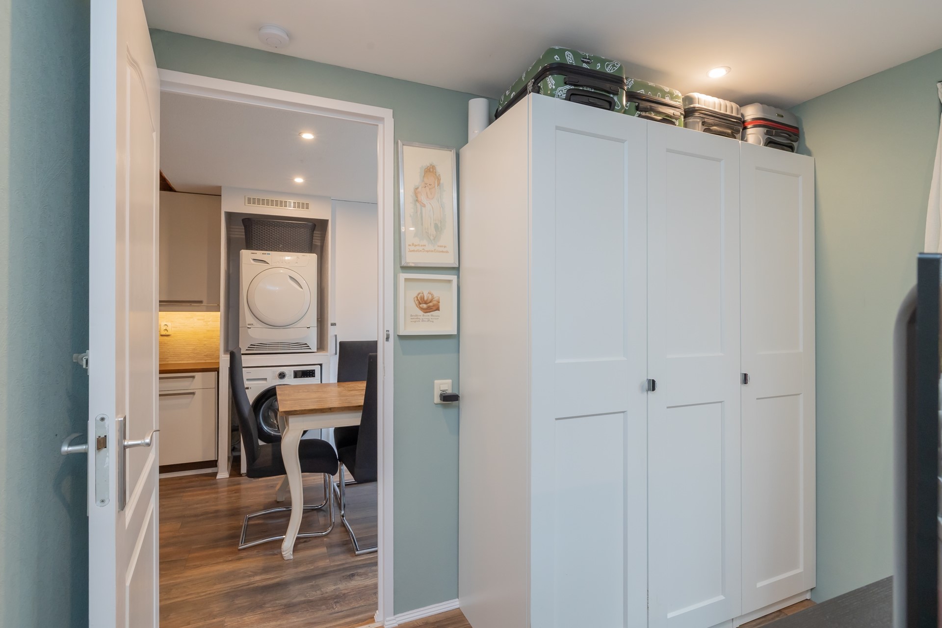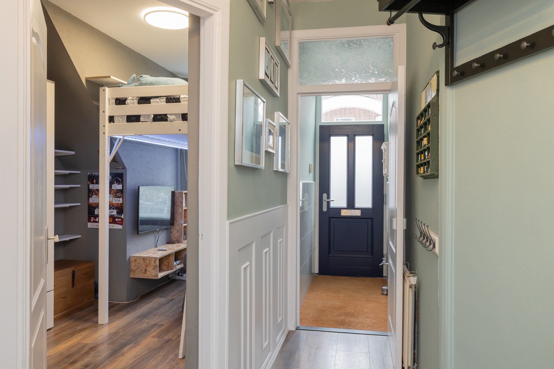 Via de voortuin stap je binnen in het tochtportaal, gevolgd door een hal die toegang biedt tot de vertrekken. Aan de voorzijde bevindt zich een slaapkamer met veel lichtinval, daarnaast een tweede slaapkamer die perfect is als kinderkamer of werkplek. De moderne badkamer (vernieuwd in 2023) is compact maar compleet, voorzien van een inloopdouche, wastafelmeubel, toilet en designradiator.