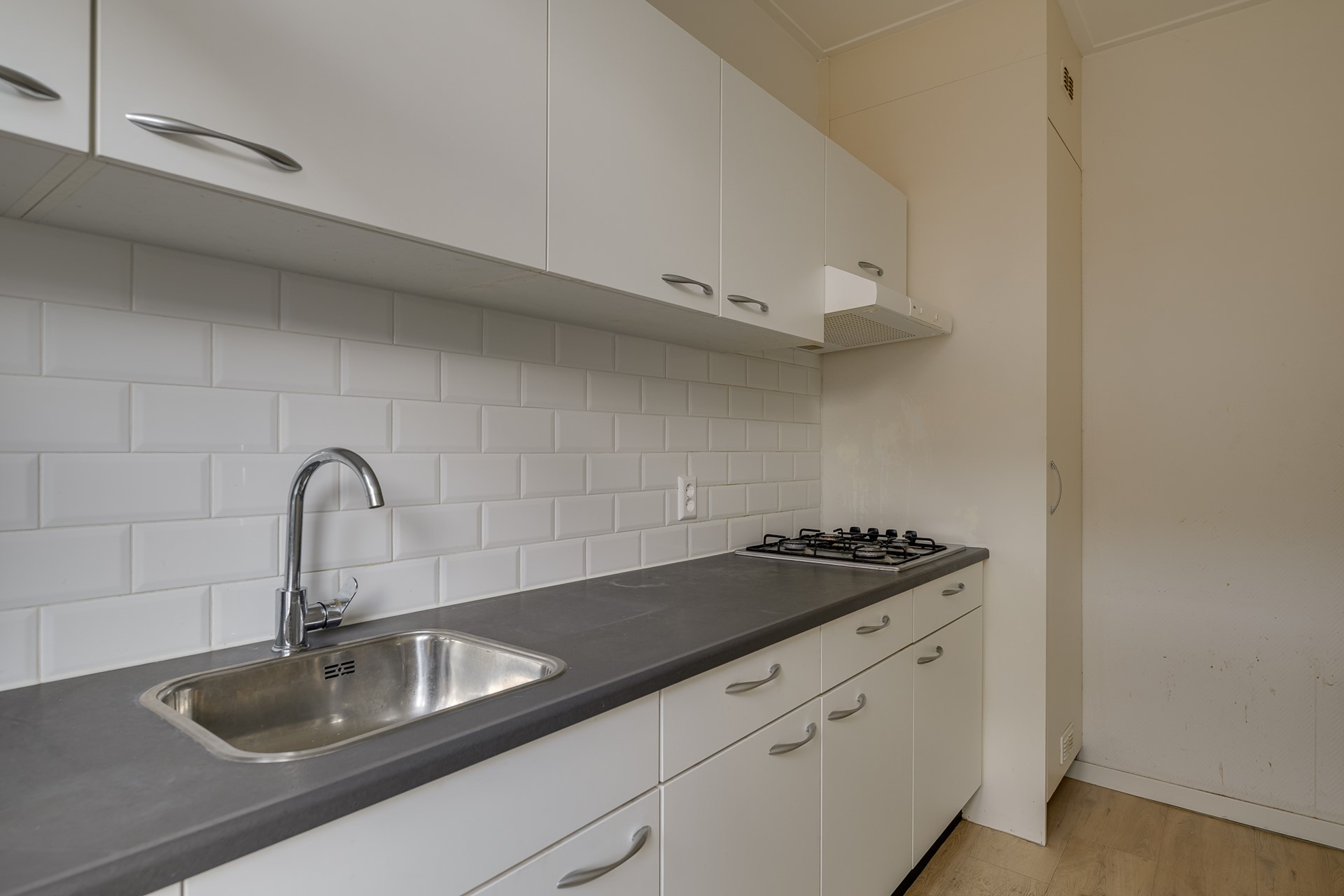 De keuken aan de achterzijde is overzichtelijk en strak met witte kastjes en een donker werkblad. Vanuit hier loop je zo door naar het balkon, waar je in de ochtend je kop koffie drinkt of in de avond nog even een frisse neus haalt.