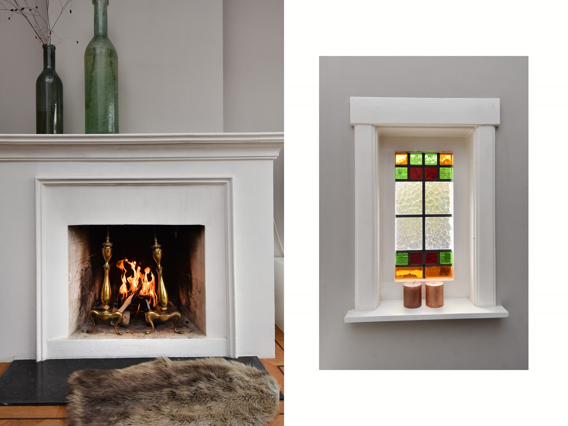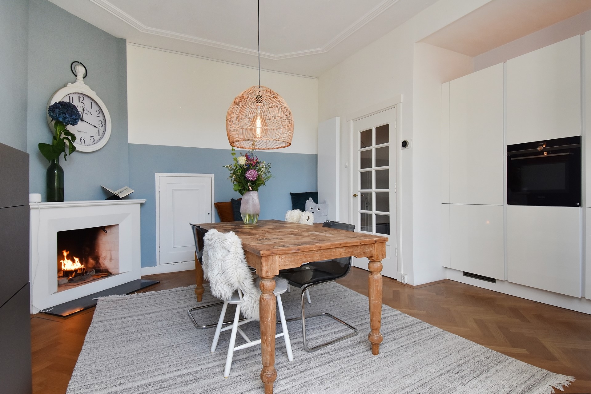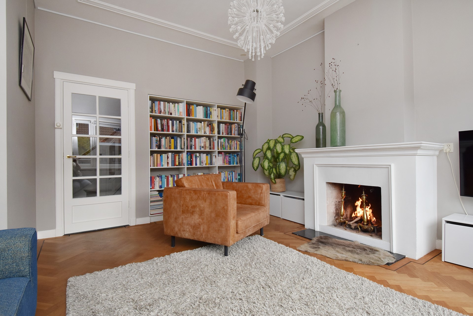 The first floor comprises a spacious living room at the front of the house, overlooking the wide Johannes Bildersstraat (one-way). This room is particularly charming, with a wood-burning fireplace, a small stained-glass window in the facade, and beautiful ornamentation on the ceiling.