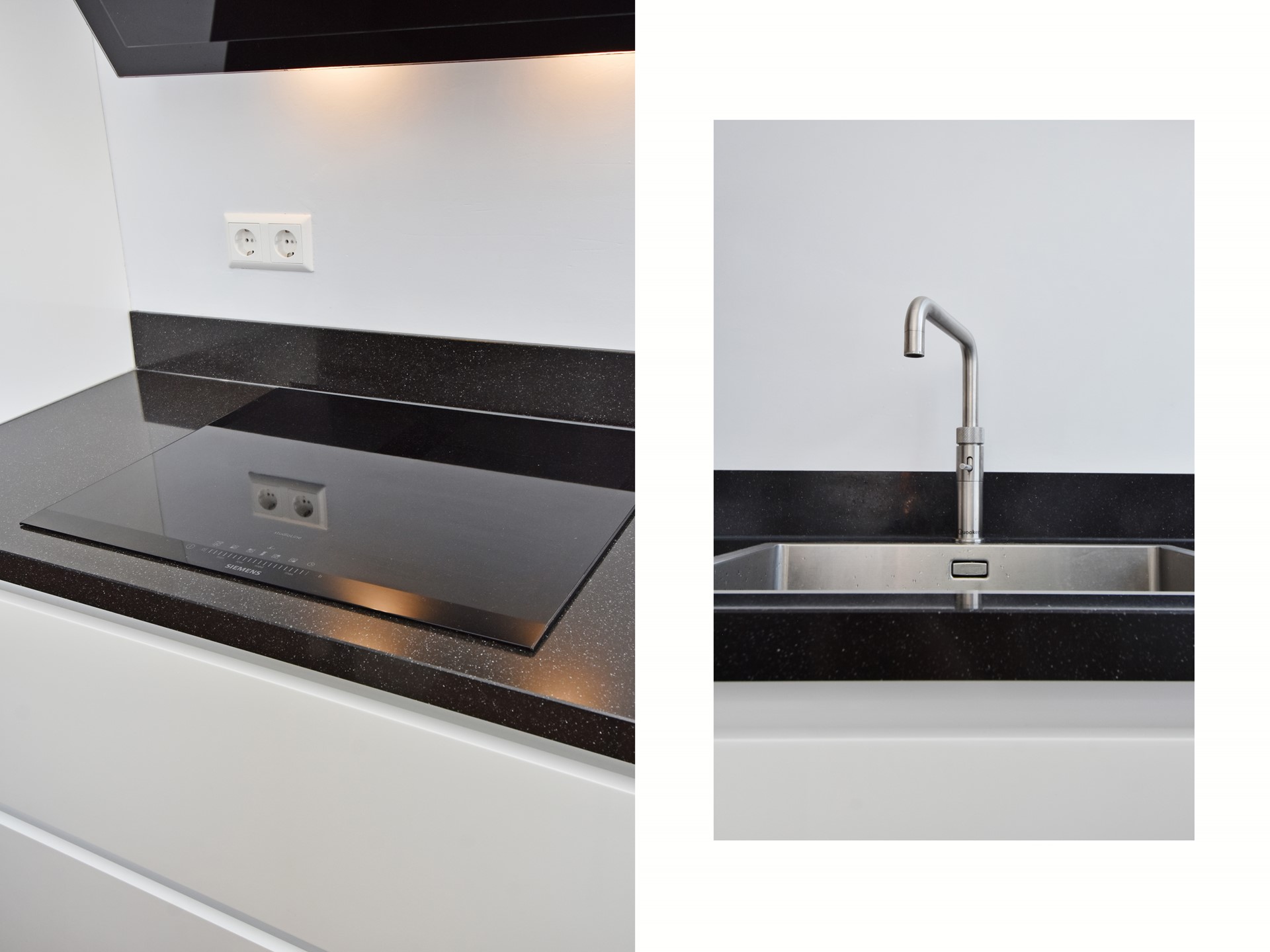 Aan de achterzijde van de woning bevindt zich een royale woonkeuken met toegang tot een knus balkon en wederom een sfeervolle houthaard. De moderne keuken is voorzien van een stenen aanrechtblad, voldoende kastruimte en diverse inbouwapparatuur van het merk Siemens. Koken doe je op een moderne inductie kookplaat.