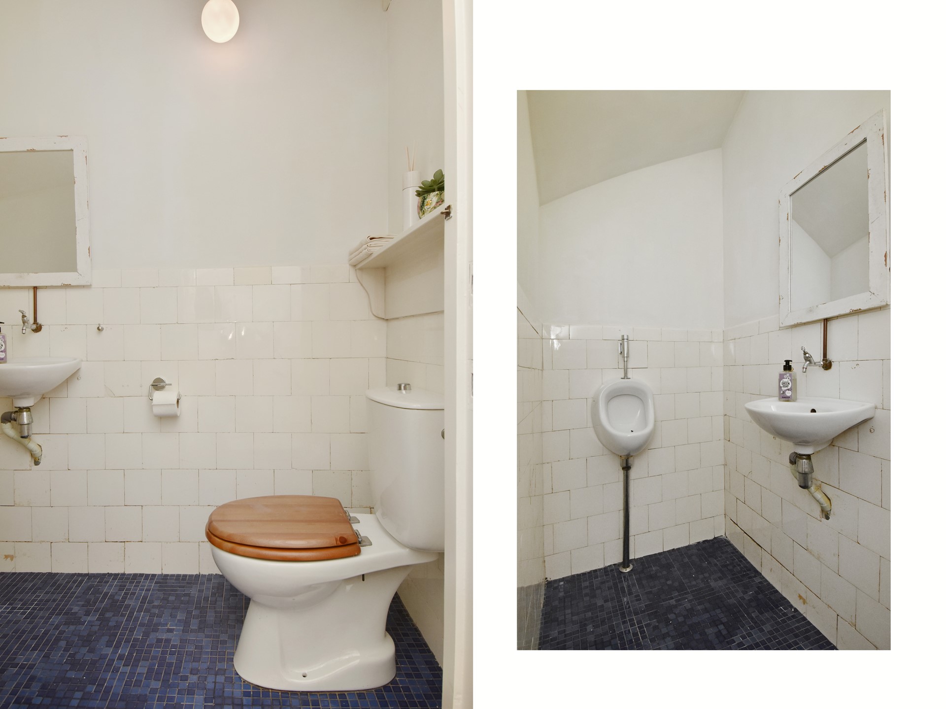 The spacious hall houses a toilet with a urinal and a small sink. The entire floor is finished with oak herringbone flooring with a border.