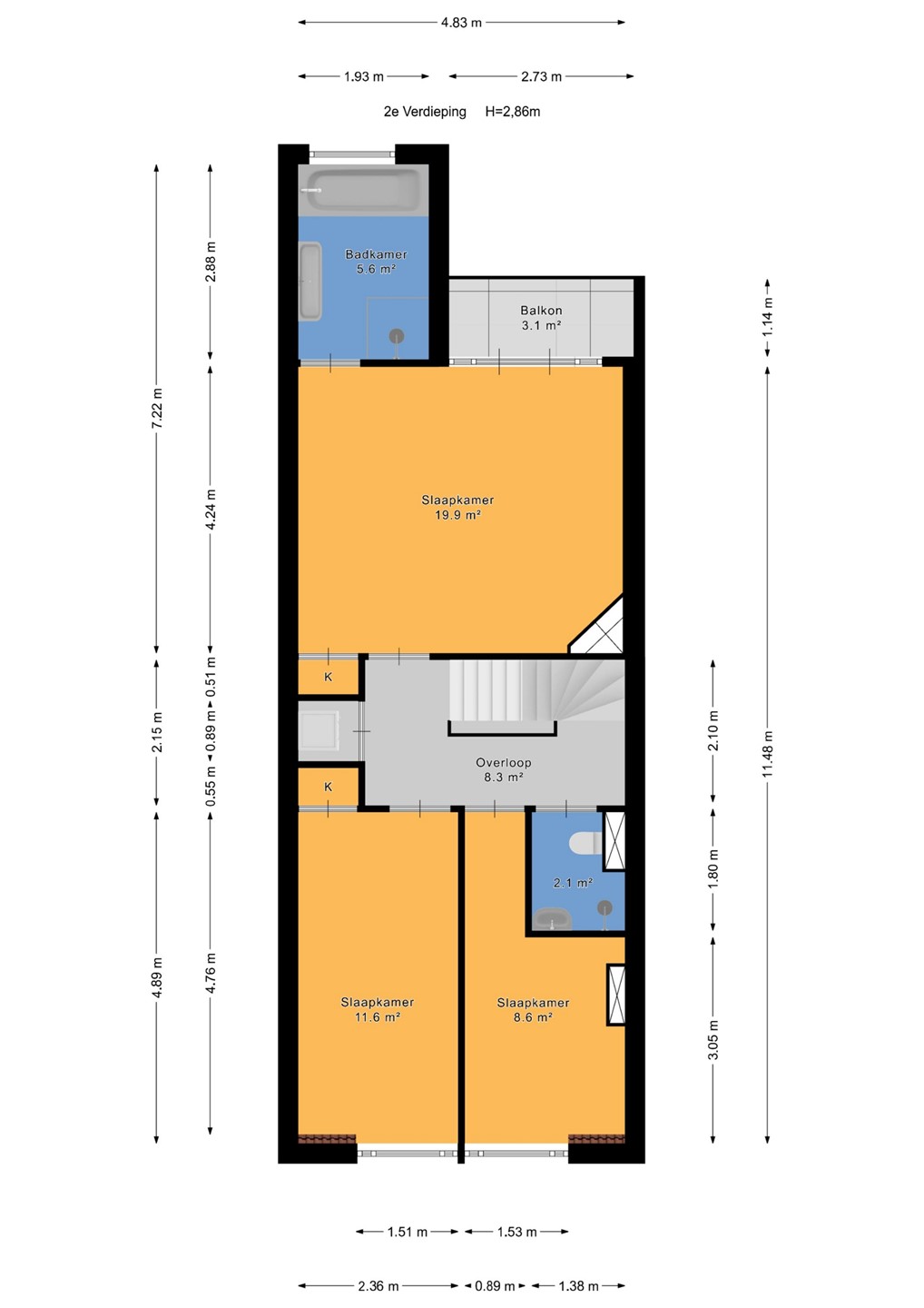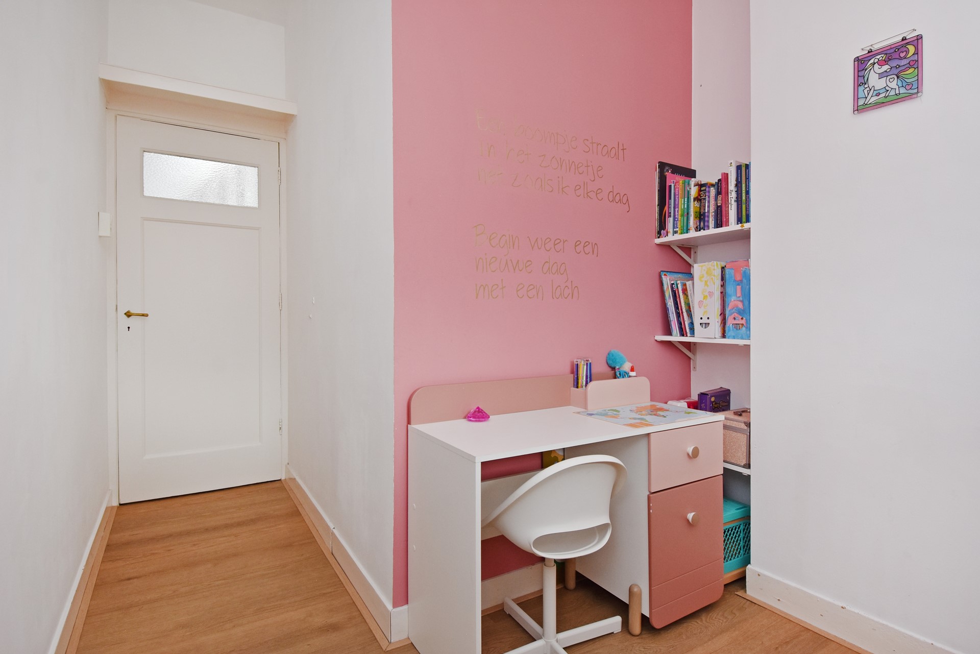 De slaapkamers hebben elk originele inbouwkasten en op de overloop is een kastruimte waarin zich de wasmachine en de CV-ketel bevinden.