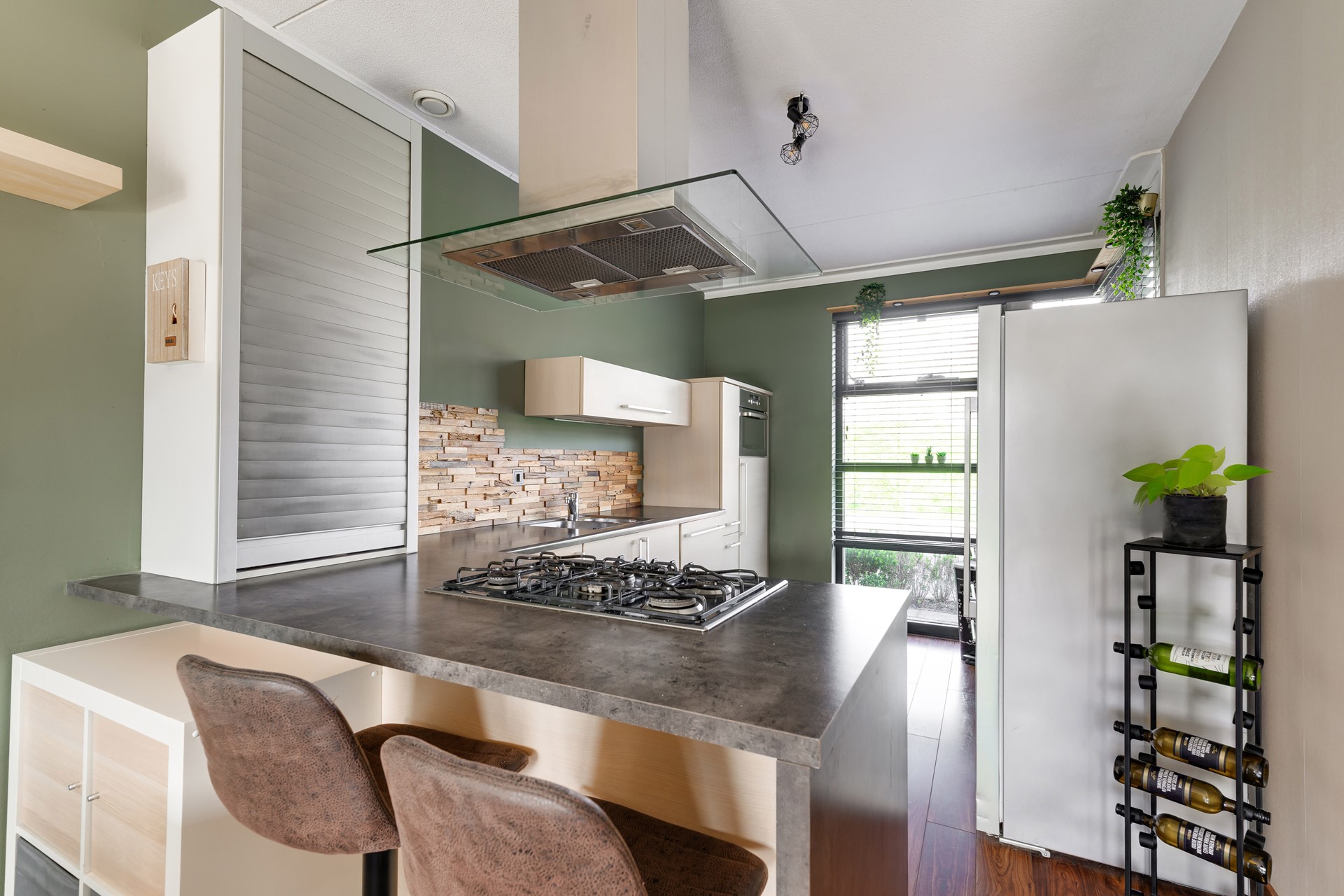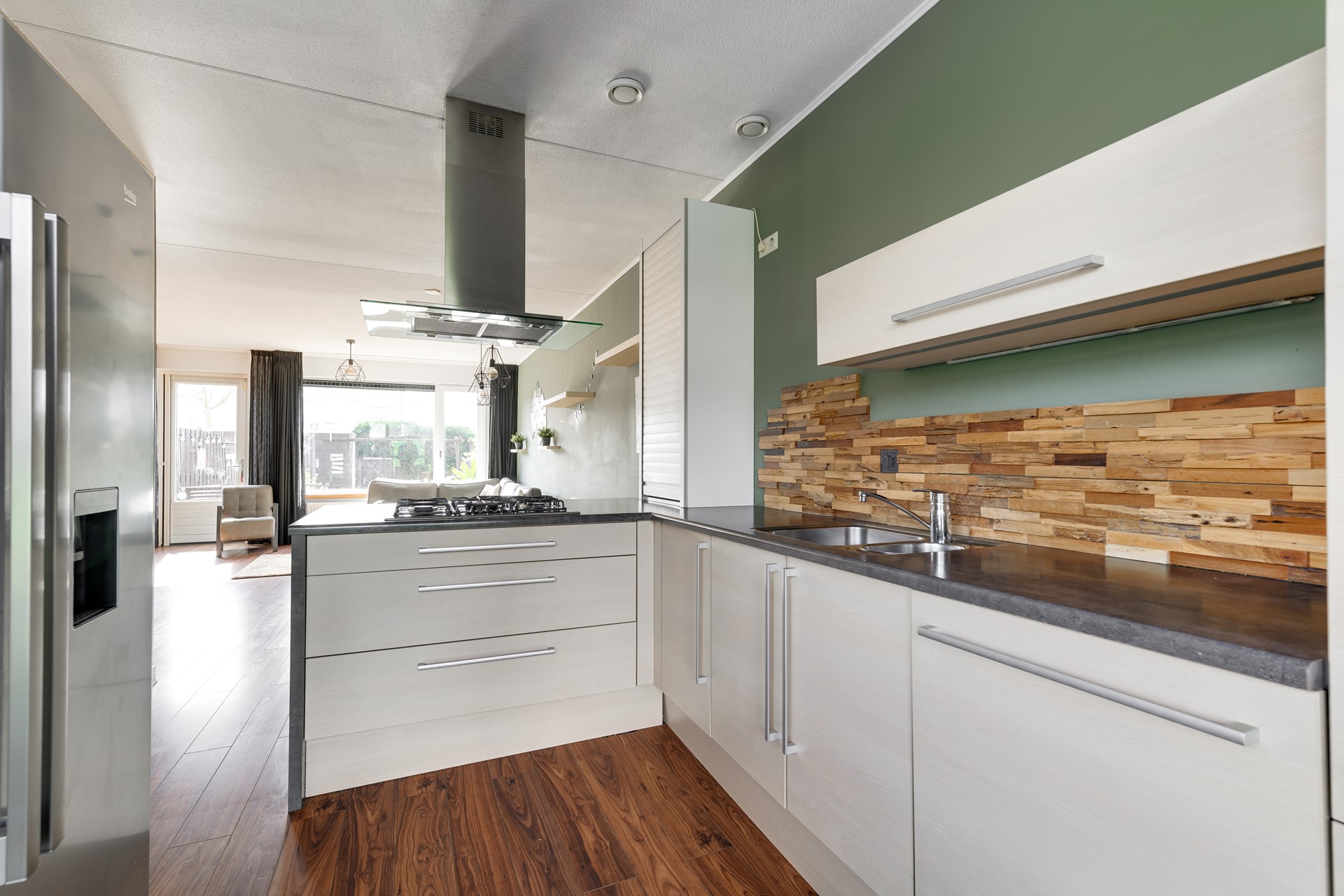De moderne open keuken met kookeiland is de plek waar de dag begint met koffie en eindigt met een goed glas wijn terwijl er wordt gekookt en bijgepraat. De woonkamer is heerlijk licht en staat in directe verbinding met de zonnige achtertuin. Hier geniet je van rust, privacy en genoeg ruimte voor een gezellige barbecue, spelende kinderen of simpelweg een moment voor jezelf in de zon.