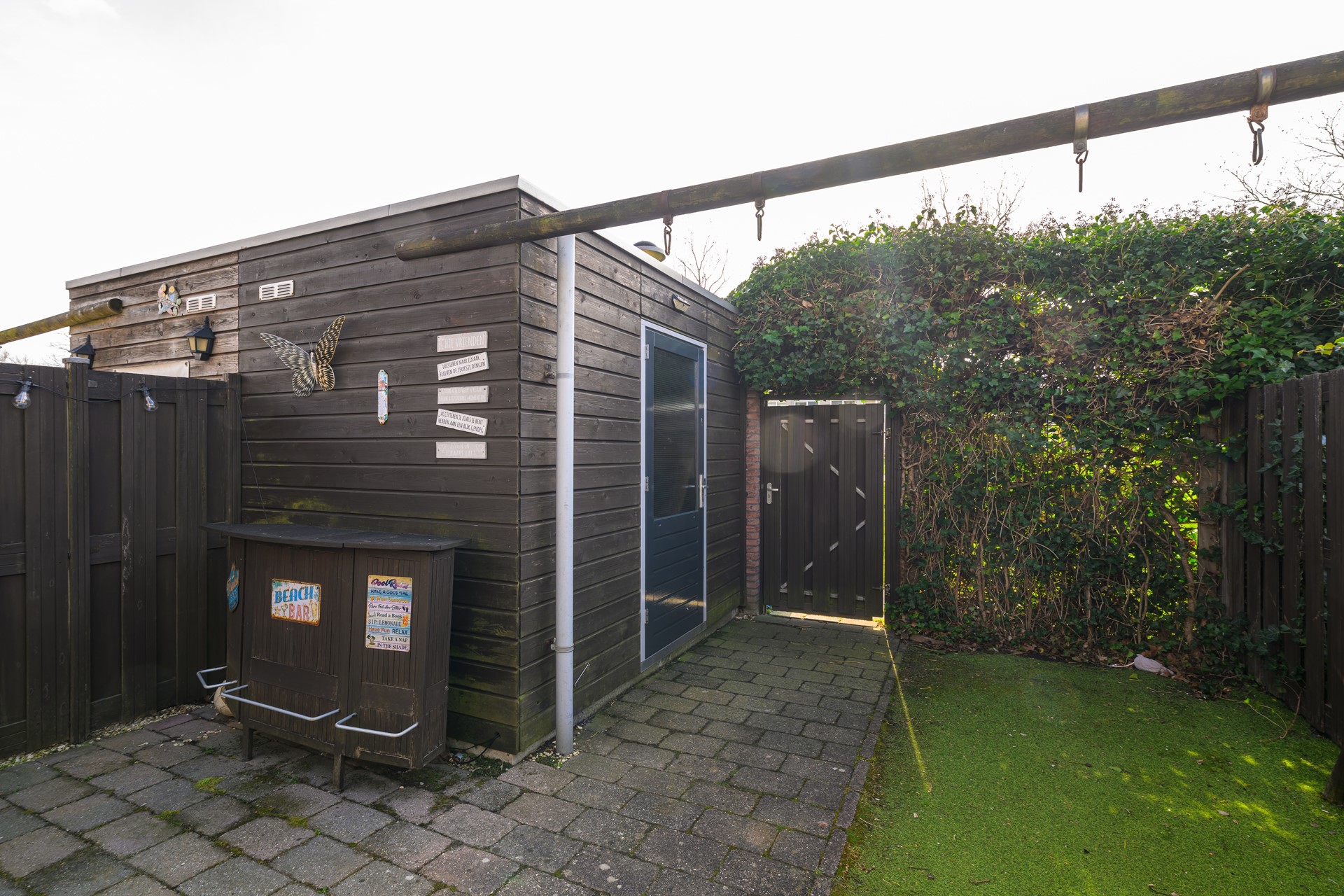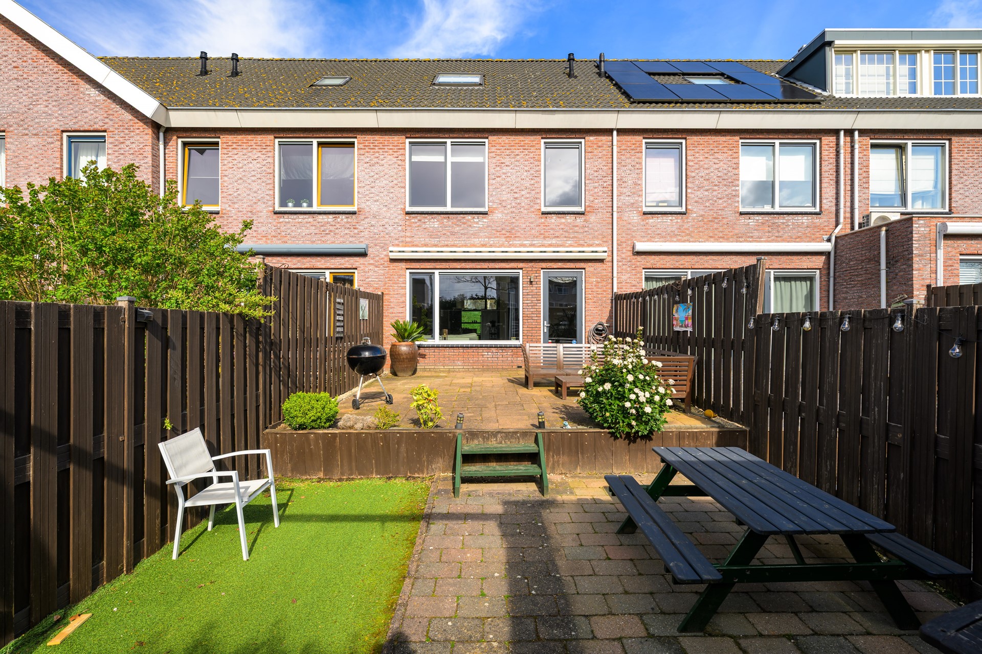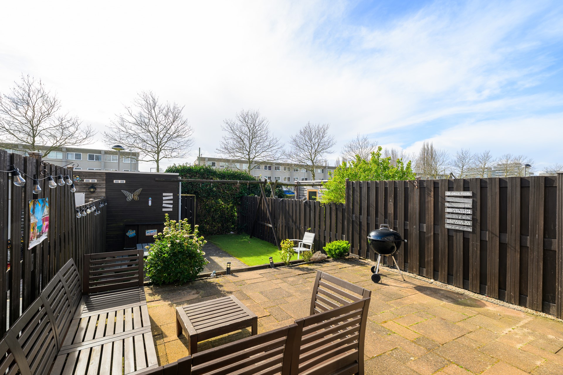 • Zonnige achtertuin met terras, groen en ruime berging