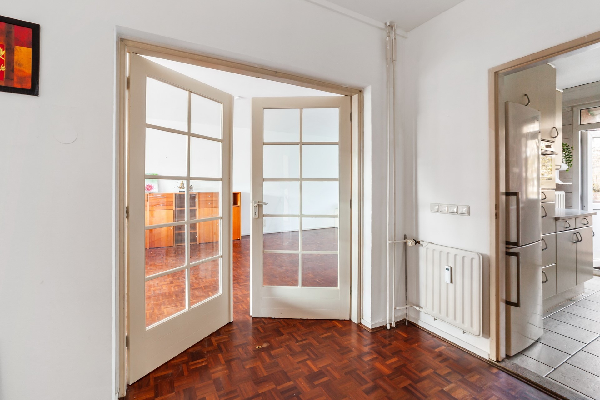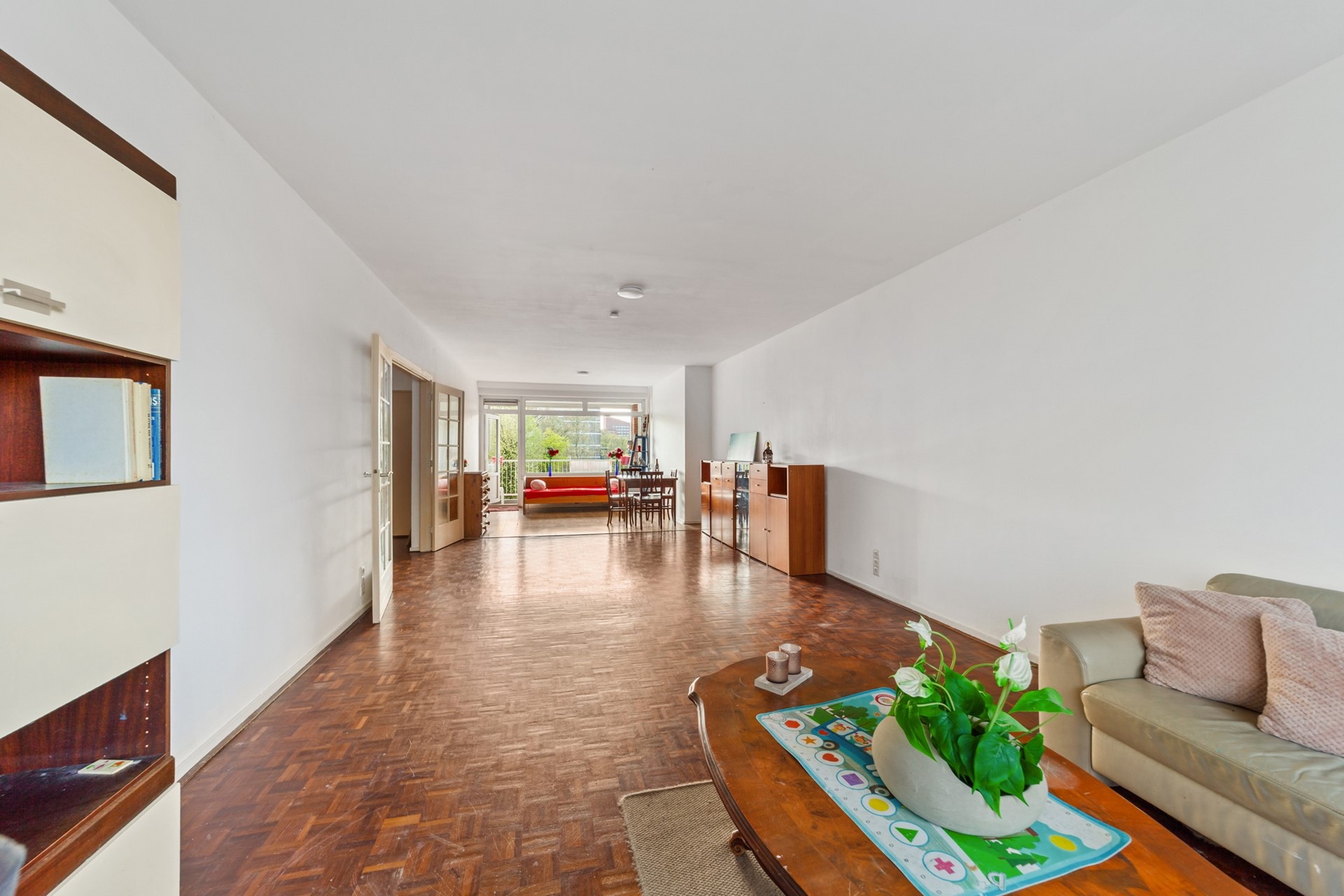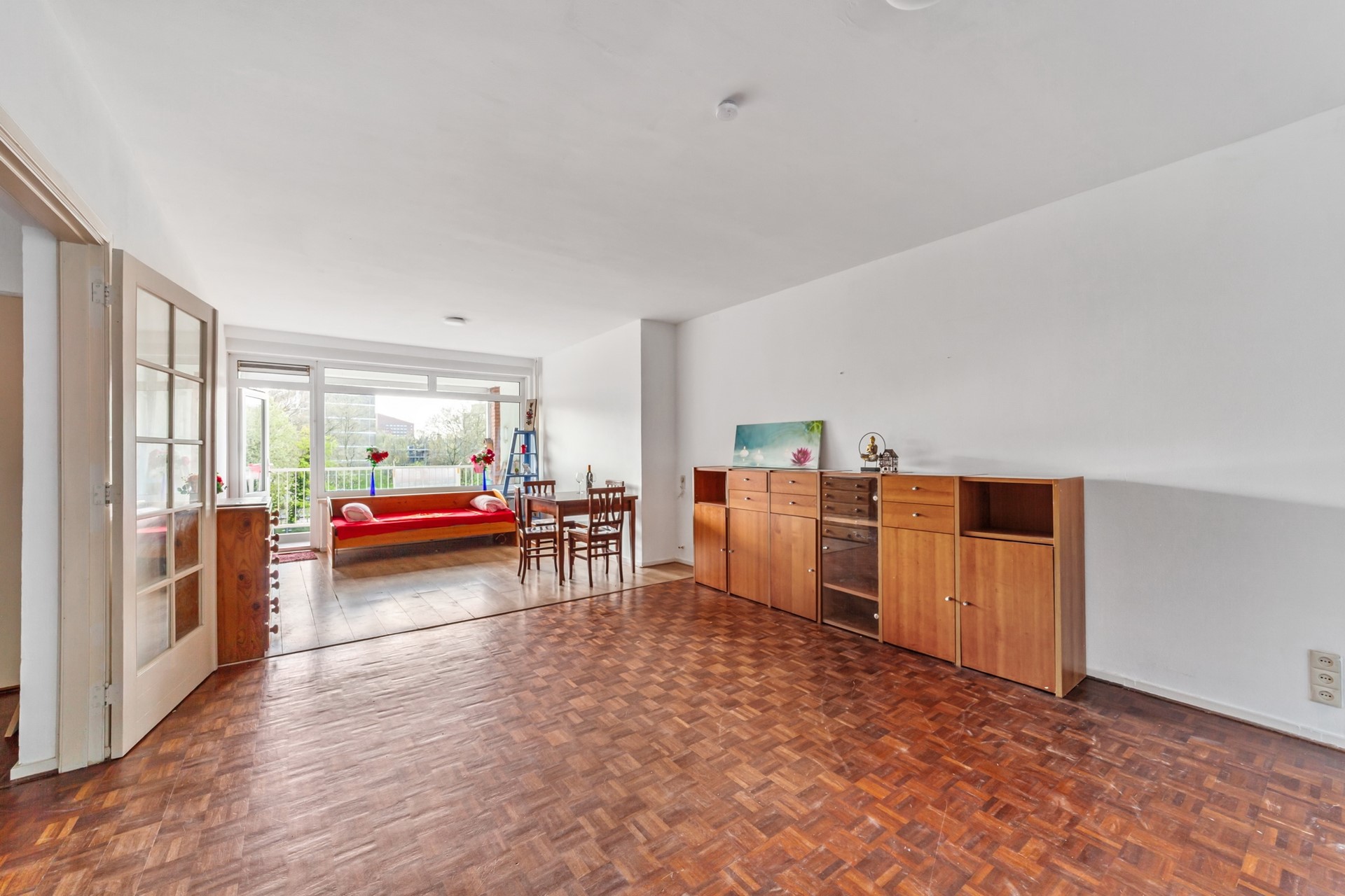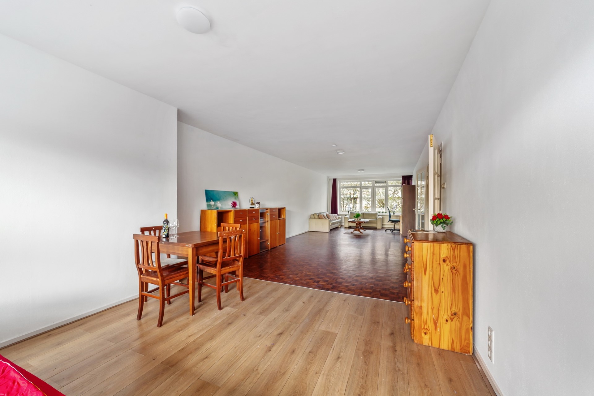 A large part of the living room features parquet flooring.
