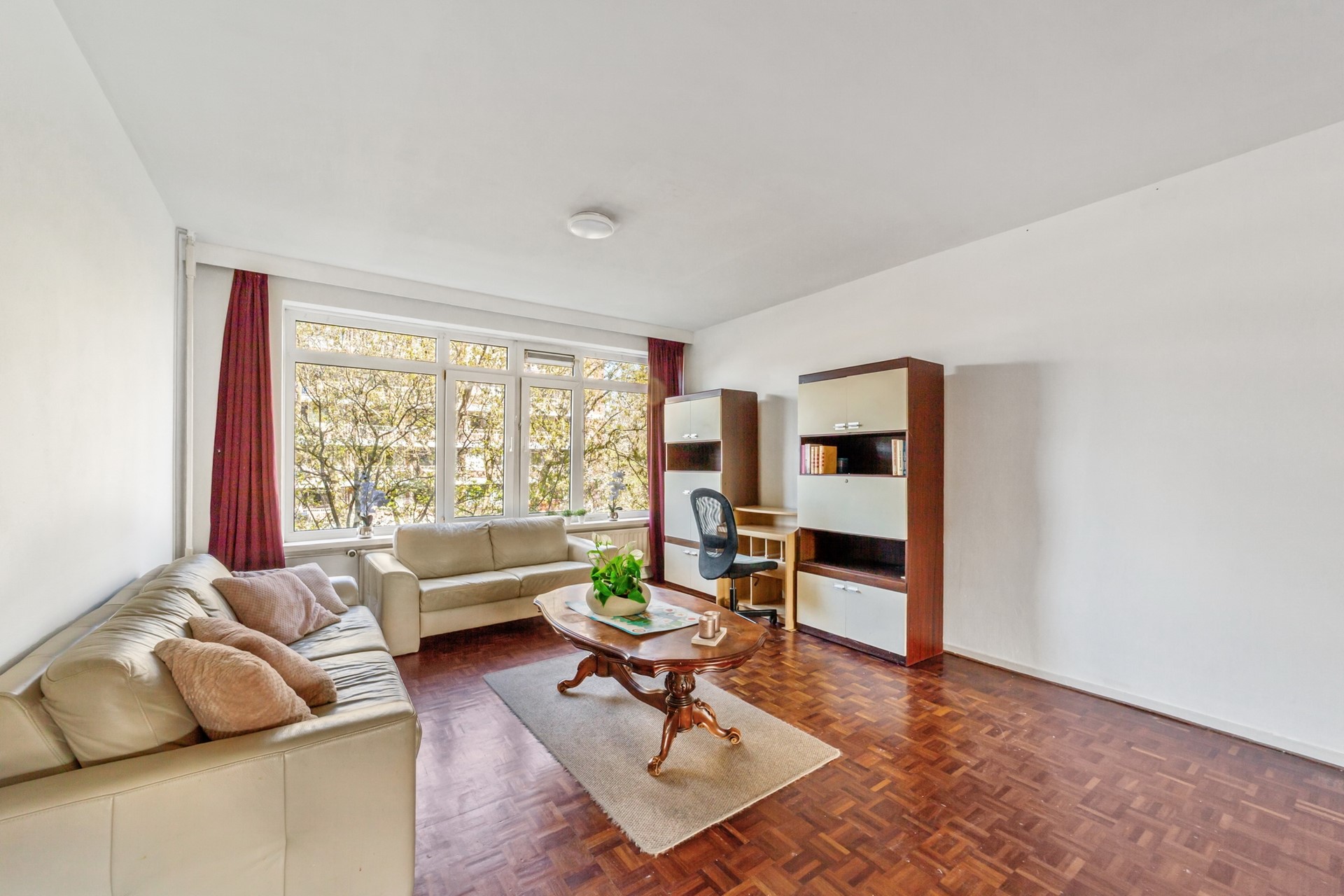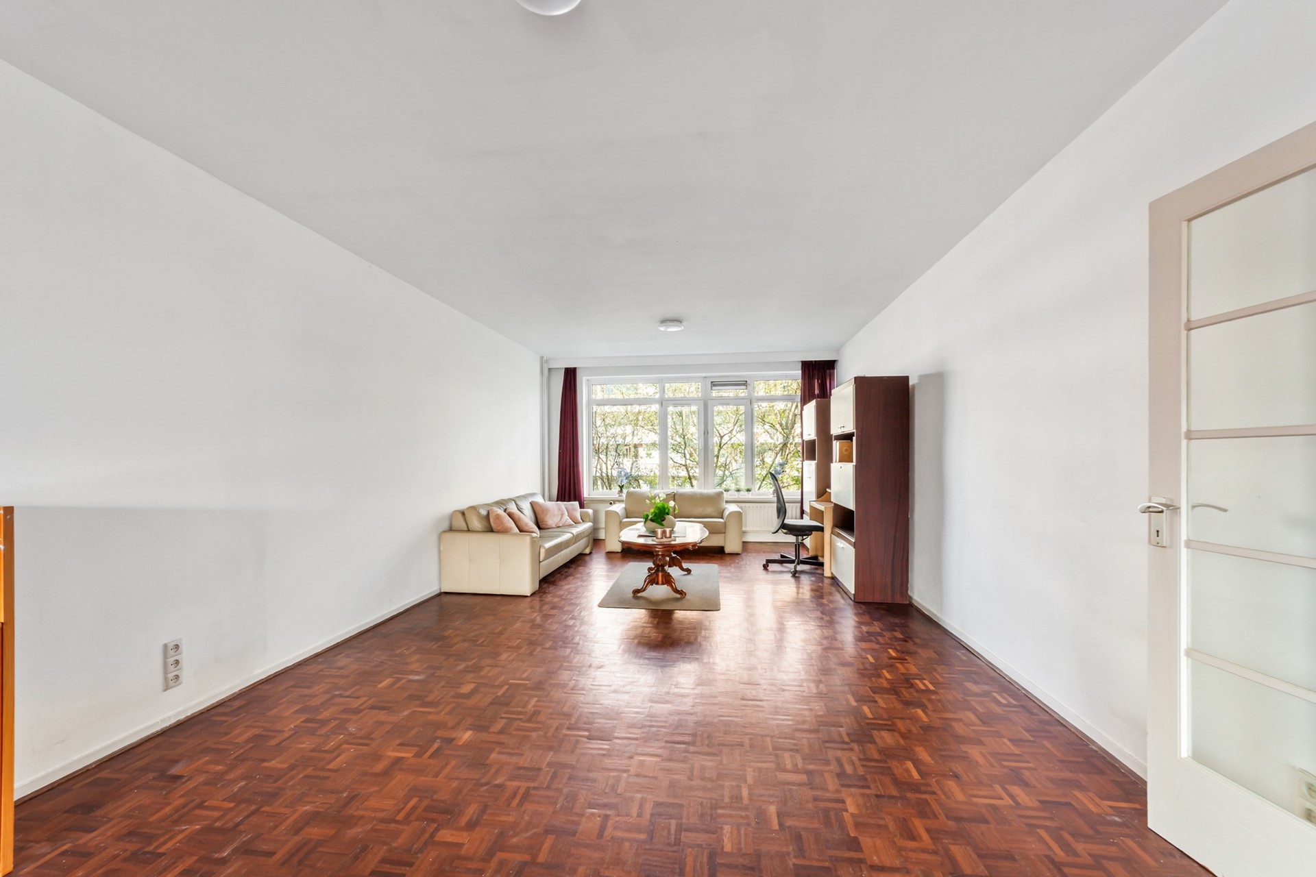 De woonkamer is voor een groot gedeelte voorzien van een parketvloer.