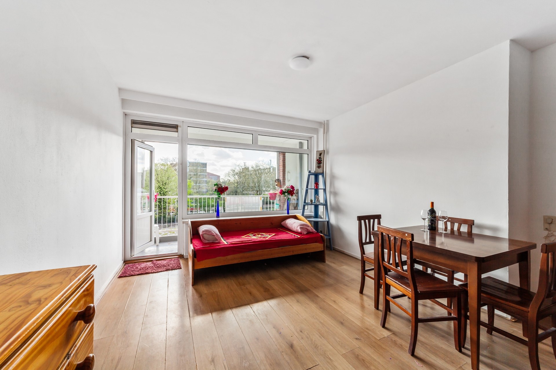 Sfeervolle dubbel openslaande deuren naar de zeer ruime living met inpandig balkon aan de voorzijde.