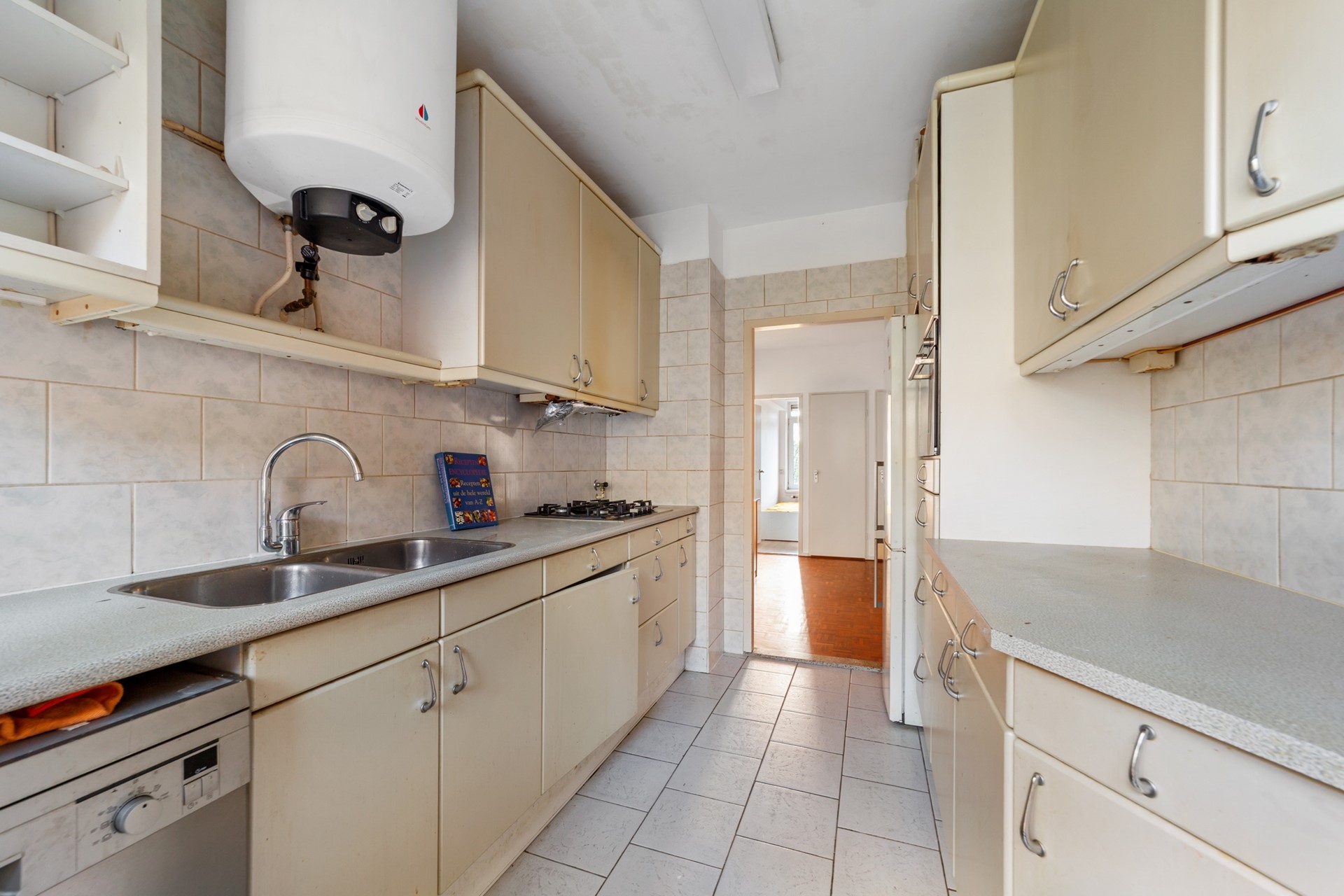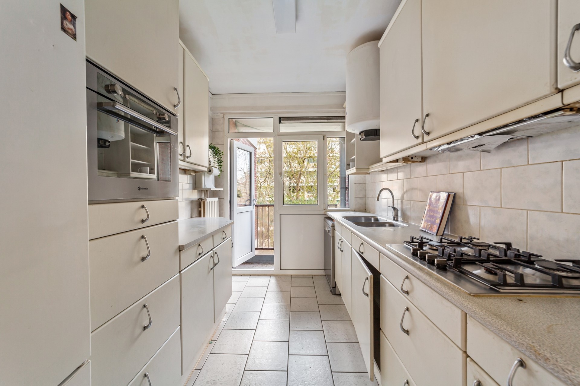 Eenvoudige keuken met deur naar klein balkon aan de achterzijde.