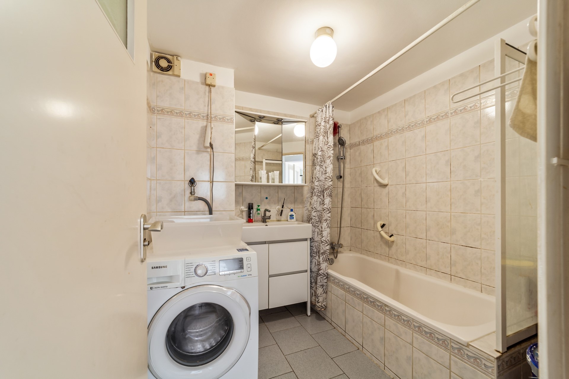 Eenvoudige badkamer met wasmachineaansluiting, bad en wastafel.