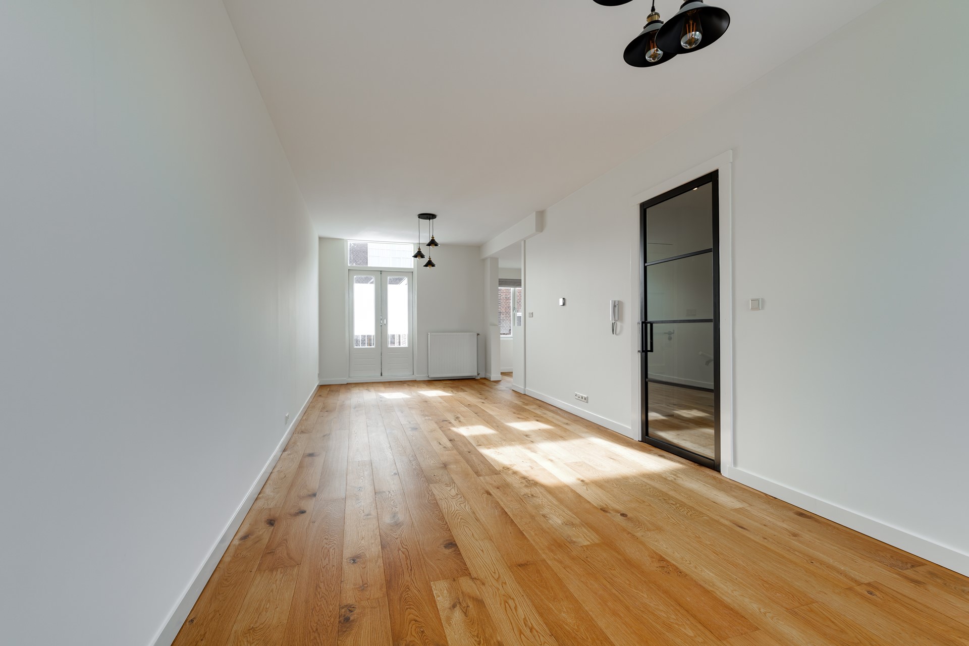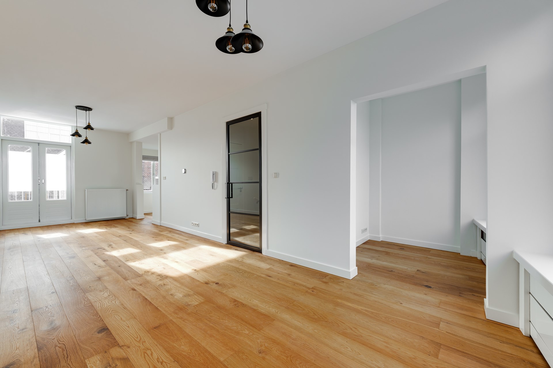 Vanaf het moment dat je binnenkomt voel je direct de ruimte en het licht. De royale woonkamer strekt zich uit over de volledige lengte van de woning en wordt aan de voorzijde gekenmerkt door grote raampartijen met vrij uitzicht over het Newtonplein. Hier kijk je uit over het groen, de speeltuin en het levendige plein – een uitzicht dat ieder seizoen iets bijzonders heeft.