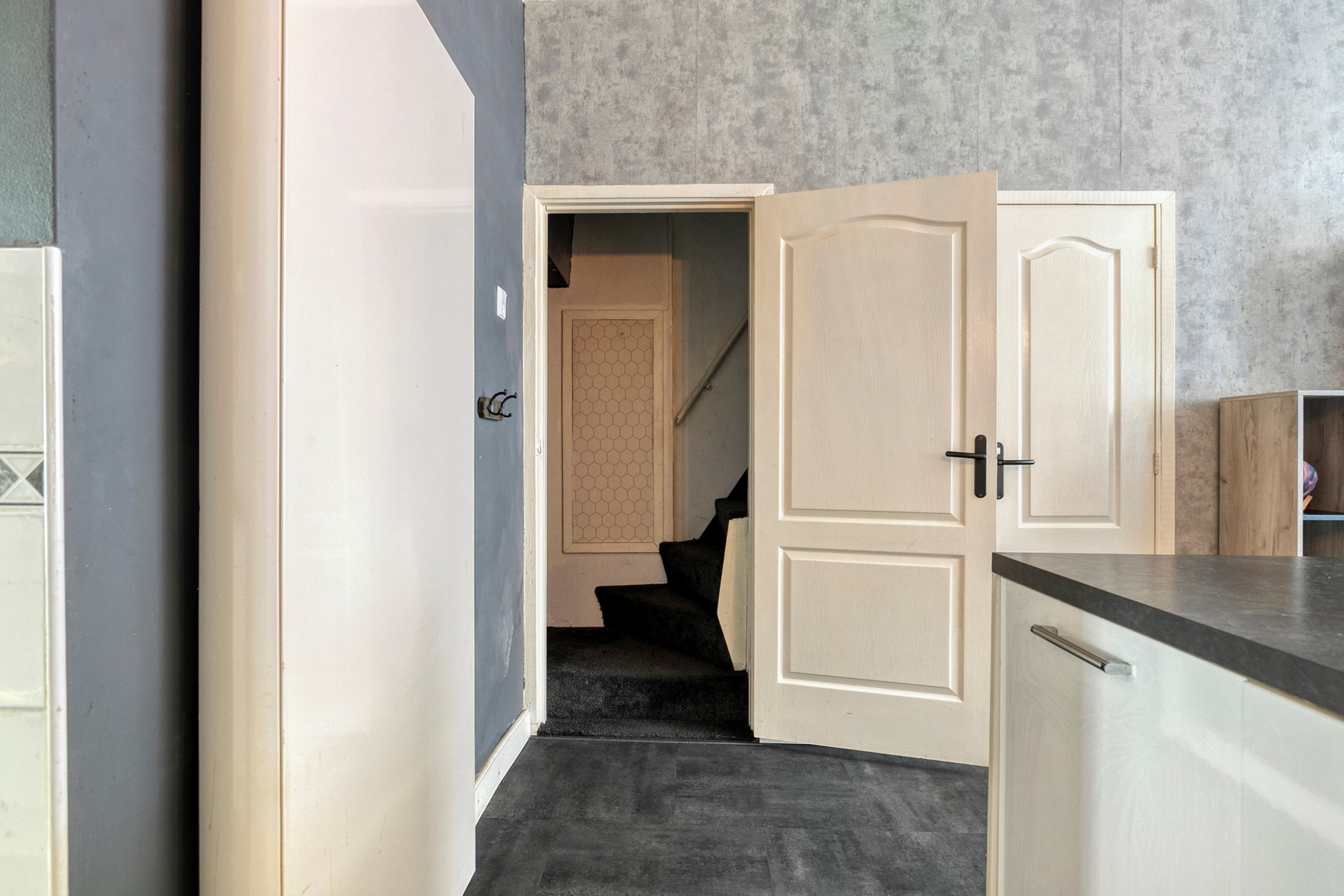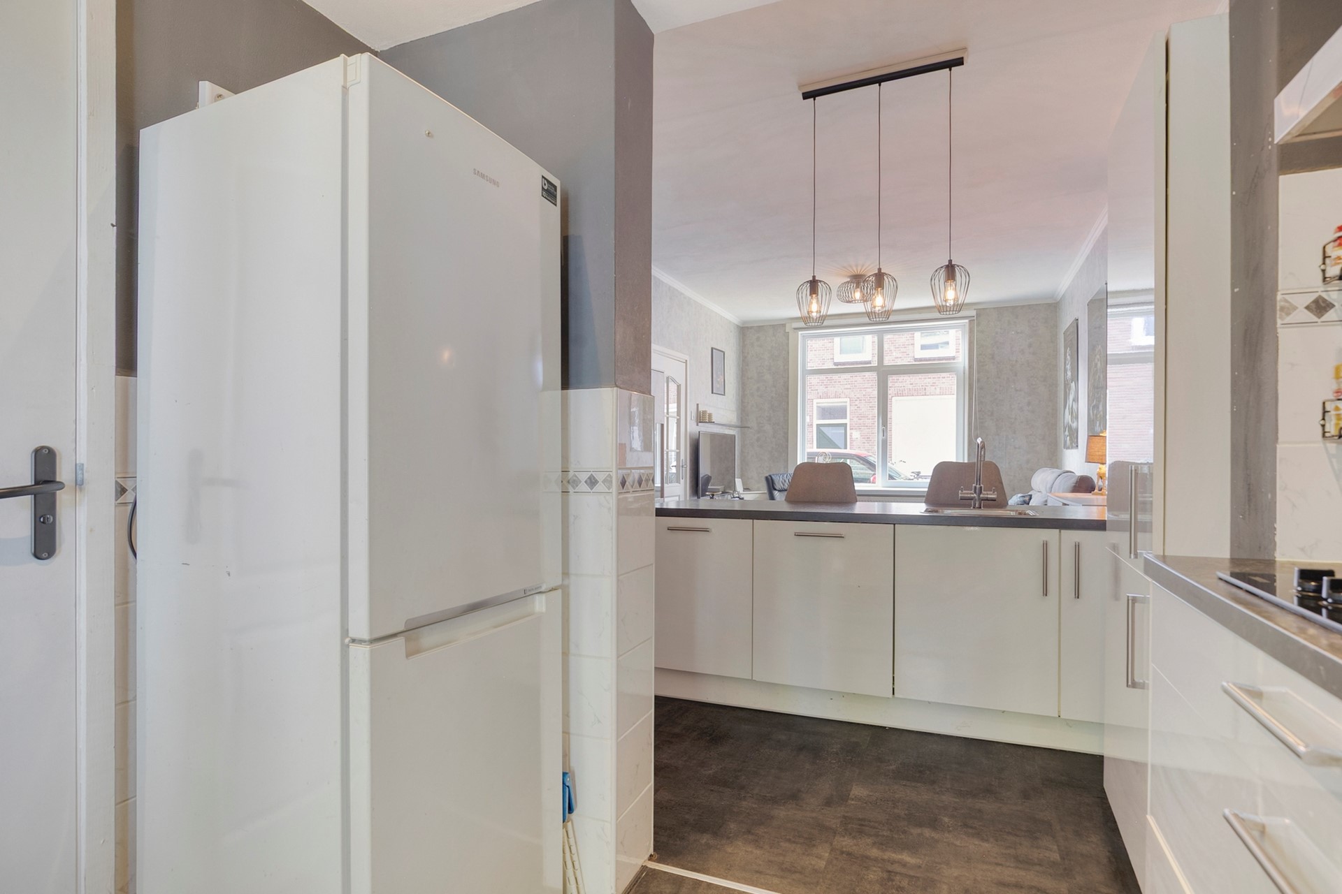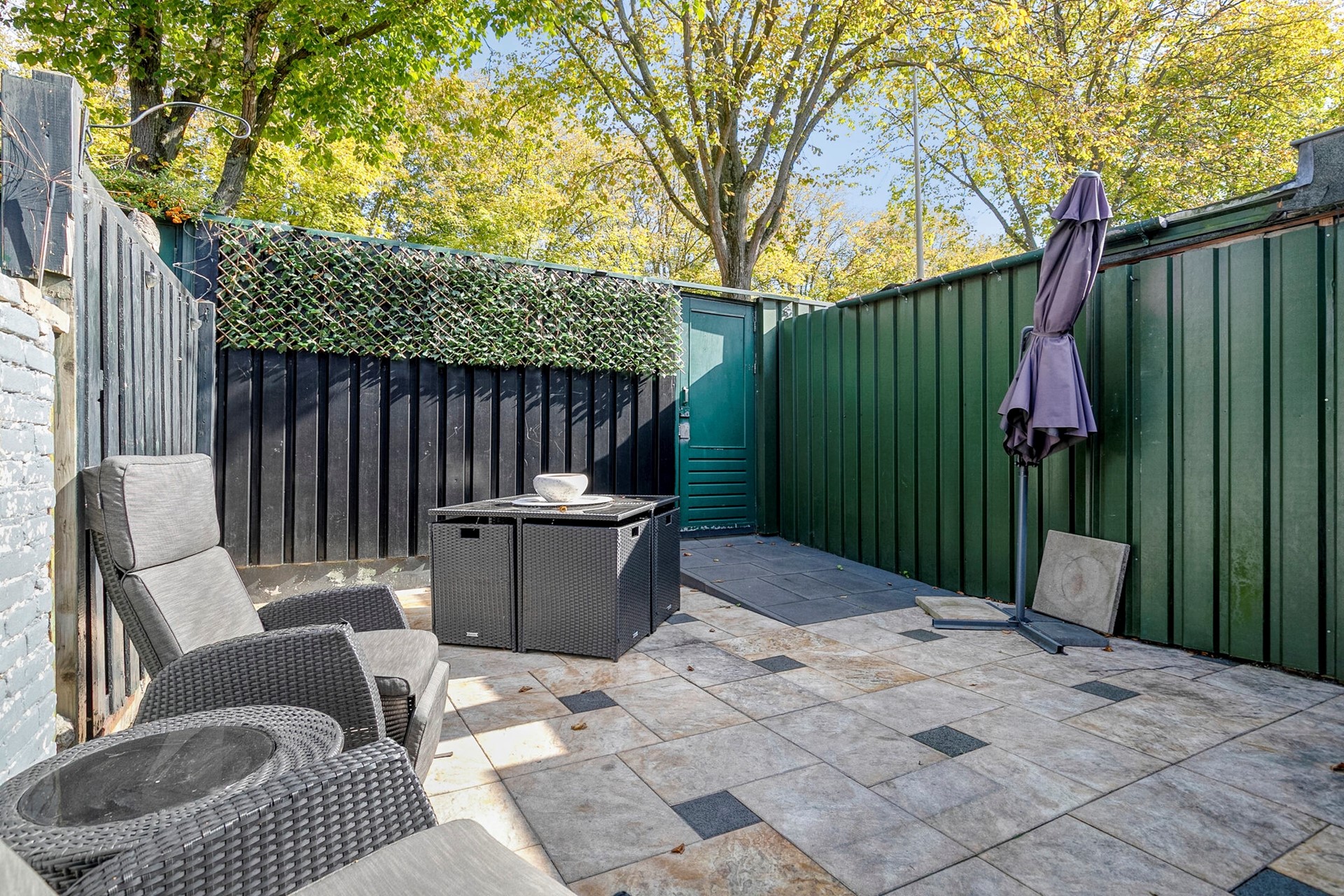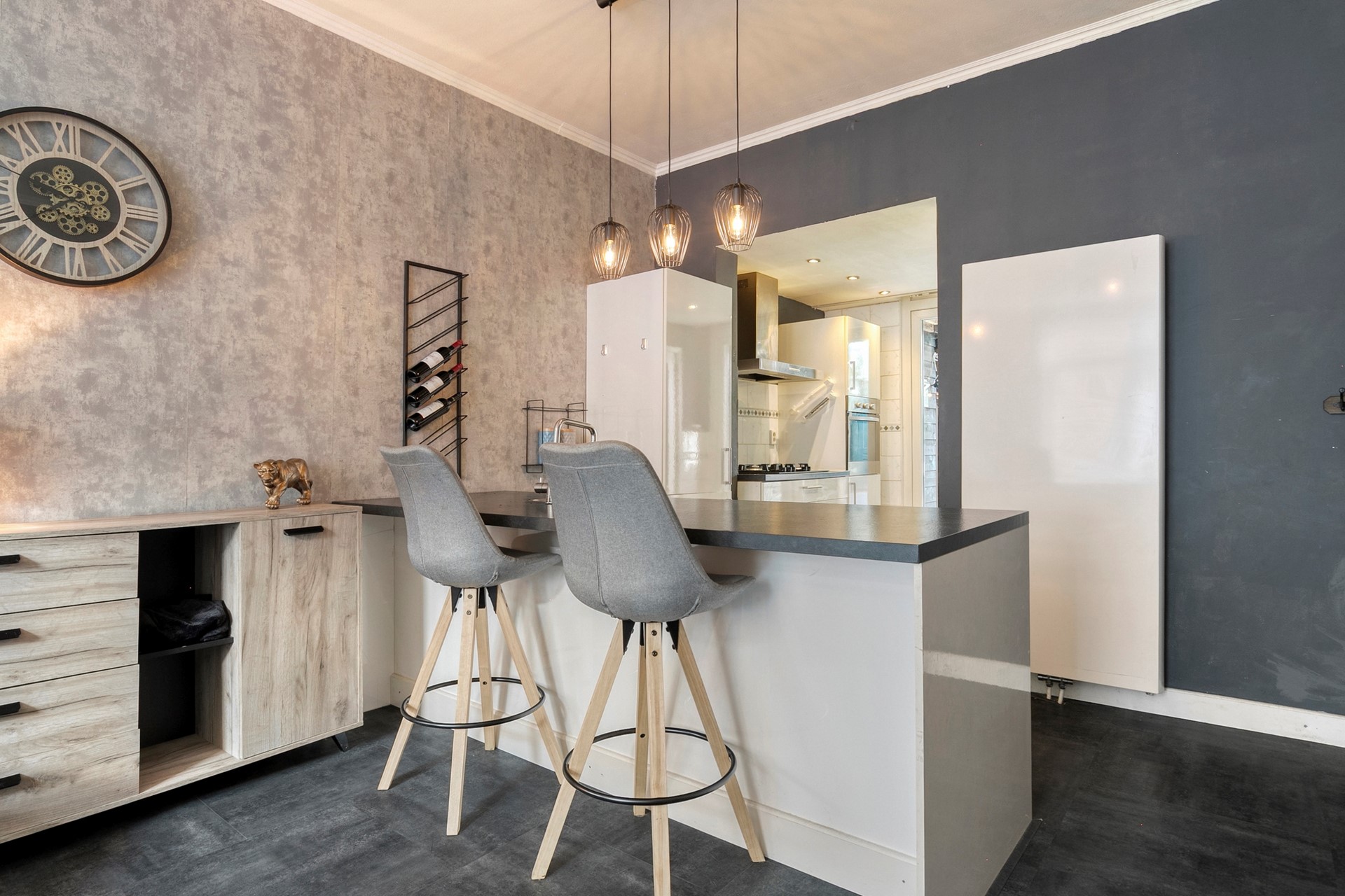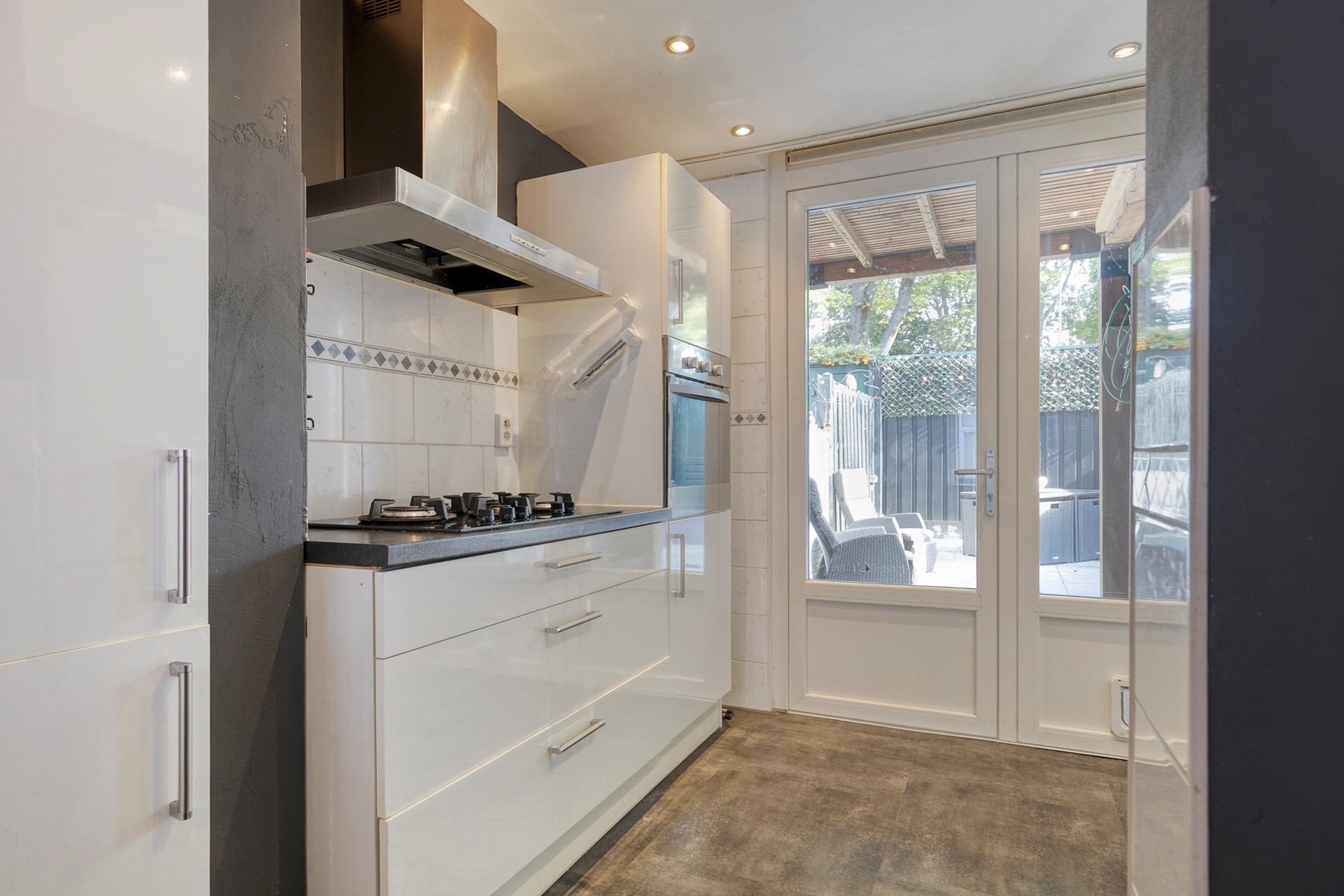 De moderne open keuken vormt het hart van de woning. Deze is uitgevoerd met strakke witte fronten, een donker werkblad en diverse inbouwapparatuur. De keuken beschikt onder andere over een 4-pits gaskookplaat, een geïntegreerde vaatwasser en voldoende bergruimte. Het bargedeelte met zitmogelijkheid maakt het geheel compleet. Via de openslaande deuren heb je toegang tot de achtertuin, gelegen op het oosten, waar tevens een achterom aanwezig is. Hier kunt u vanaf de middaguren tot in de avonduren genieten van het zonnetje.
