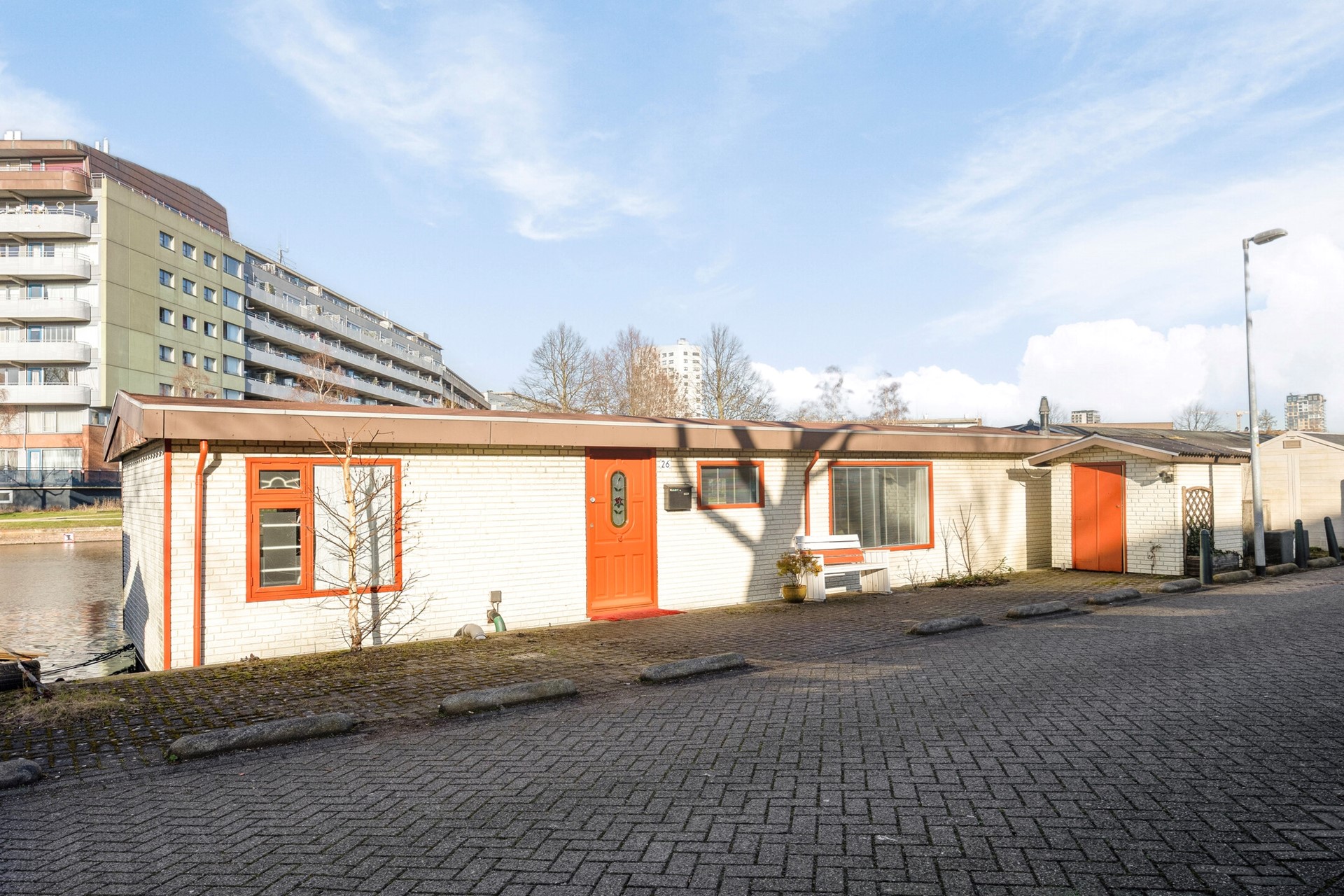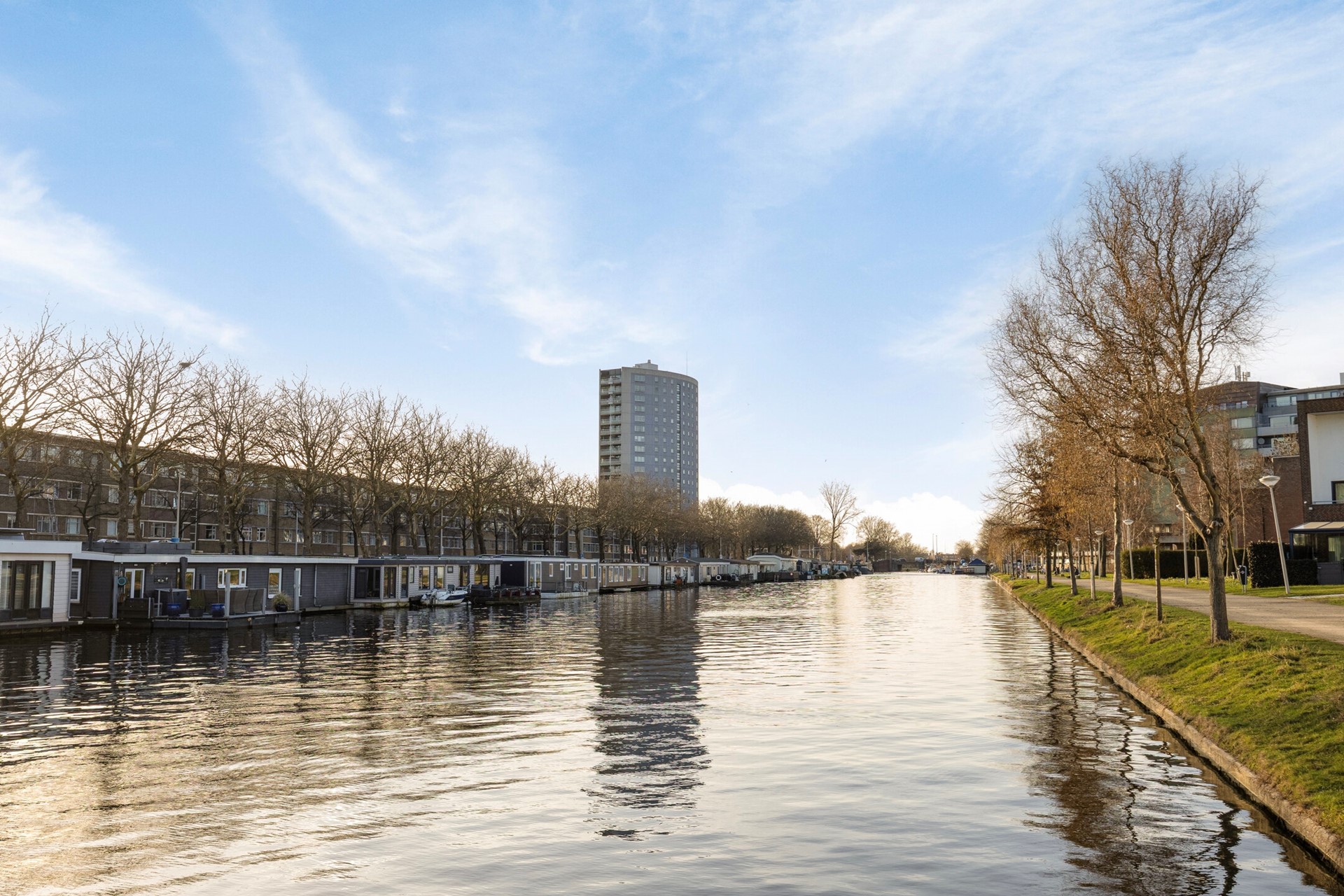 De woonark is gelegen nabij het groene Zuiderpark, een geliefde plek voor wandelen, sporten en ontspanning. Het centrum van Den Haag bereik je binnen een kwartiertje fietsen, en ook het openbaar vervoer en treinstation Holland Spoor liggen op korte afstand. Zo combineer je rustig wonen met de levendigheid en voorzieningen van de stad binnen handbereik.
